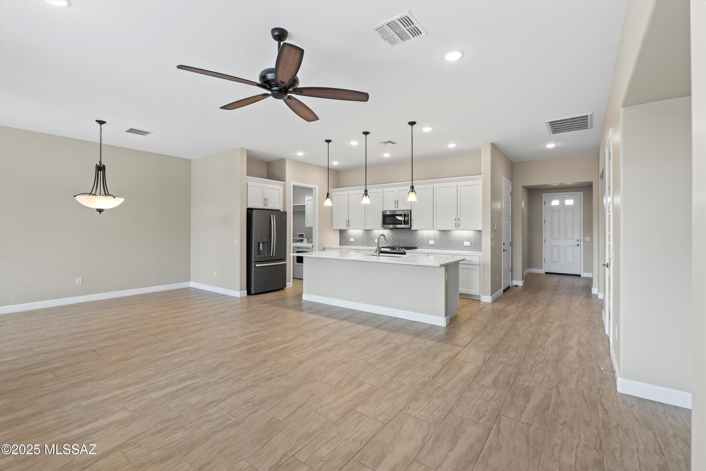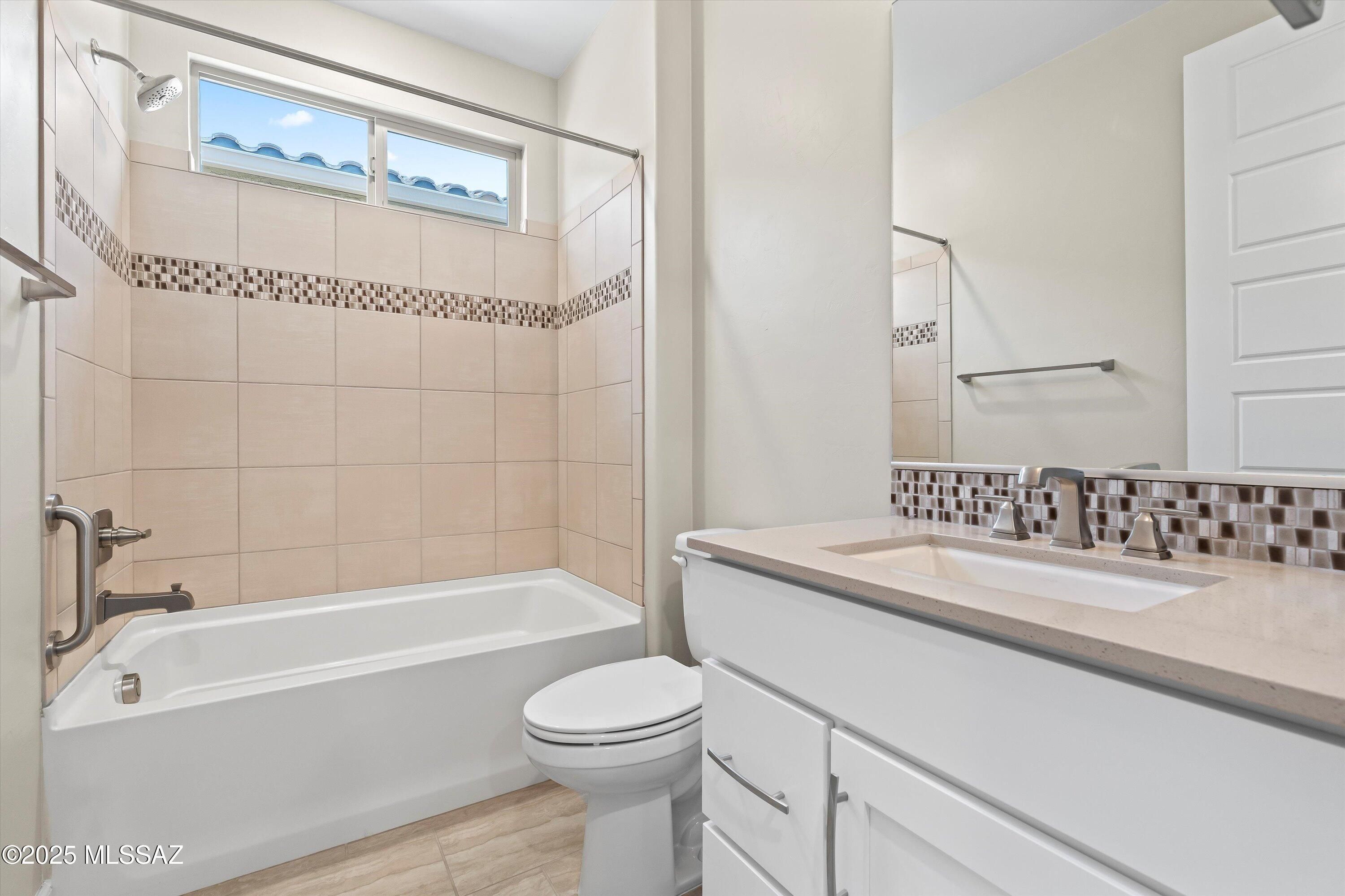 TURNKEY READY 2019-built VIVA villa in SaddleBrooke's highly sought-after Unit 50. South facing mountain views in this like-new villa. Inside, the open floor plan, contemporary finishes make this home ideal for a downsizing resident, winter getaway or investment property. Stone-look ceramic tile thoughout (bedrooms have carpet),white cabinetry and quartz countertops offer a bold, elegant aesthetic. Designer kitchen features upgraded cabinetry w/pullouts, quartz counters, deep undermount sink and a generous island overlooks open great room. Private owner's suite spa-like bathroom with fabulous walk-in shower, linen & walk-in closets. Popular Viva floorplan features the most spacious patio in community, upgraded with full-extension pavers. New epoxy floor in garage and paint in the interior