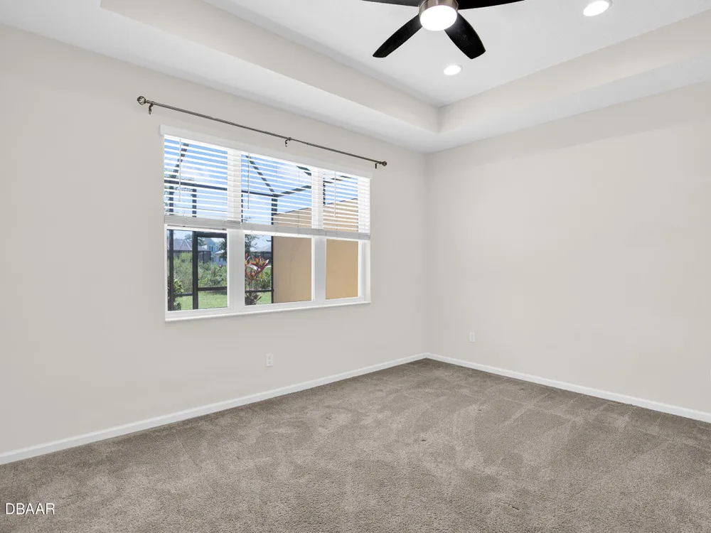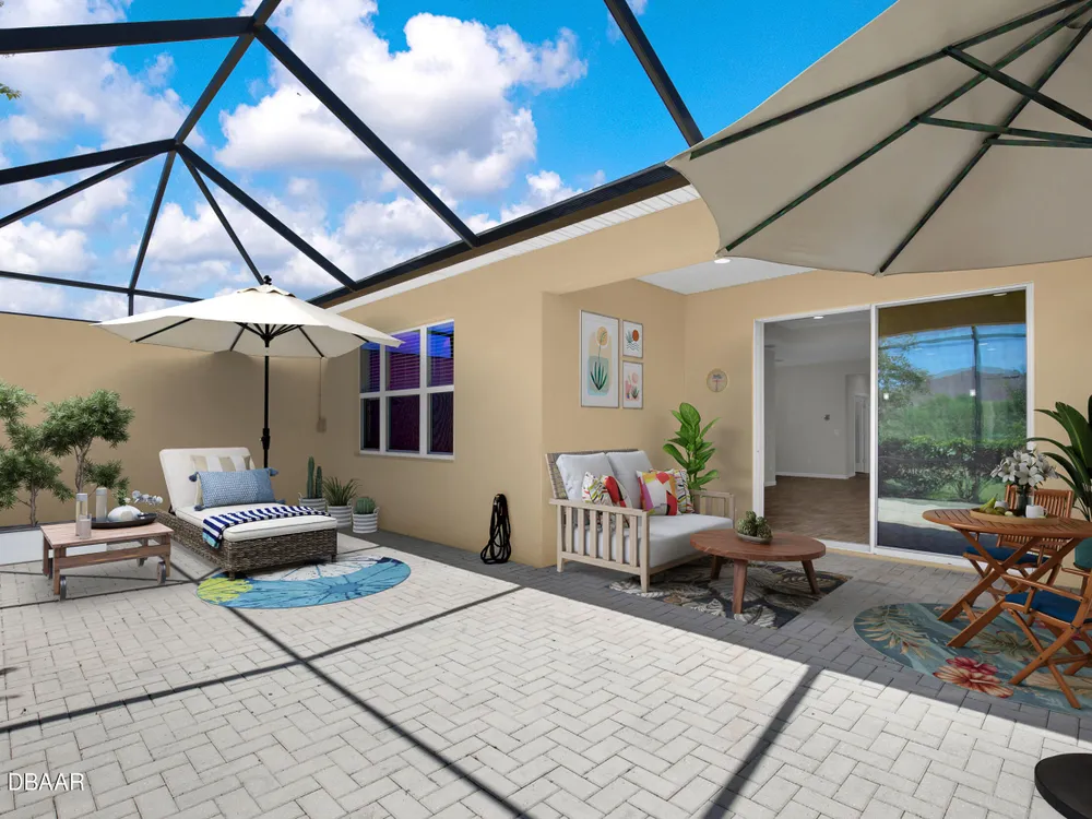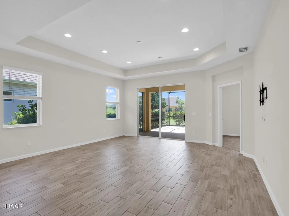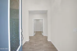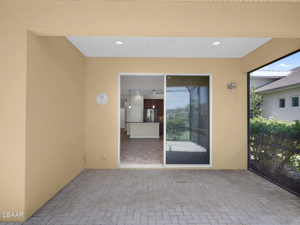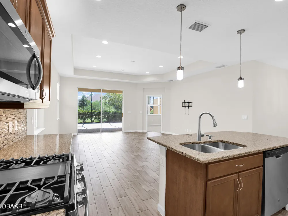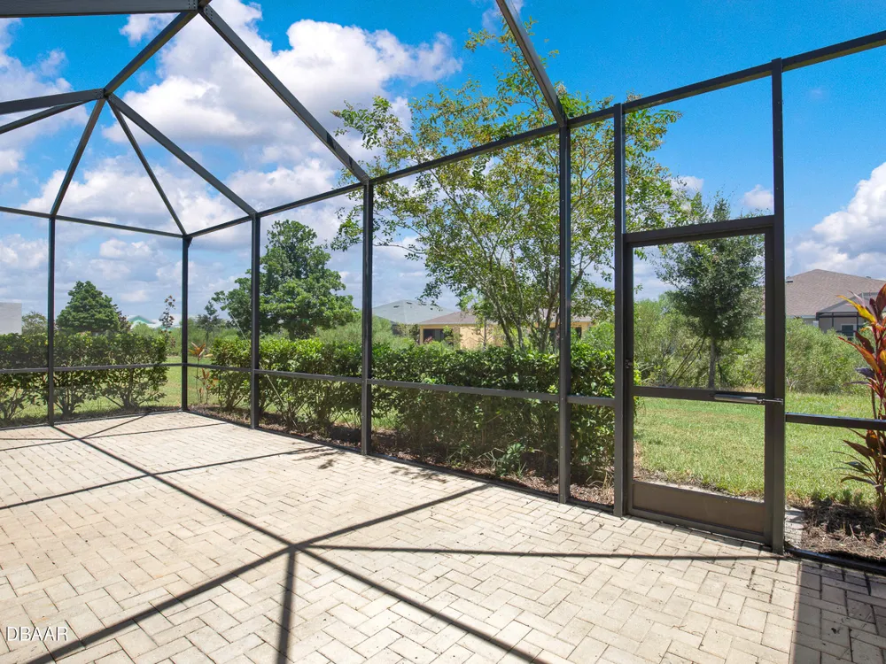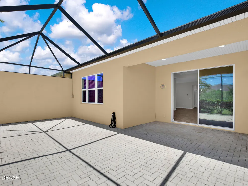 You'll love this sought-after Caicos Villa in Latitude Margaritaville! A spacious open floor plan featuring 2 bedrooms, 2 full bathrooms, den, and a large welcoming foyer. The kitchen features stainless steel appliances with 42'' soft-close cabinets and pull-out drawers, a gas range, custom backsplash, and granite countertops with a 60/40 split sink with tilt out storage drawer. Beautiful wood-look plank tile throughout the common areas, den, and laundry room. Both bedrooms feature upgraded carpet and padding. Custom flooring and frameless shower enclosure in the ensuite primary bathroom which also features granite countertops and plenty of storage. The second bathroom features a full tub with shower and granite countertop. Enjoy your Florida lifestyle on the extended screened in patio which is wired and ready for your new hot tub. Community amenities include dog park, fully outfitted Gym, resort-style pool, Town Square. Private beach club with shuttle.