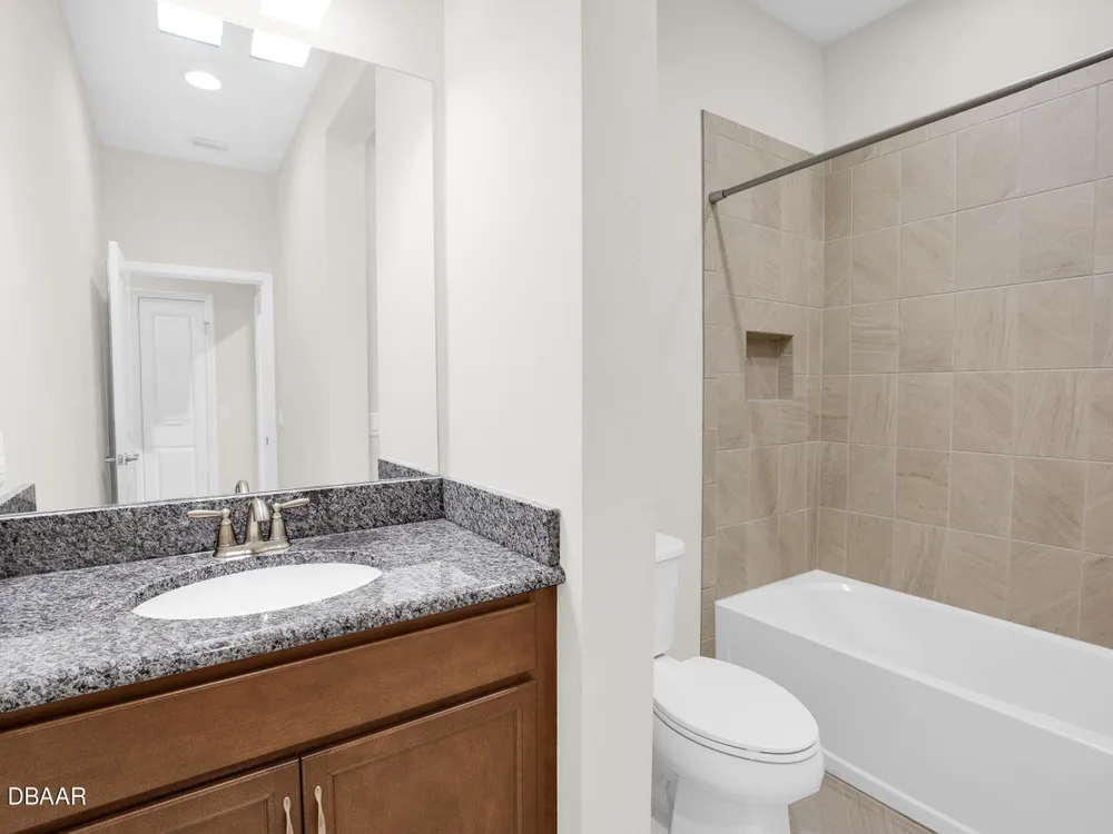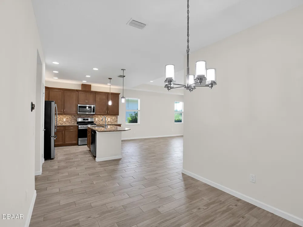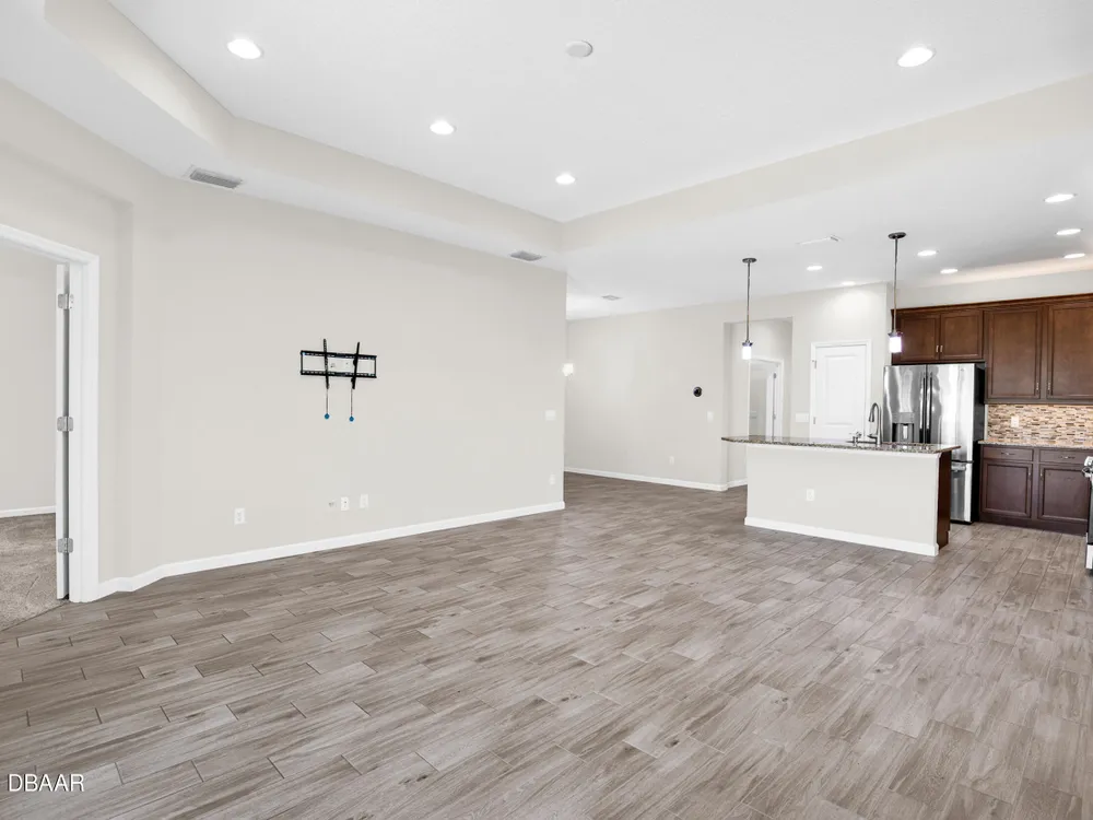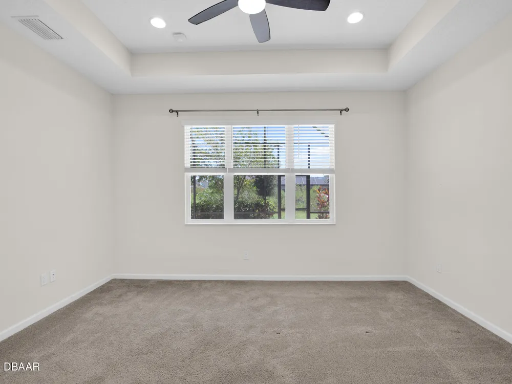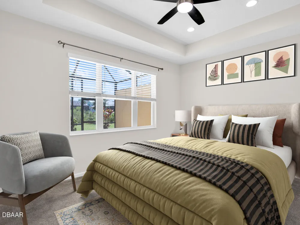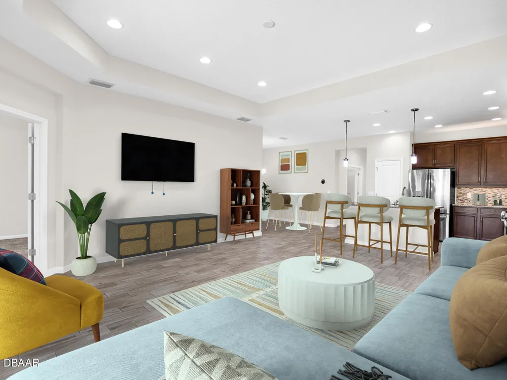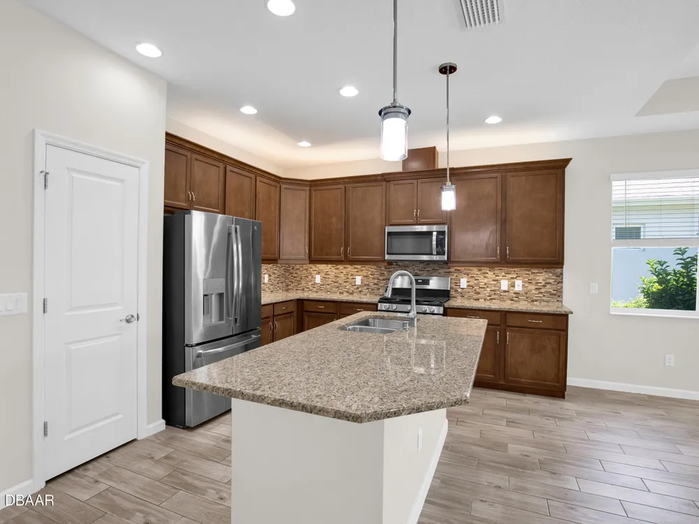 You'll love this sought-after Caicos Villa in Latitude Margaritaville! A spacious open floor plan featuring 2 bedrooms, 2 full bathrooms, den, and a large welcoming foyer. The kitchen features stainless steel appliances with 42'' soft-close cabinets and pull-out drawers, a gas range, custom backsplash, and granite countertops with a 60/40 split sink with tilt out storage drawer. Beautiful wood-look plank tile throughout the common areas, den, and laundry room. Both bedrooms feature upgraded carpet and padding. Custom flooring and frameless shower enclosure in the ensuite primary bathroom which also features granite countertops and plenty of storage. The second bathroom features a full tub with shower and granite countertop. Enjoy your Florida lifestyle on the extended screened in patio which is wired and ready for your new hot tub. Community amenities include dog park, fully outfitted Gym, resort-style pool, Town Square. Private beach club with shuttle.