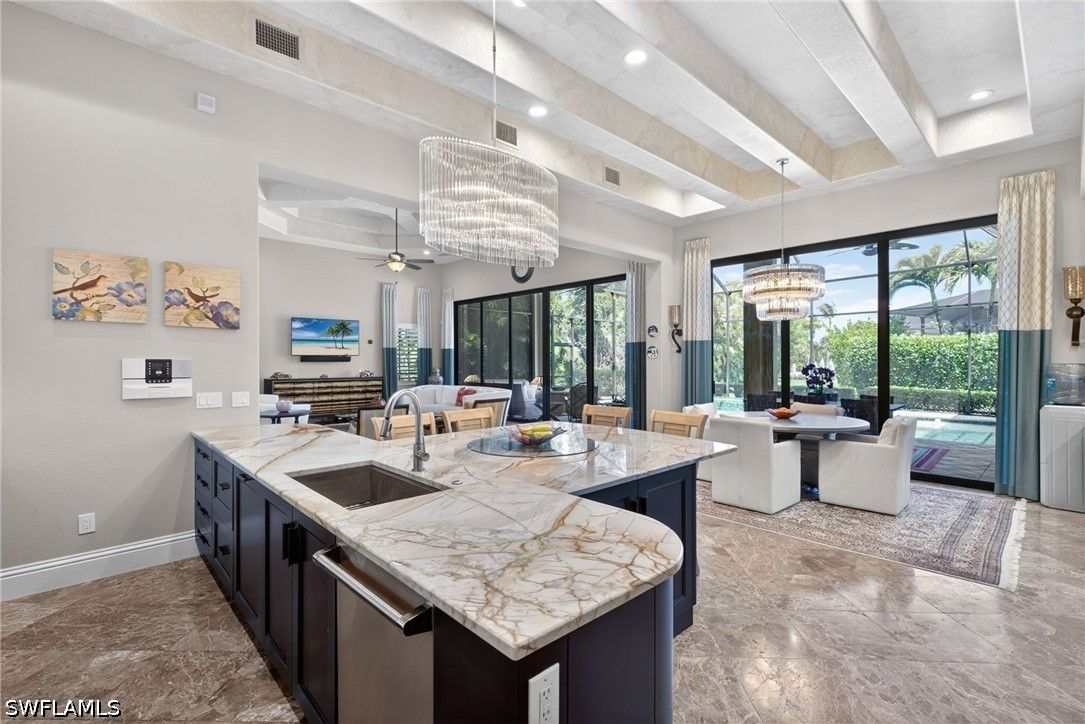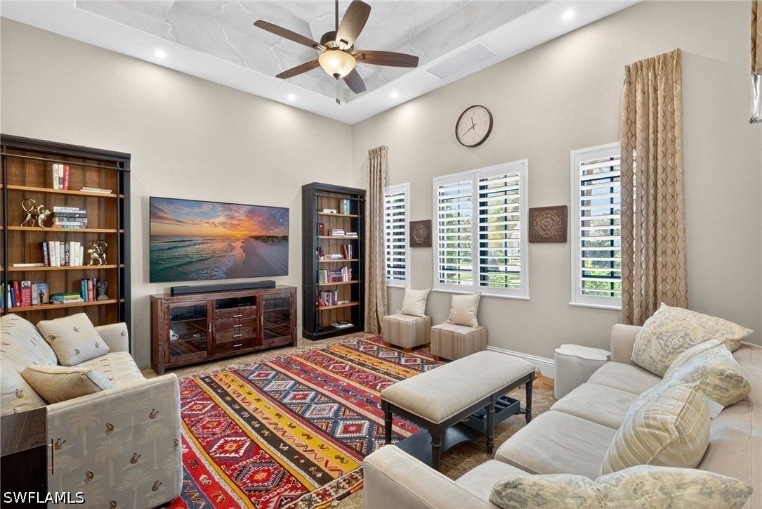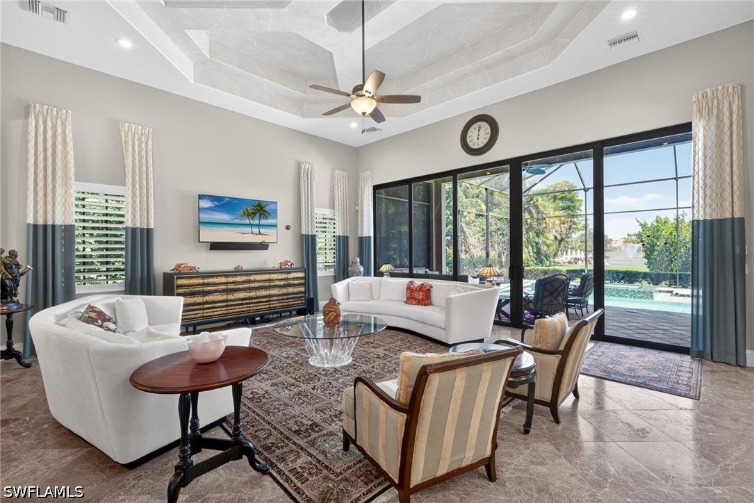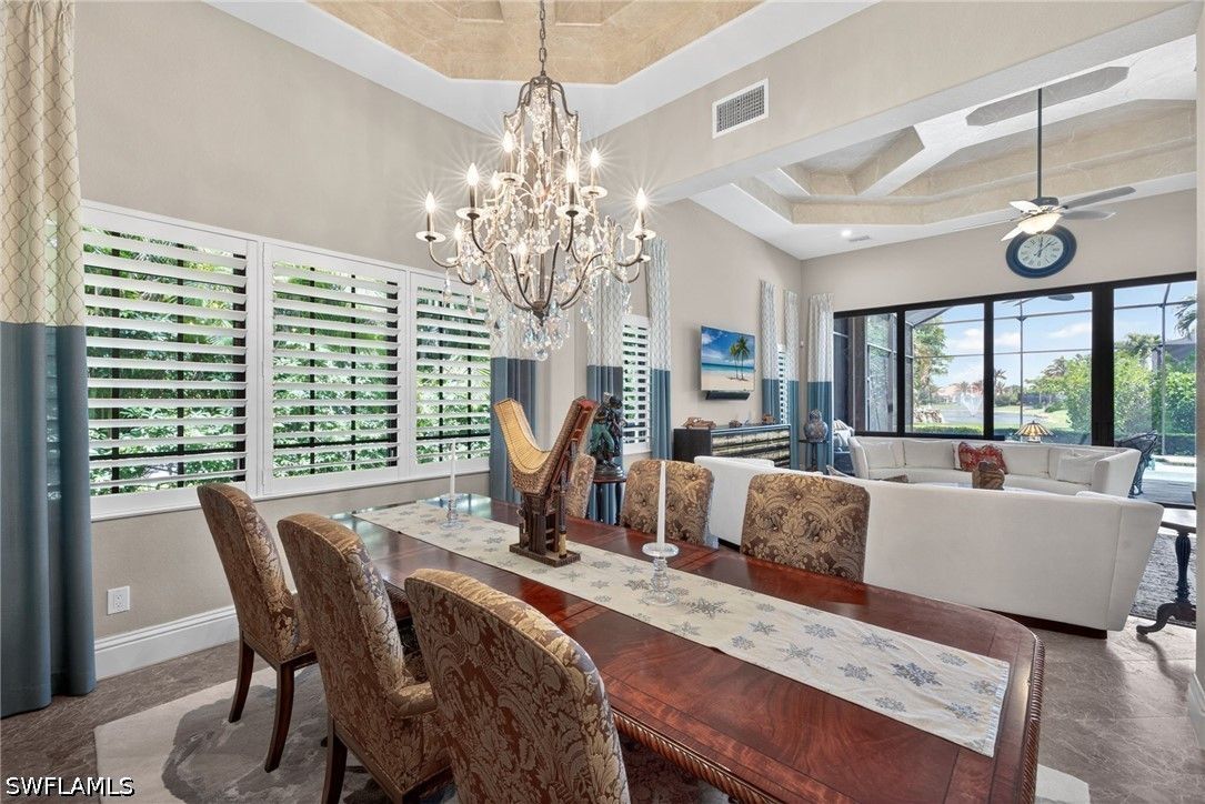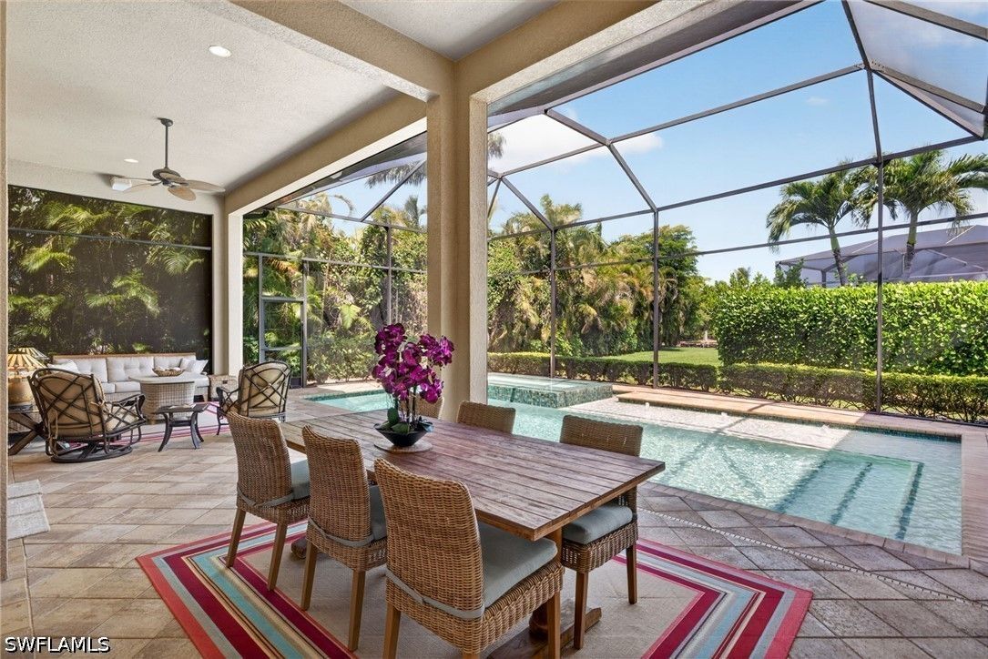 Tucked away at the end of a quiet, private street, this exceptional residence—constructed in 2015—offers more than 4,300 square feet of beautifully curated living space designed for both comfort and sophistication. From the moment you step inside, soaring ceilings with intricate architectural detail create an immediate sense of openness and elegance. The thoughtfully designed layout includes four spacious bedrooms, each with its own private bath, along with a versatile den ideal for a home office or additional living space. A dedicated dining room provides the perfect backdrop for formal entertaining, while the expansive kitchen seamlessly connects to the main living area, featuring updated appliances, abundant workspace, and a generously sized walk-in pantry. Outdoor living is equally impressive, with a screened-in lanai that serves as a true extension of the home. Complete with a fully equipped summer kitchen, it’s perfectly suited for entertaining or relaxed evenings poolside. The resort-style pool and spa are surrounded by lush, mature landscaping, creating a peaceful and private setting. Additional features include a whole-home generator, a three-car garage, and a circular driveway that enhances both convenience and curb appeal. The split-bedroom design ensures privacy, with the primary suite positioned as a secluded retreat. Located within the intimate enclave of Venezia Grande—an exclusive section of Vineyards with fewer than 25 homes—residents enjoy the rare benefit of a gated neighborhood tucked within a larger gated community, offering an added layer of security and exclusivity.