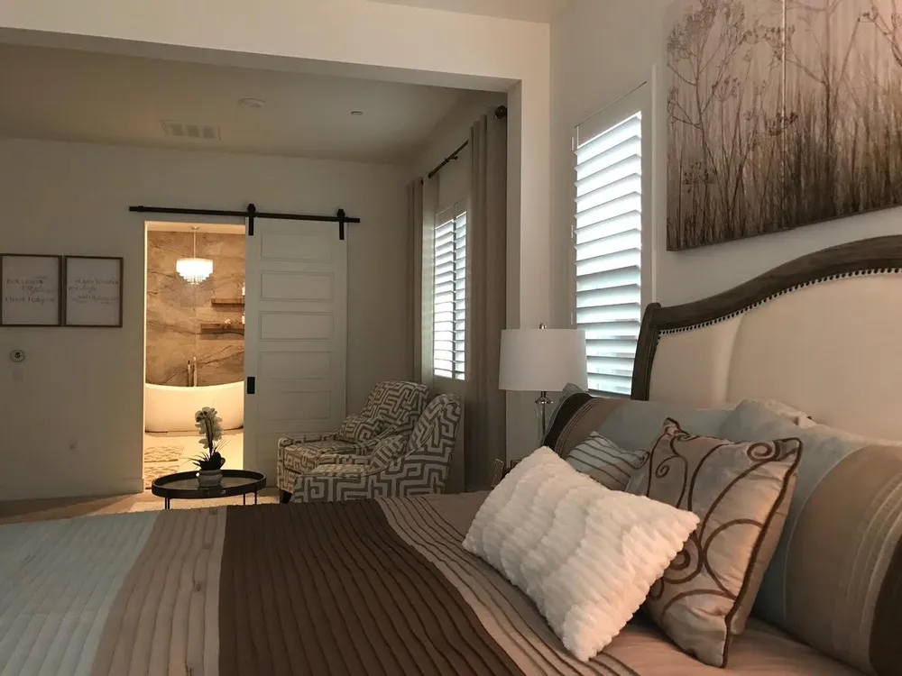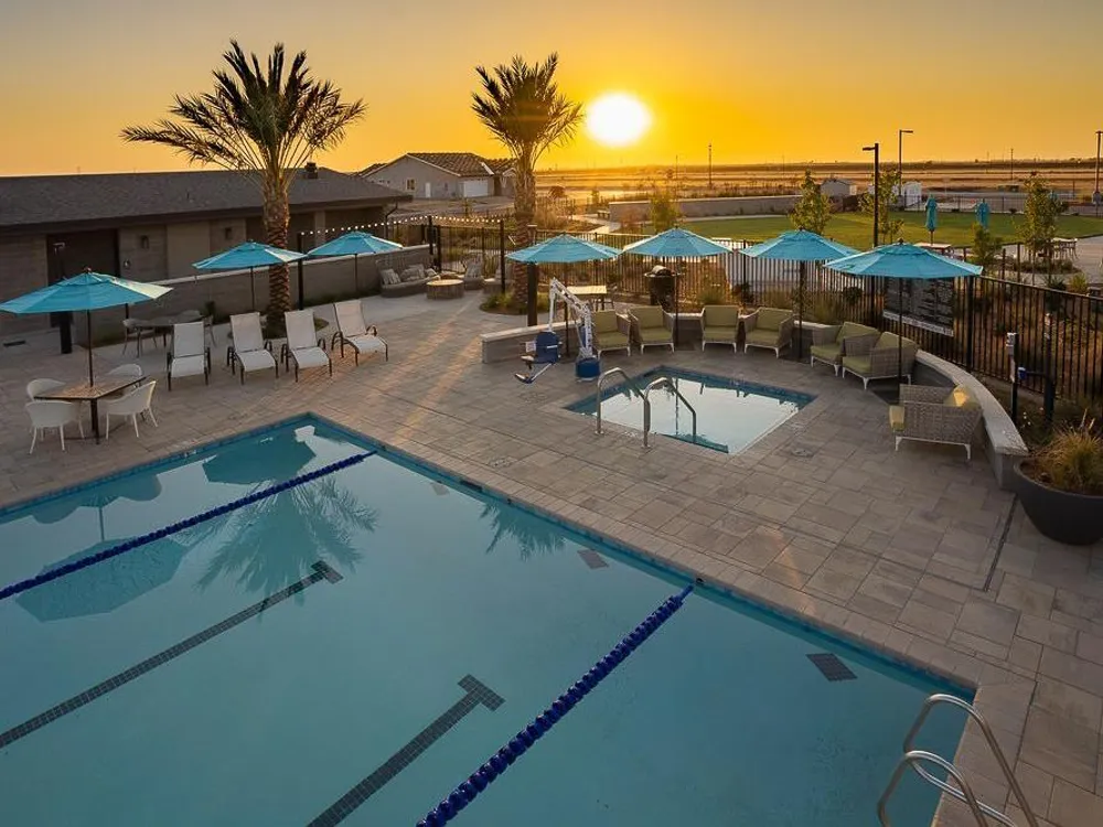 Absolutely stunning! Beautiful 3 bedroom, 3.5 bath single story home located in Lennar's Heritage Solaire prestigious 55+ community. Built by Lennar but upgraded by designer owner. Featuring plantation shutters, Quartzite countertops,custom lighting throughout, jetted tub in masterbath, custom oversized office door, surround sound and tumbled travertine stone accent wall in the family room. Backyard completed with enlarged patios and walkways, BBQ pad with cover. Master bedroom includes retreat, dual showers, huge walk-in clostet with custom cabinets, outside access and plantation shutters. Solar is owned. Heritage Solaire's gated Active Adult community amenities include clubhouse with meeting rooms, kitchen and wine storage, fitness center, tennis, pickle & bocce ball courts, pool, and amphitheater. This is a great place to live!