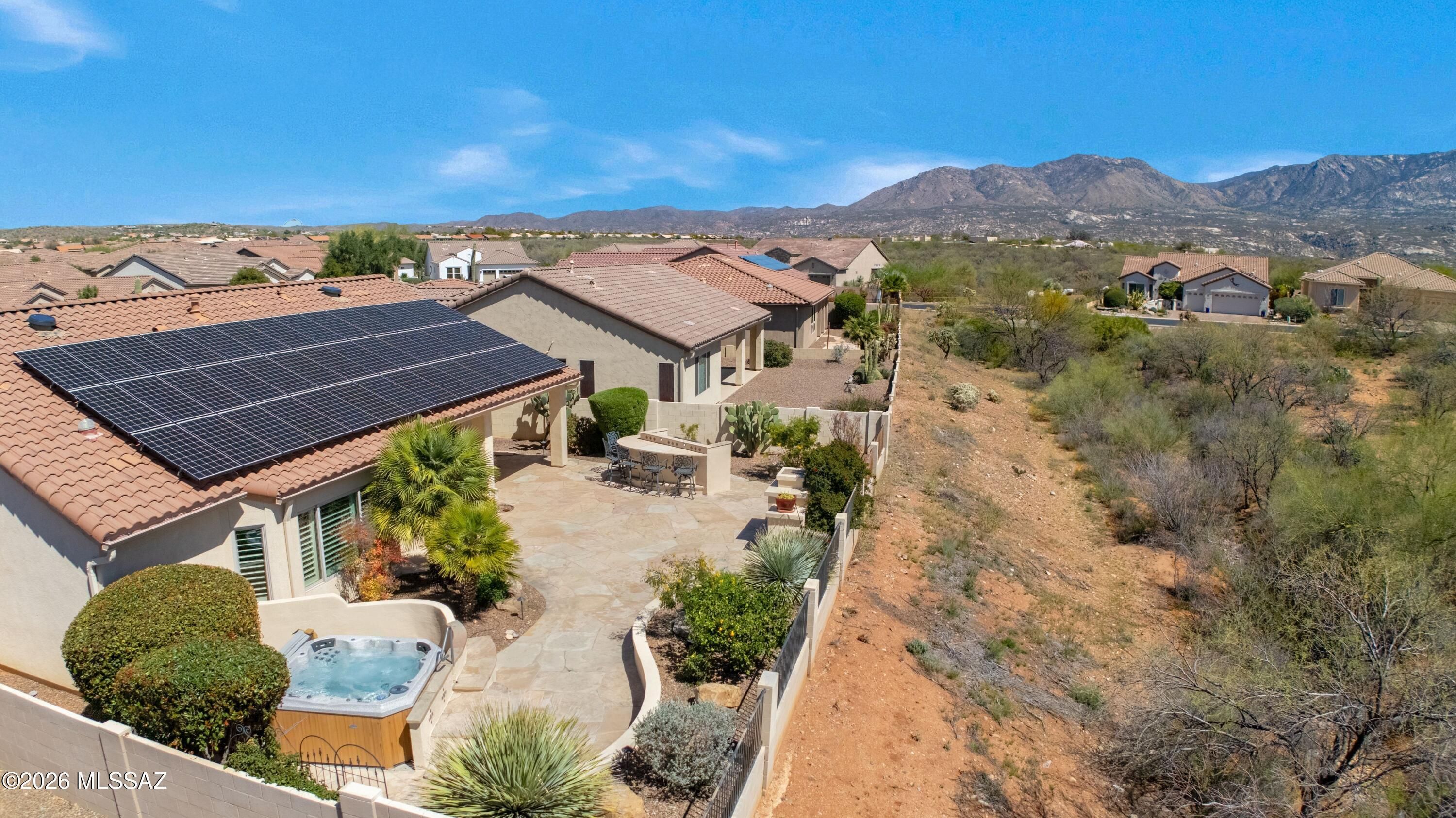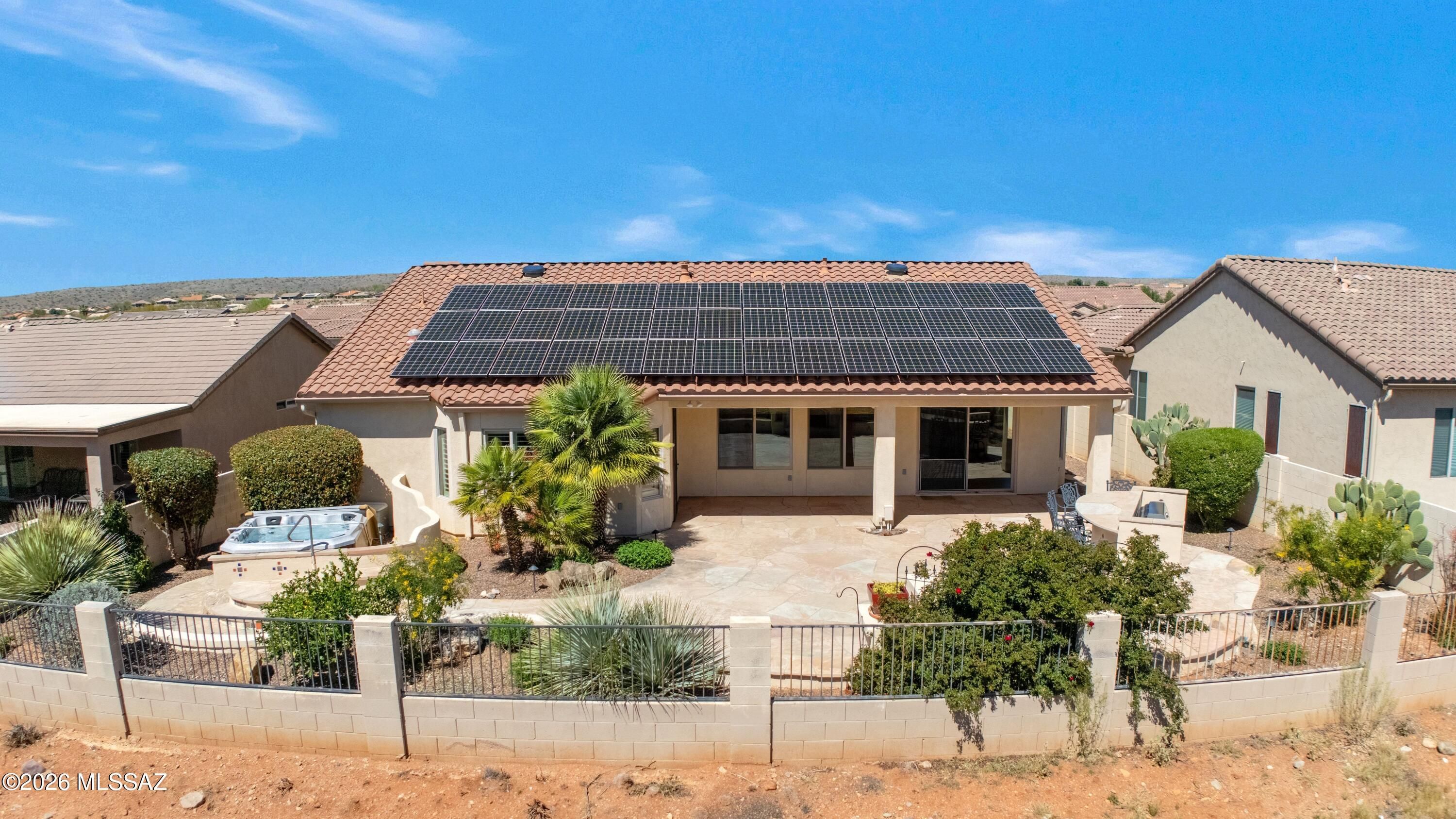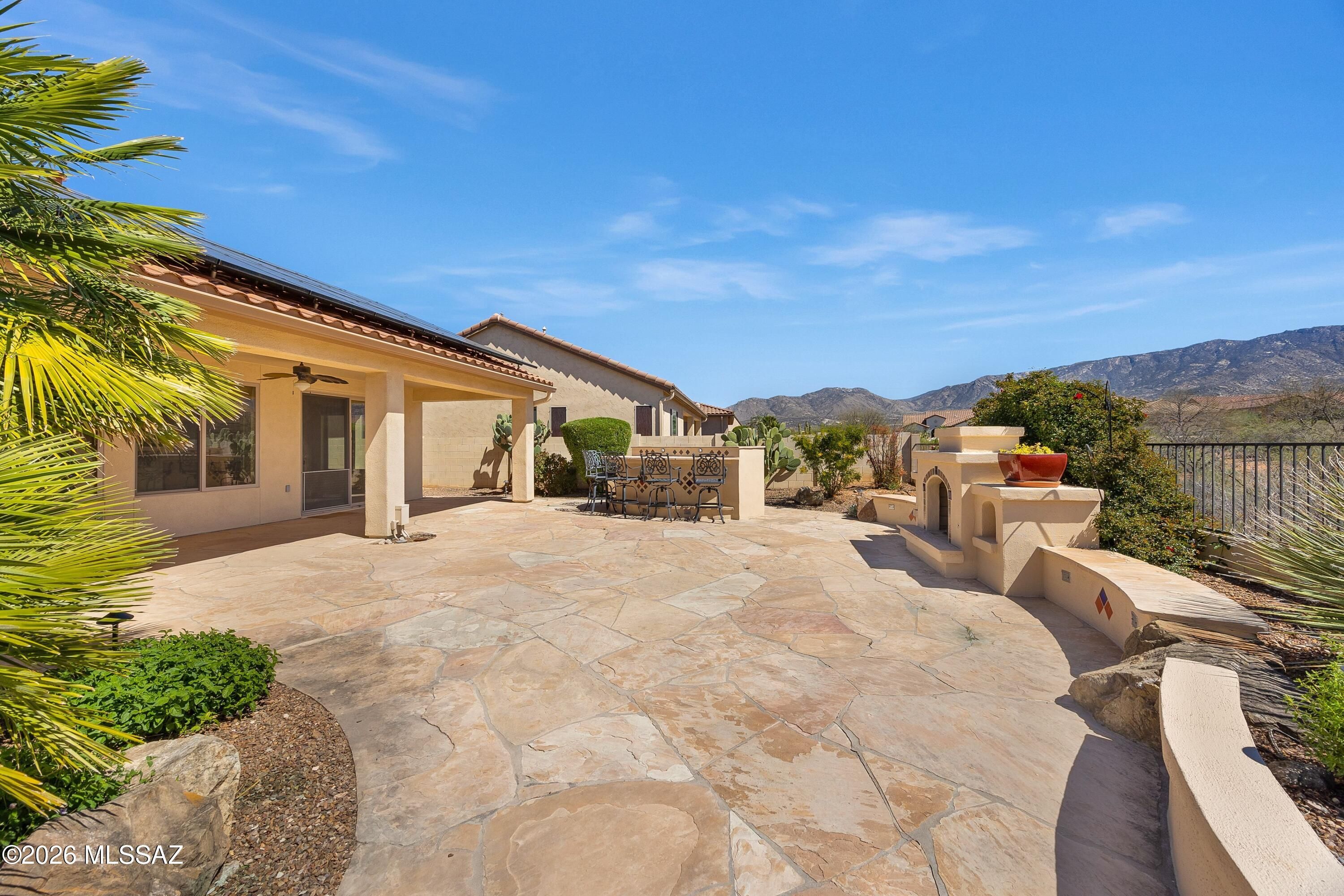 Talavera with Guest House, Owned Solar & Mountain Views! Great curb appeal with cactus fountain & inviting entry. Great room with gas fireplace & dining area with patio slider. Kitchen has quartz counters, gas cooktop, stainless appliances, knotty alder cabinets, & wine cooler. Powder room for guests. Owner's suite has patio door. Ensuite bath has soaking tub, walk-in shower, & walk-in closet. Den with French doors & custom built-in office system. Guest bedroom has closet & nearby bath. Tile flooring thru-out & 4 solar tubes. Laundry room with W/D, sink & cabinets. Guest house with Murphy bed system, closet, & bath with walk-in shower. Extended 3-car garage with 2019 W/H, sink, & side door. Covered flagstone patio with BBQ station, hot tub, gated yard, lovely landscaping, & mountain views!