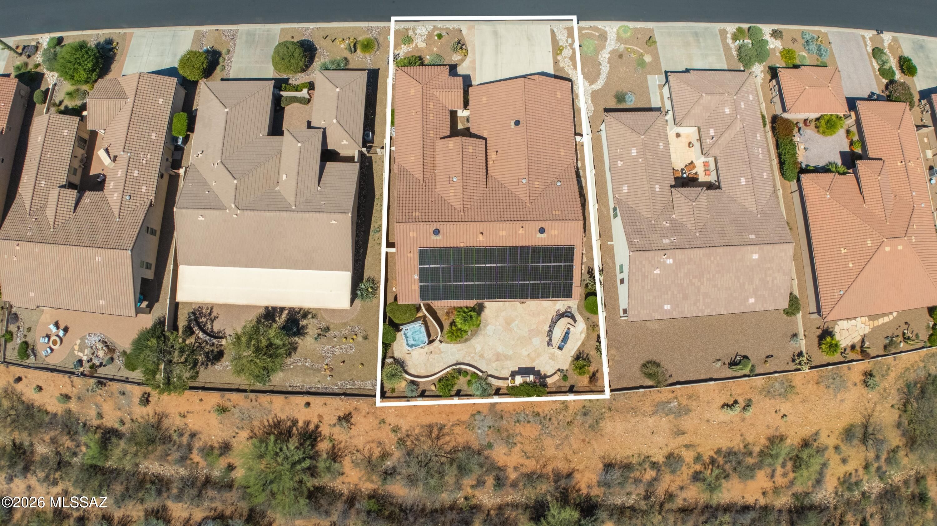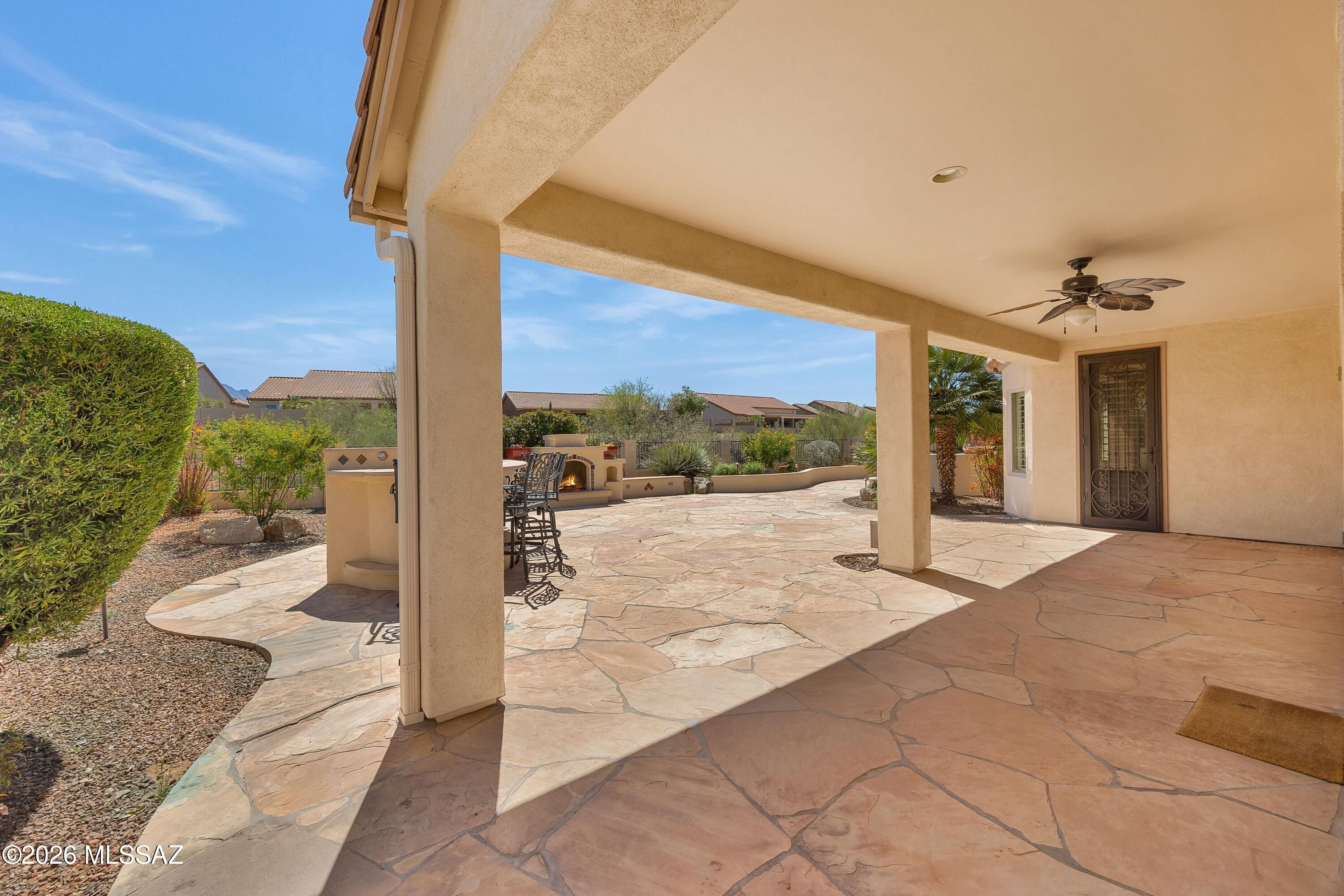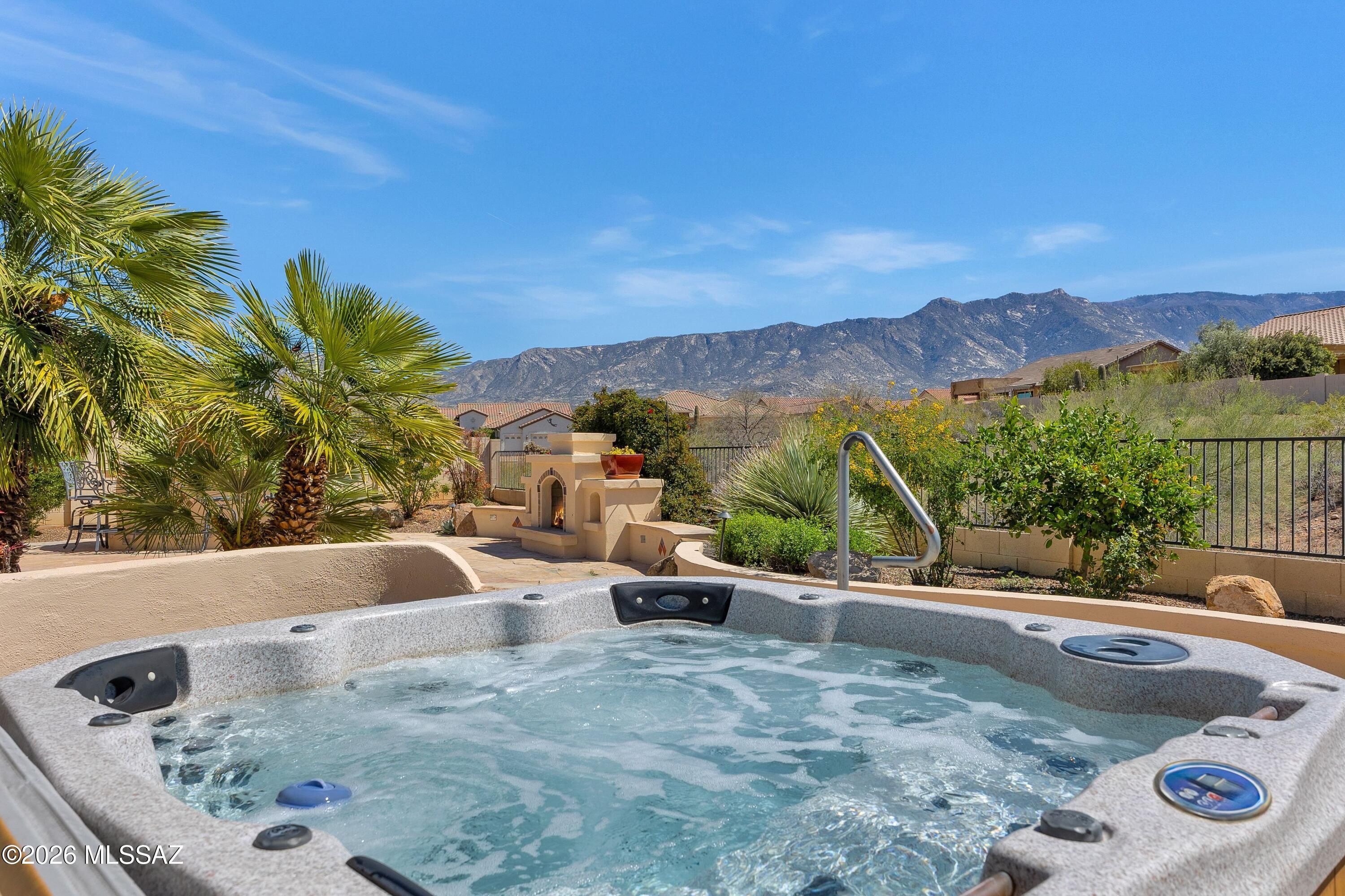 Talavera with Guest House, Owned Solar & Mountain Views! Great curb appeal with cactus fountain & inviting entry. Great room with gas fireplace & dining area with patio slider. Kitchen has quartz counters, gas cooktop, stainless appliances, knotty alder cabinets, & wine cooler. Powder room for guests. Owner's suite has patio door. Ensuite bath has soaking tub, walk-in shower, & walk-in closet. Den with French doors & custom built-in office system. Guest bedroom has closet & nearby bath. Tile flooring thru-out & 4 solar tubes. Laundry room with W/D, sink & cabinets. Guest house with Murphy bed system, closet, & bath with walk-in shower. Extended 3-car garage with 2019 W/H, sink, & side door. Covered flagstone patio with BBQ station, hot tub, gated yard, lovely landscaping, & mountain views!