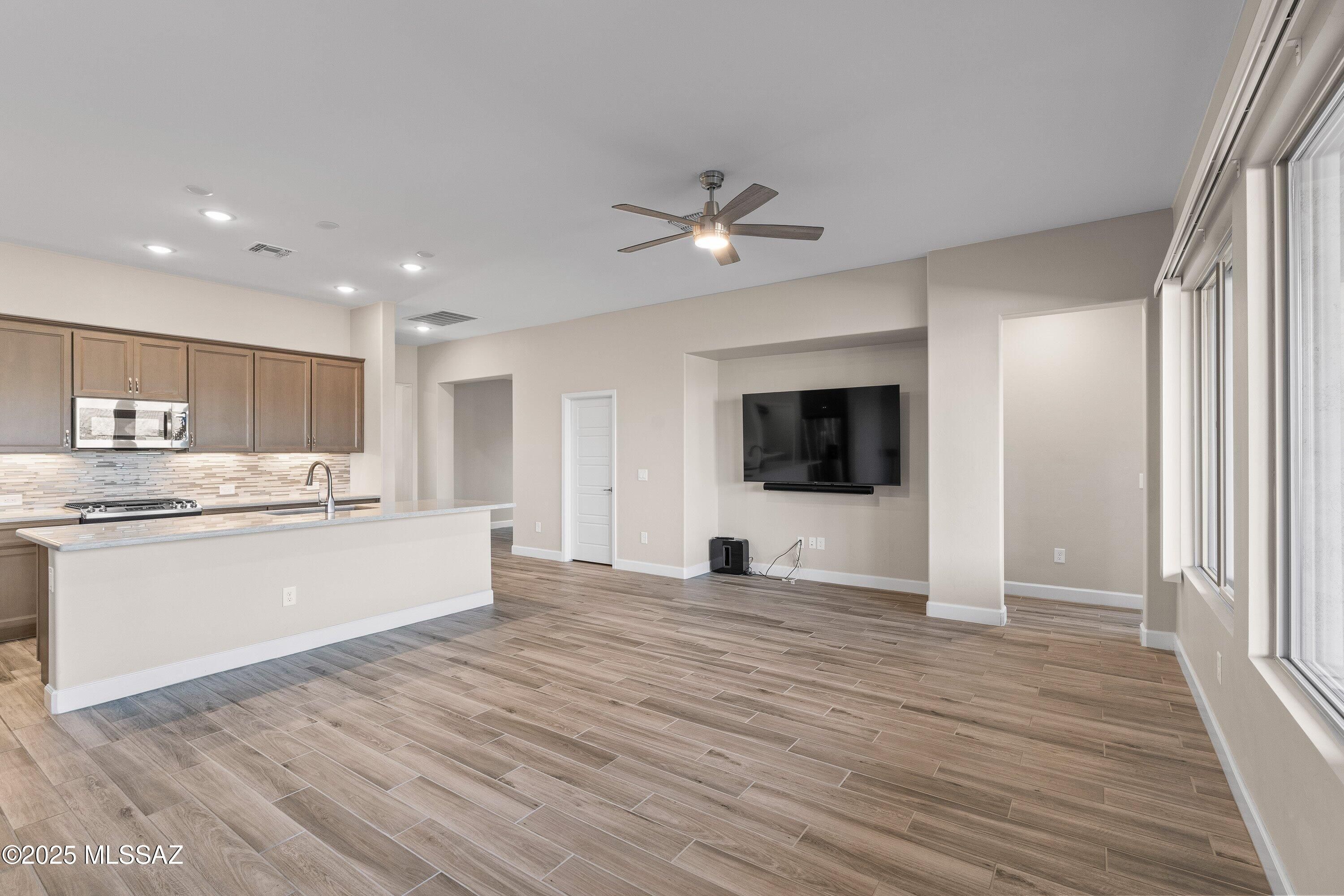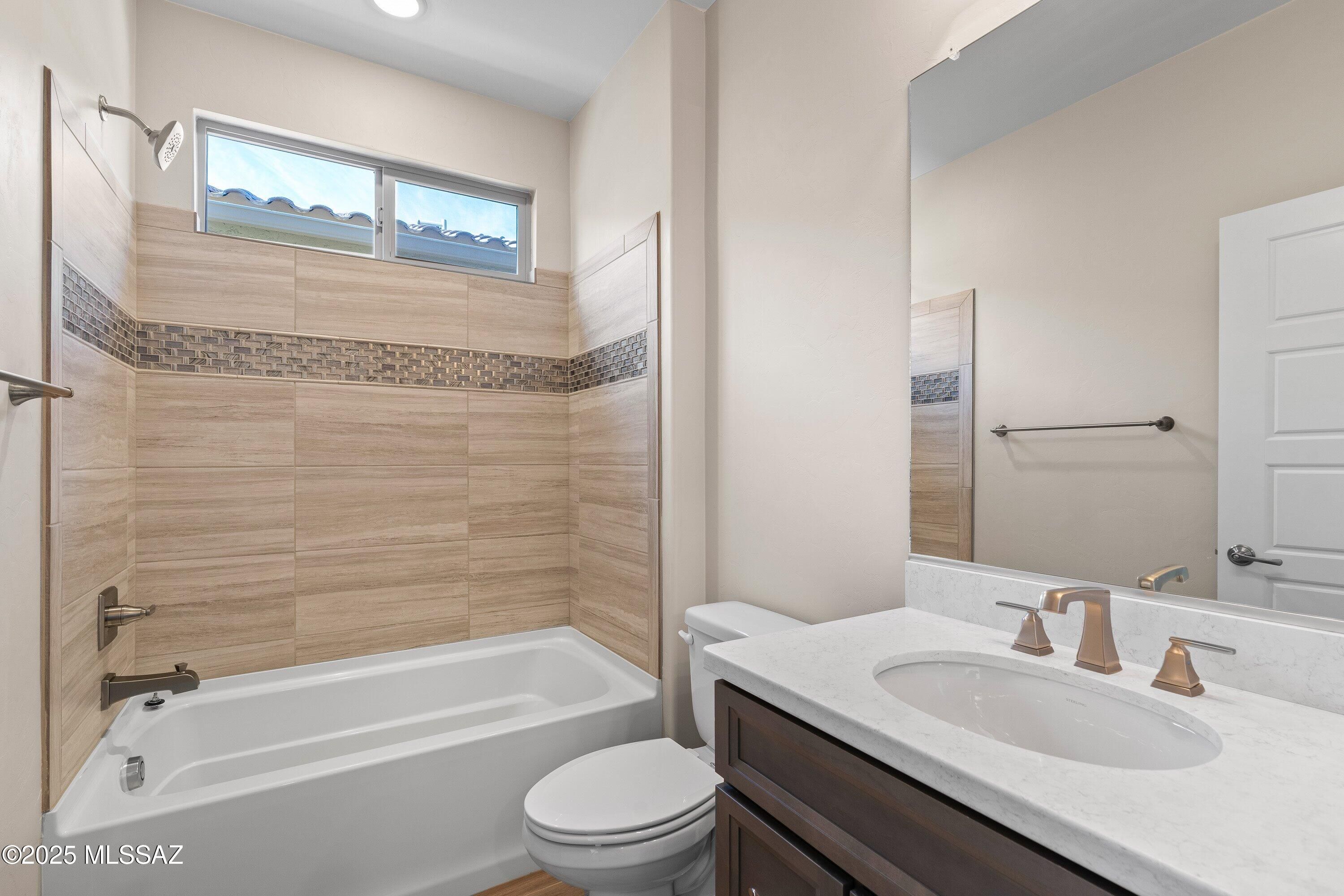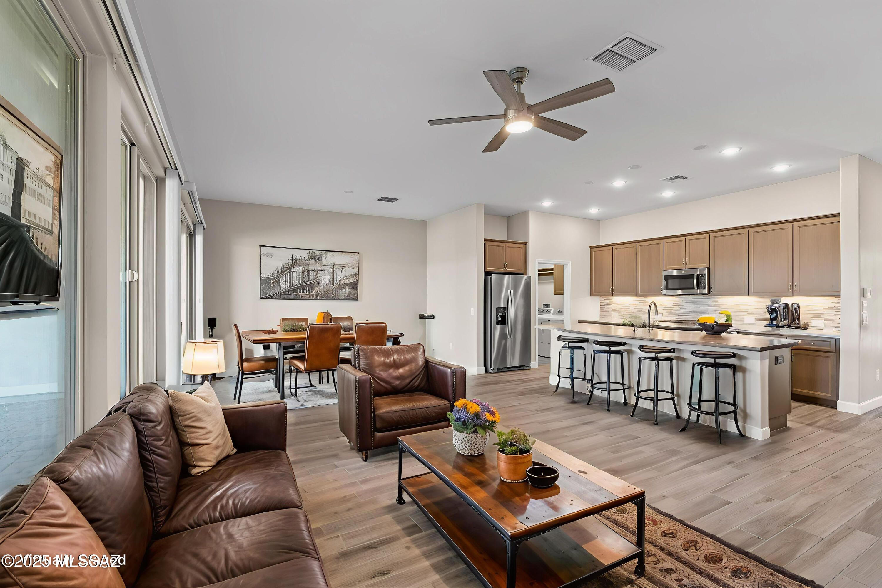 Discover the ease of refined desert living in this exceptionally appointed villa, ideally located in Saddlebrooke's premier Unit 50. Set on a private, no-rear-neighbor lot, this home offers effortless lock-and-leave convenience--all within minutes of SaddleBrooke's world-class amenities.Step inside to a bright, open layout designed for both comfort and style. Stone-look tile flows throughout the main living spaces, complementing the home's clean, modern lines. The spacious great room opens to a designer kitchen featuring soft-close cabinetry, quartz countertops, matching stainless steel appliances, a gas range, deep undermount sink, and a generous island perfect for cooking, gathering, and entertaining. The private owner's suite feels like a retreat, complete with dual vanities,
