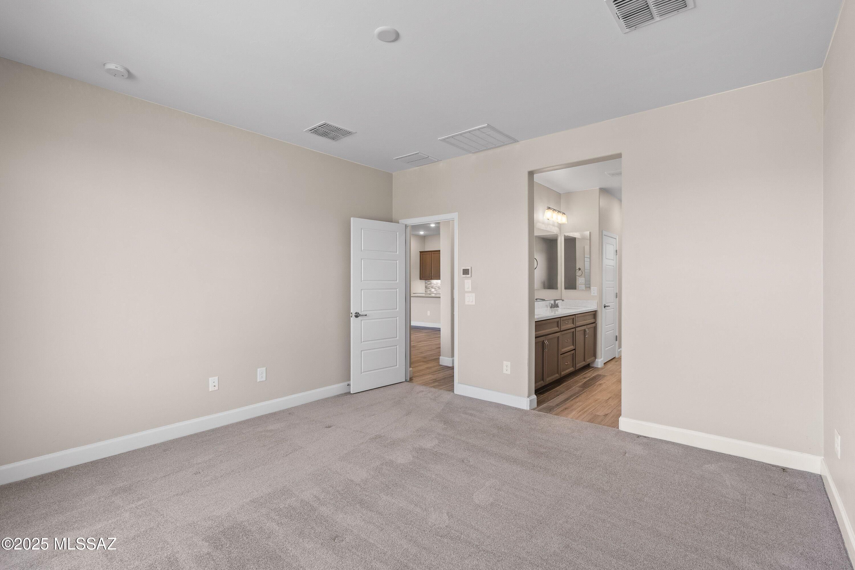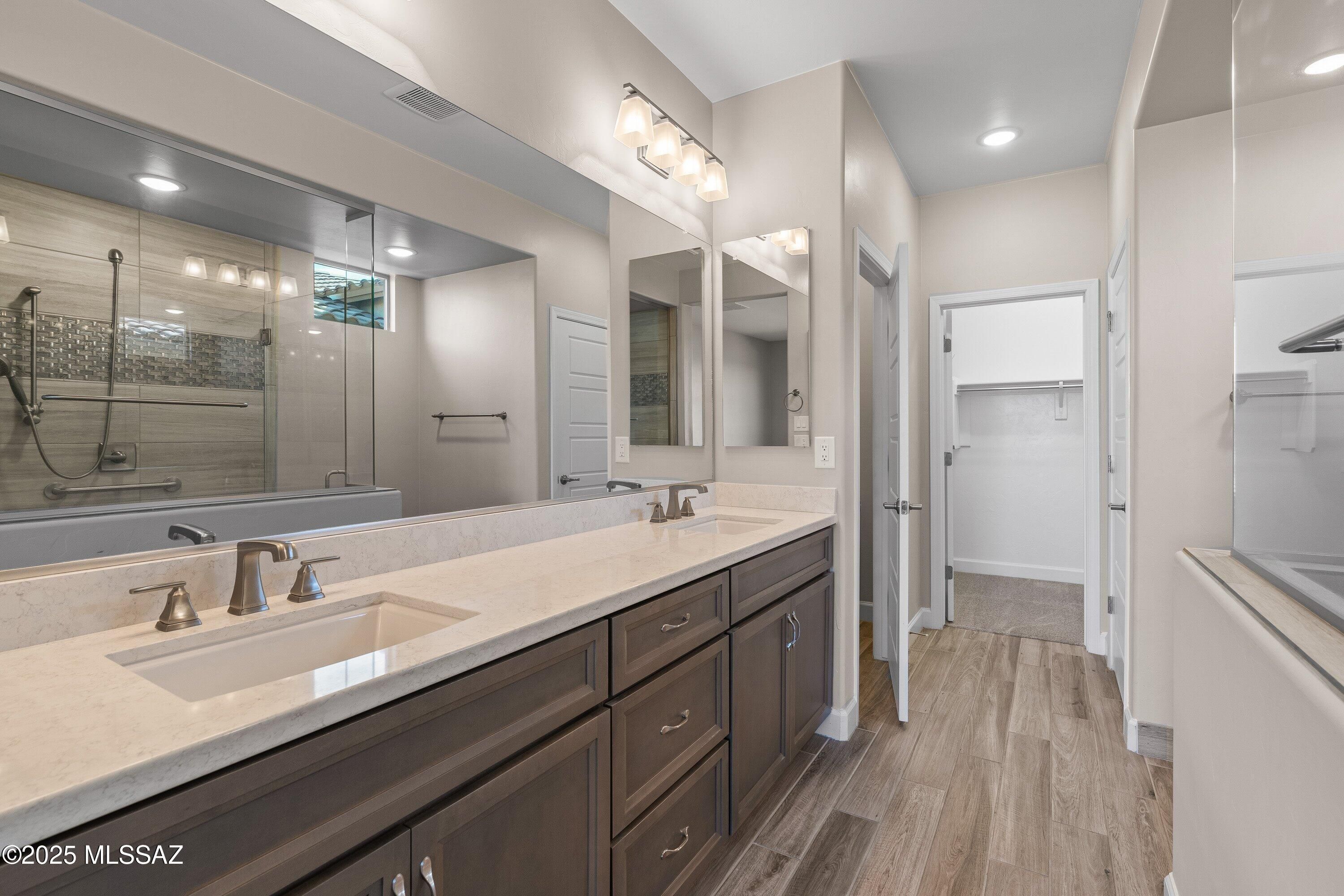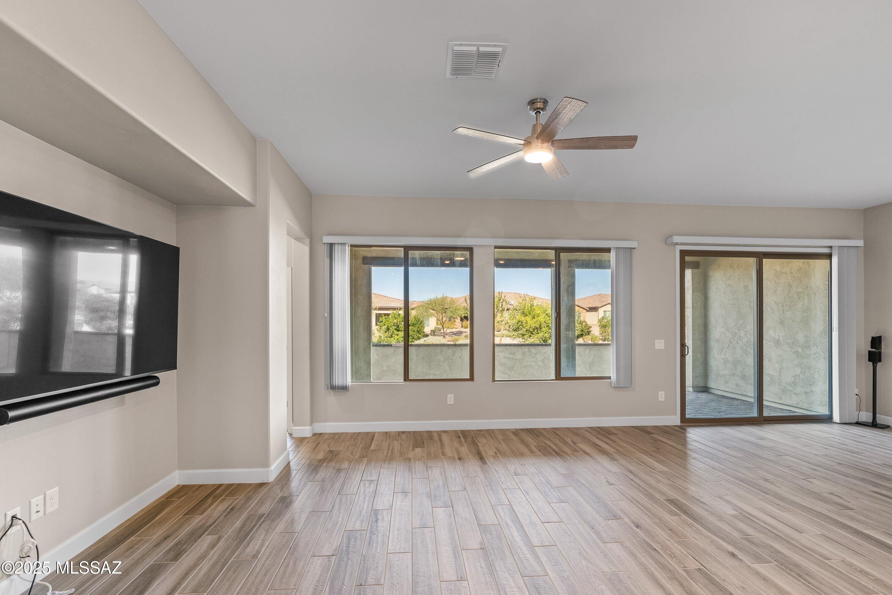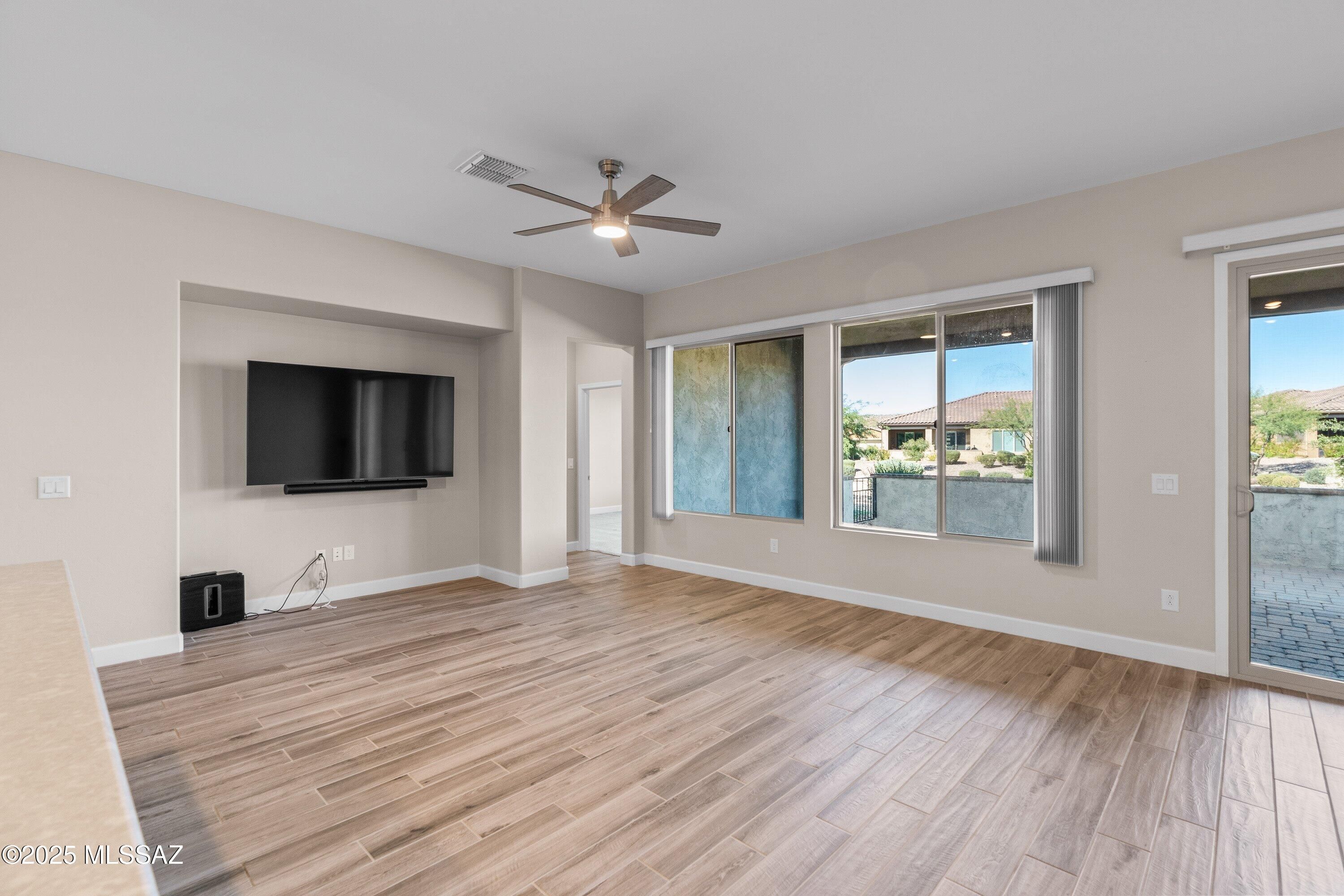 Discover the ease of refined desert living in this exceptionally appointed villa, ideally located in Saddlebrooke's premier Unit 50. Set on a private, no-rear-neighbor lot, this home offers effortless lock-and-leave convenience--all within minutes of SaddleBrooke's world-class amenities.Step inside to a bright, open layout designed for both comfort and style. Stone-look tile flows throughout the main living spaces, complementing the home's clean, modern lines. The spacious great room opens to a designer kitchen featuring soft-close cabinetry, quartz countertops, matching stainless steel appliances, a gas range, deep undermount sink, and a generous island perfect for cooking, gathering, and entertaining. The private owner's suite feels like a retreat, complete with dual vanities,