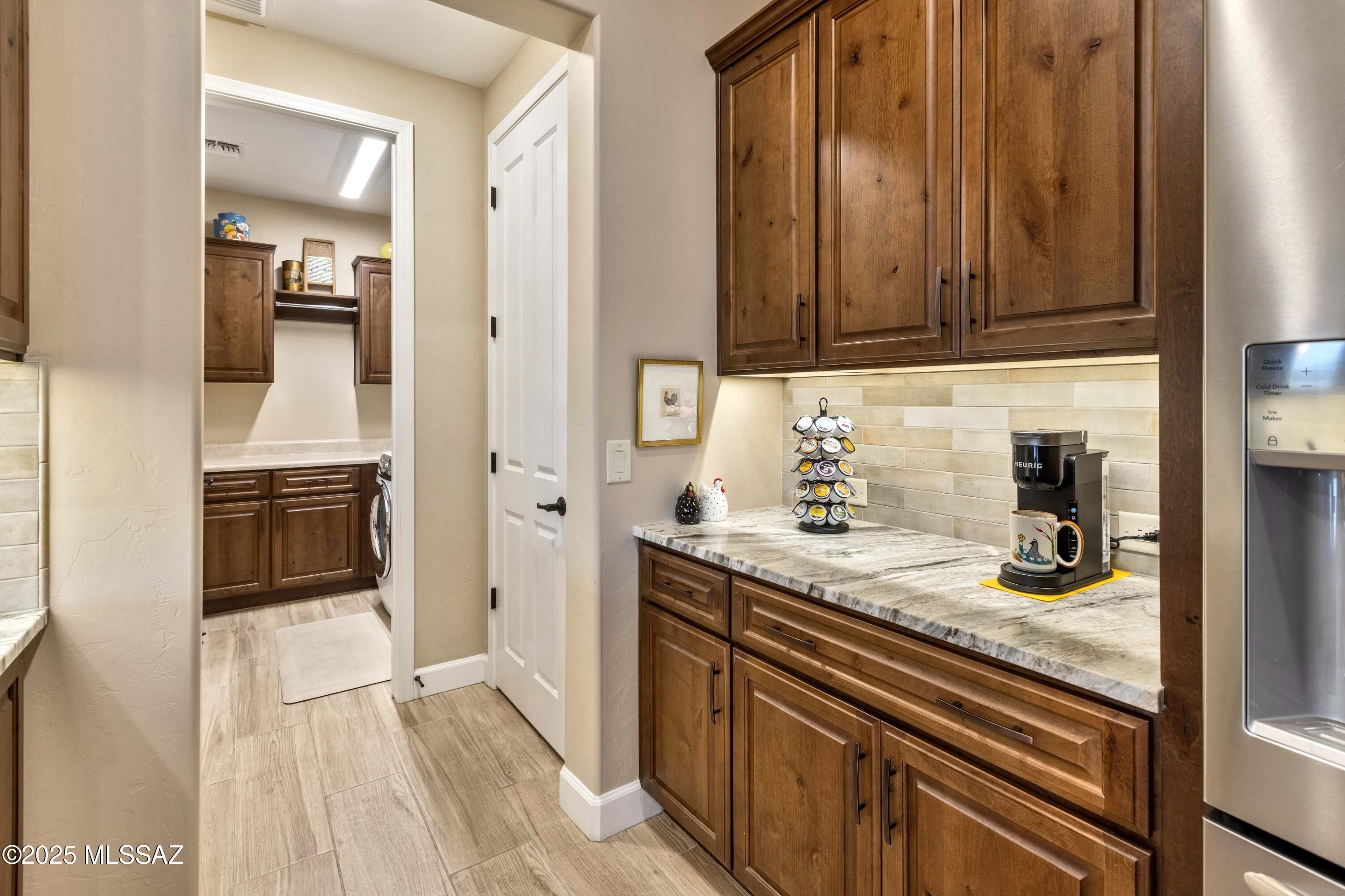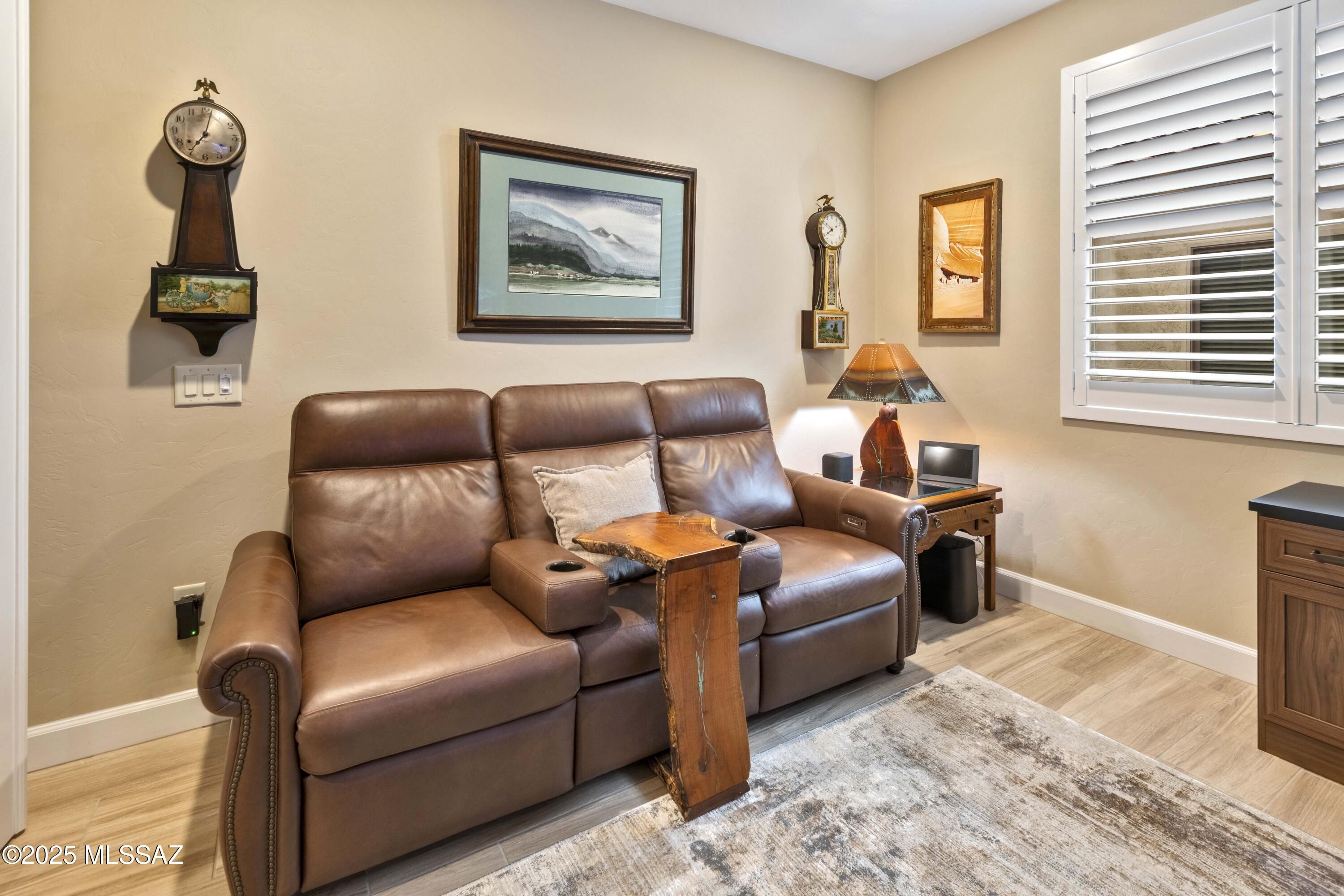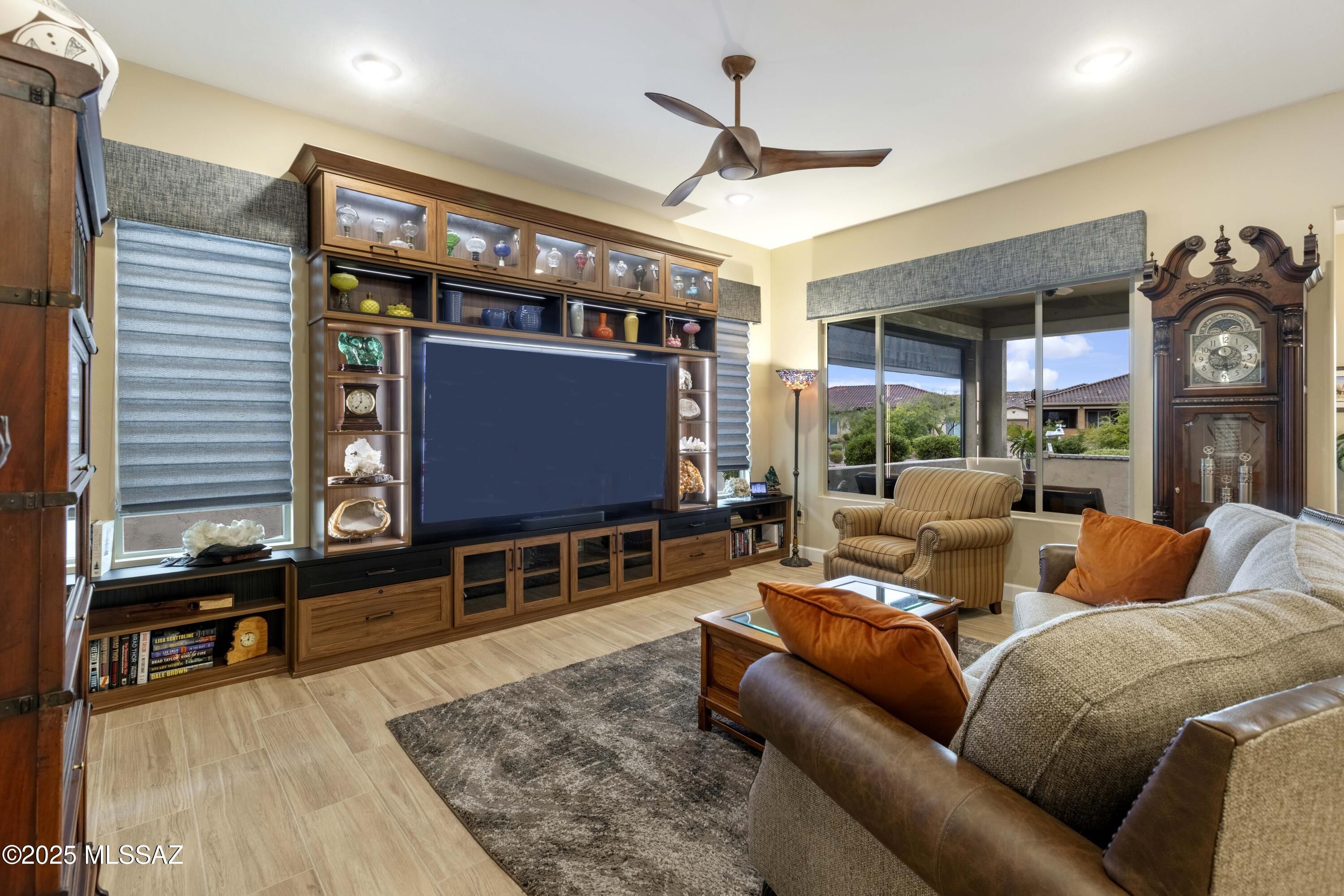 Exquisitely upgraded Lago Villa with over $65K in recent improvements & views of the Common Area. Wood-look tile in principal areas, carpet in bedrooms. Great Room offers a custom entertainment center w/ 85'' TV included, remote window coverings, and dining area opening to a private paver patio. Den/office features glass French doors and custom built-ins. Kitchen features 42''h Alder cabinets w/slide outs, granite counters, new backsplash, pendant & under-cabinet lighting, large leather-finish island, 5-burner cooktop, and newer SS appliances. Primary suite has an upgraded walk-in shower and California Closets. Guest room offers plantation shutters & Bath a walk-in shower. Garage boasts SS sink, cabinets, overhead storage, and Galaxy-finish flooring.Don't you deserve to Retire in Style!