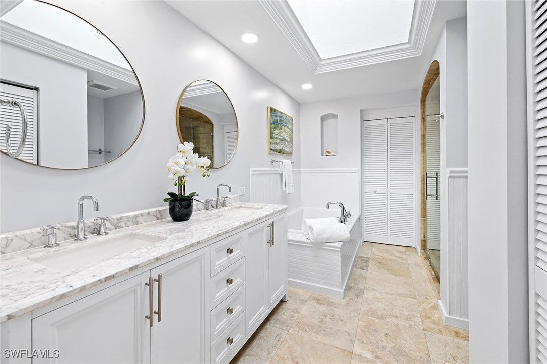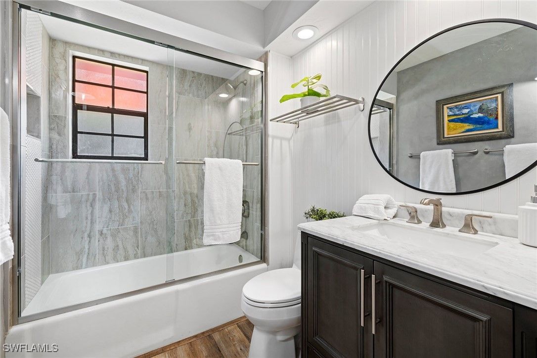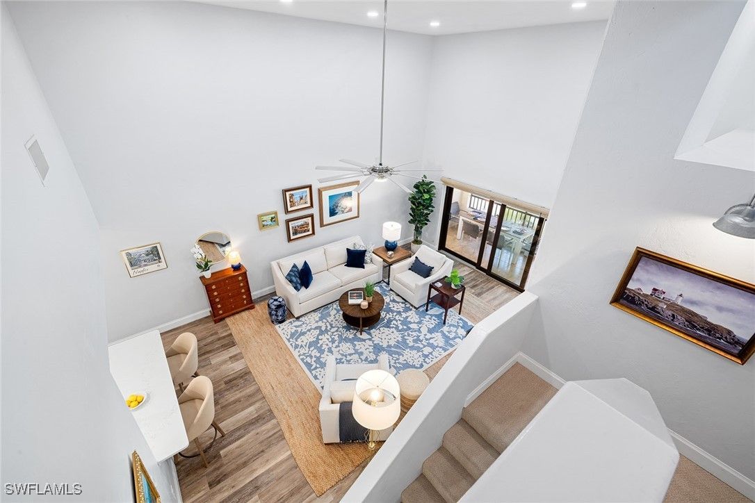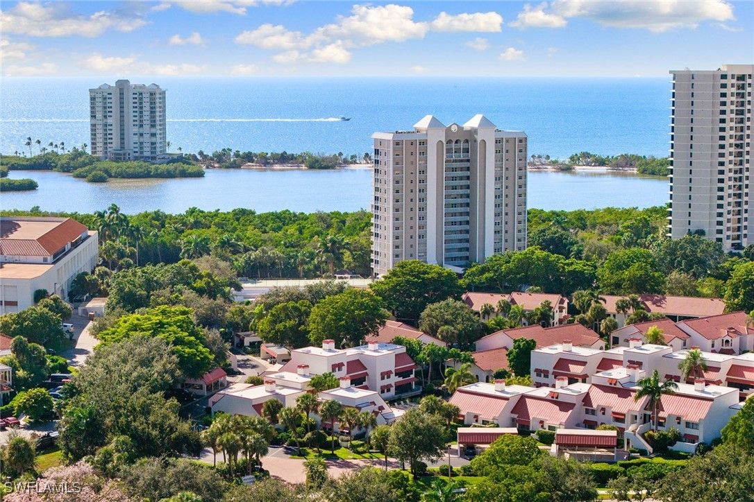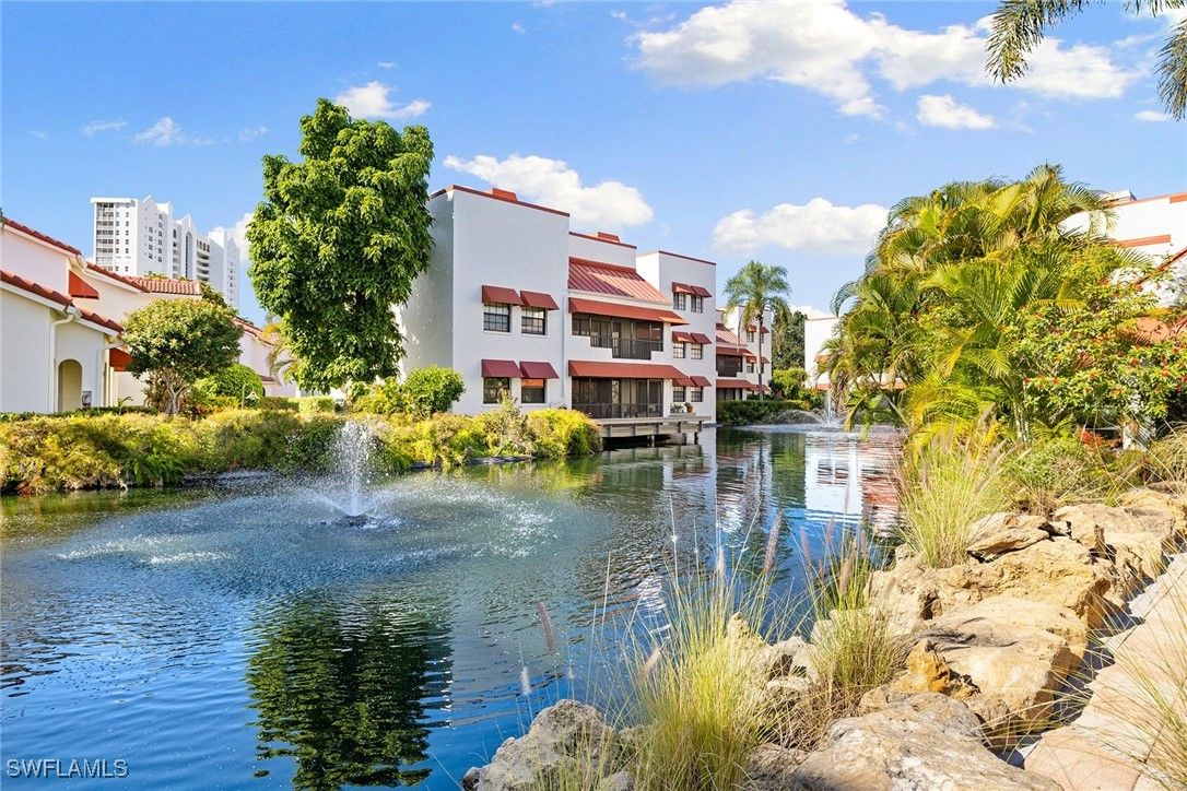 Fully updated, light and airy three-bedroom three-bath multi-level condominium with tasteful coastal finishes. In the desired south end of Pelican Bay and lives like a private villa with a second-floor entrance and soaring 16-foot cathedral ceilings. Walk to Waterside Shops, dining, Artis-Naples and Baker Museum. Offered turnkey with exclusions. Featuring a new kitchen with quartz countertops, soft-close cabinetry, and Bosch & GE Café appliances. A large owner's suite offers a spa-like bath with soaking tub, frameless glass shower, double vanity and dual walk-in closets. A junior suite and third bedroom with updated bath. The living room includes a fireplace, beverage cooler, impact glass sliders opening to a private lanai overlooking a peaceful lagoon, water feature, and one of two community pools. Extras include custom shutters, HVAC air purifier, new roof, updated electrical and fresh exterior paint. Pet-friendly and charming home in amenity-rich Pelican Bay with private beachfront cabana service, dining, tennis/pickleball, fitness and vibrant social scene. It's all ready for you! Just pack your sunscreen.