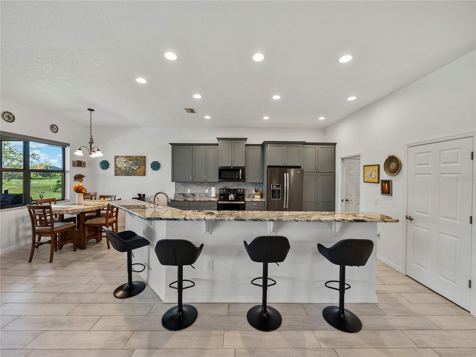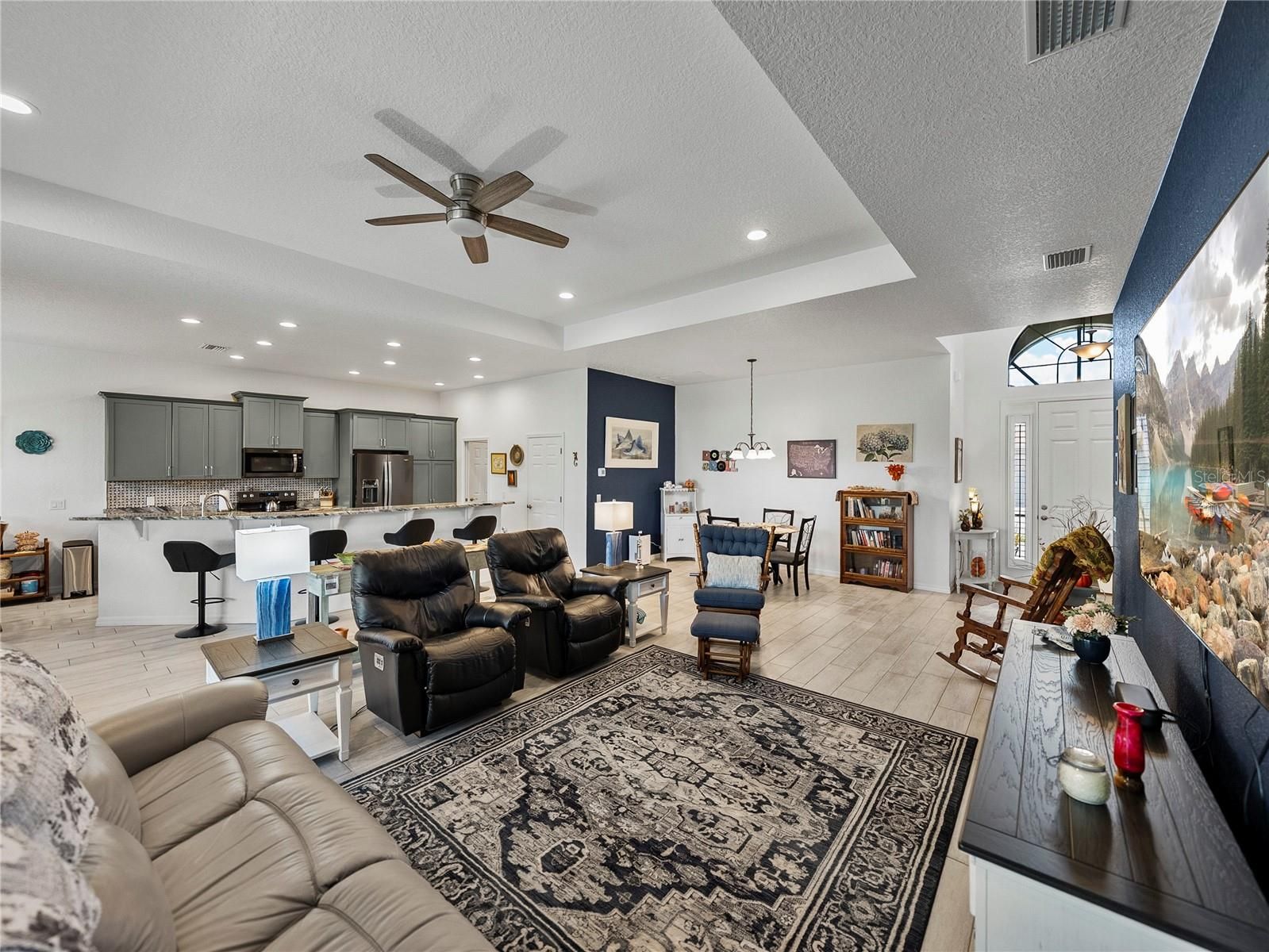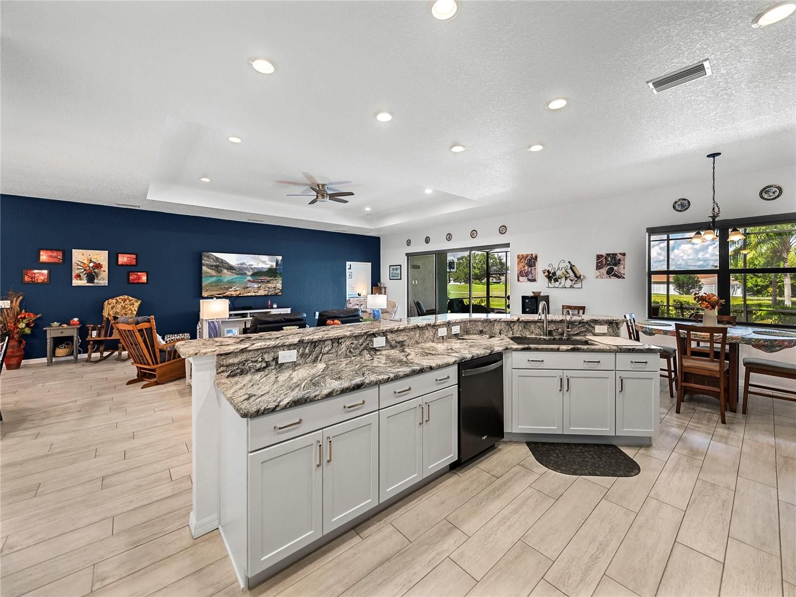 - Attic Ventilator, Cathedral Ceiling(s), Ceiling Fan(s), Living/Dining Room, Open Floorplan, Stone Counters, Thermostat, Walk-In Closet(s), Window Treatments