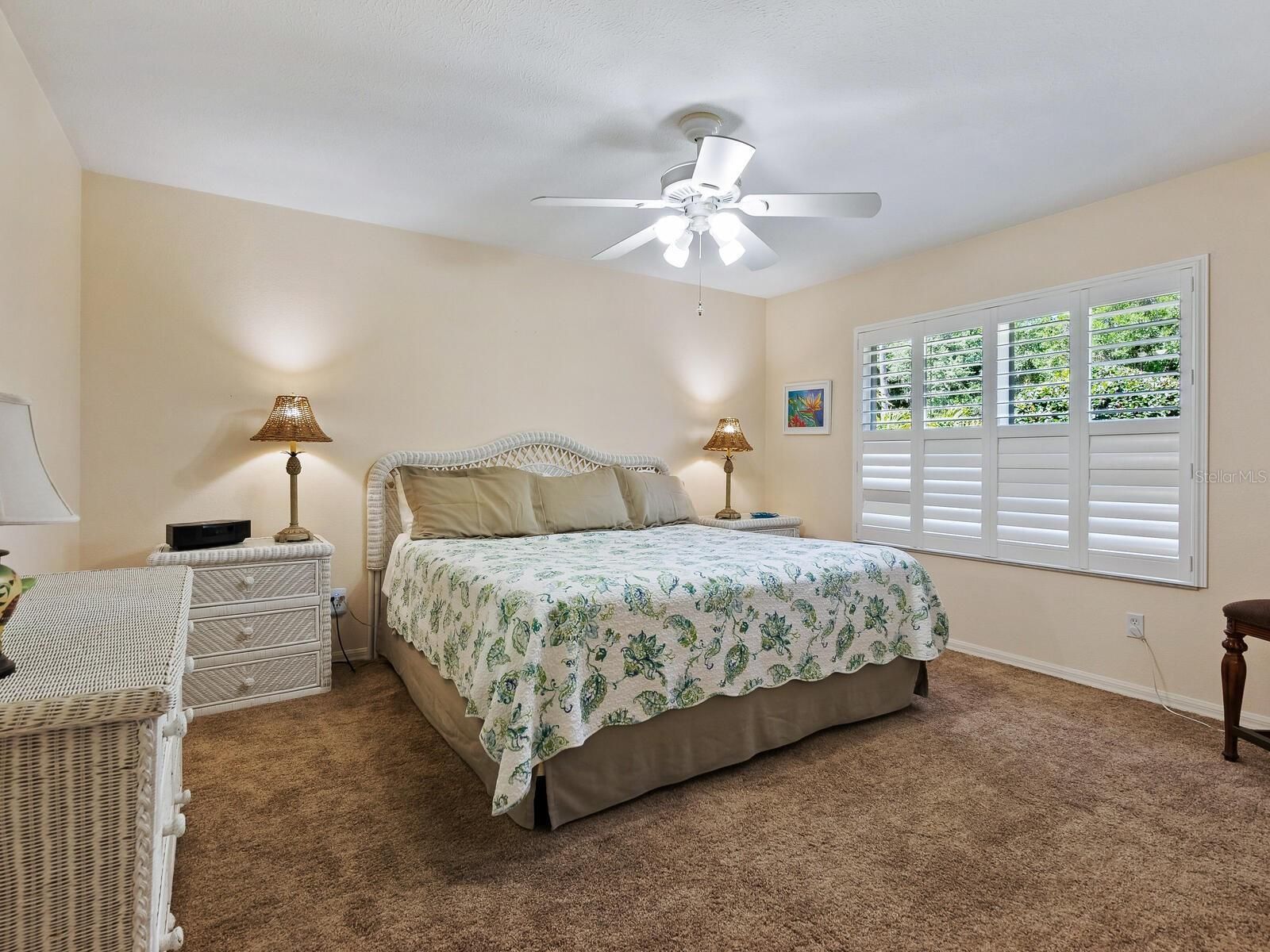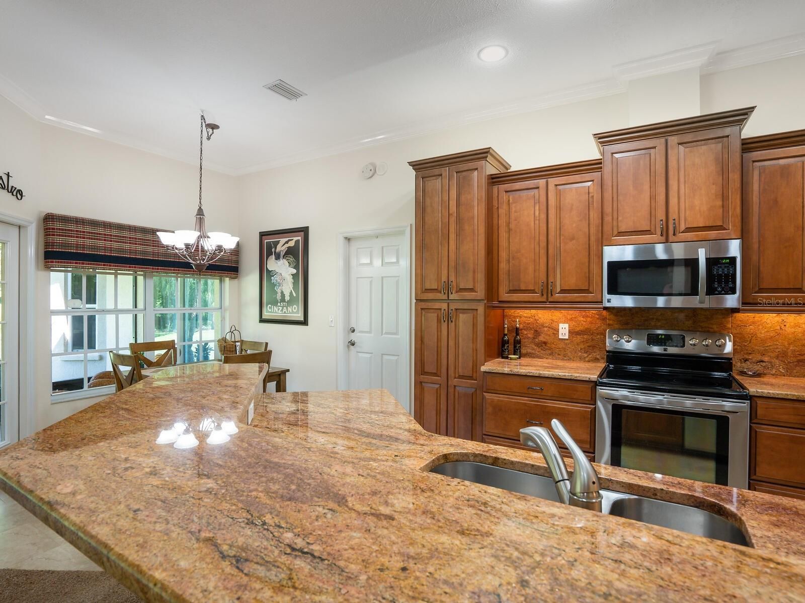 - Ceiling Fan(s), Crown Molding, Open Floorplan, Main Level Primary, Solid-Wood Cabinets, Split Bedrooms, Stone Counters, Window Treatments