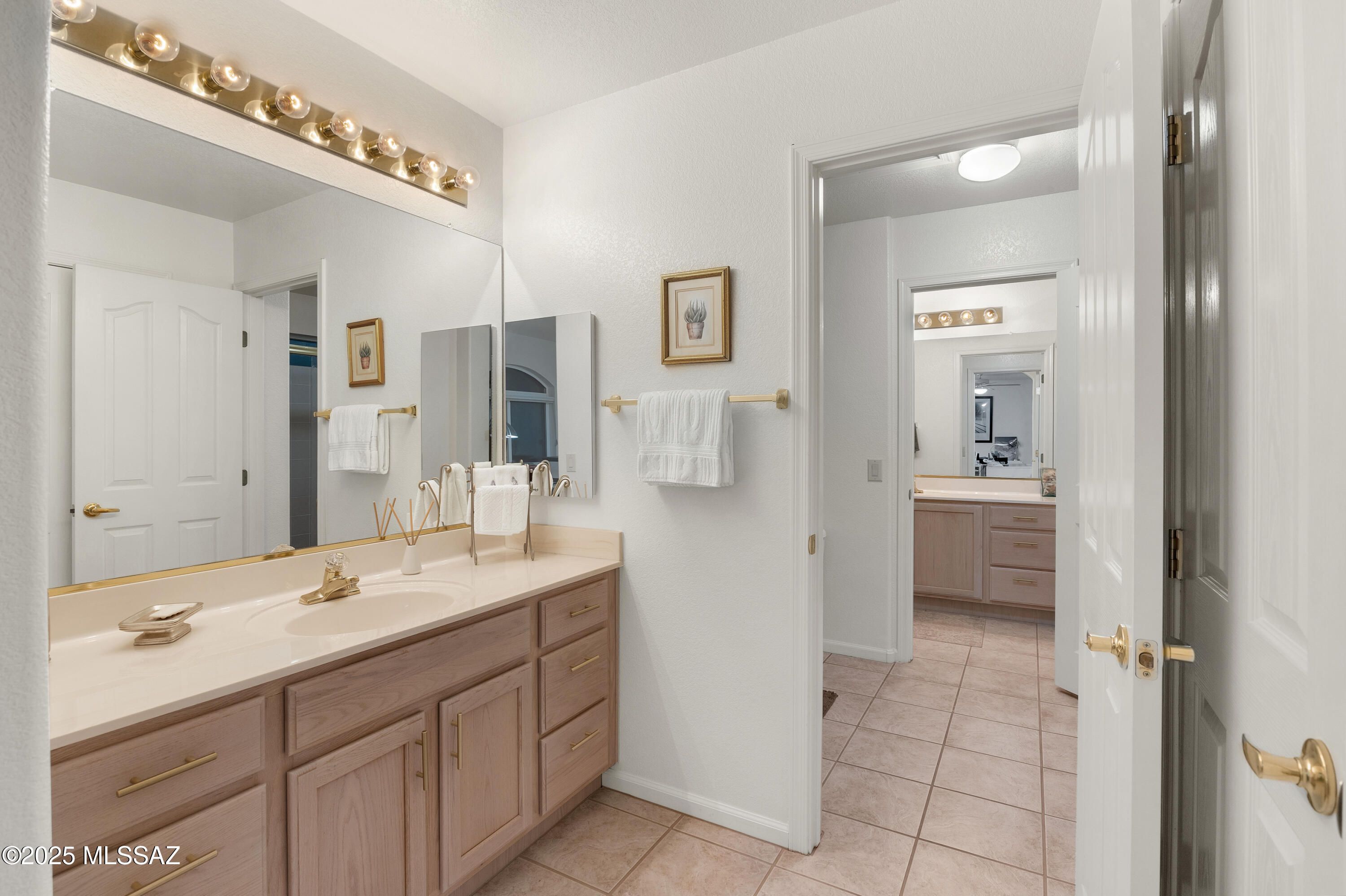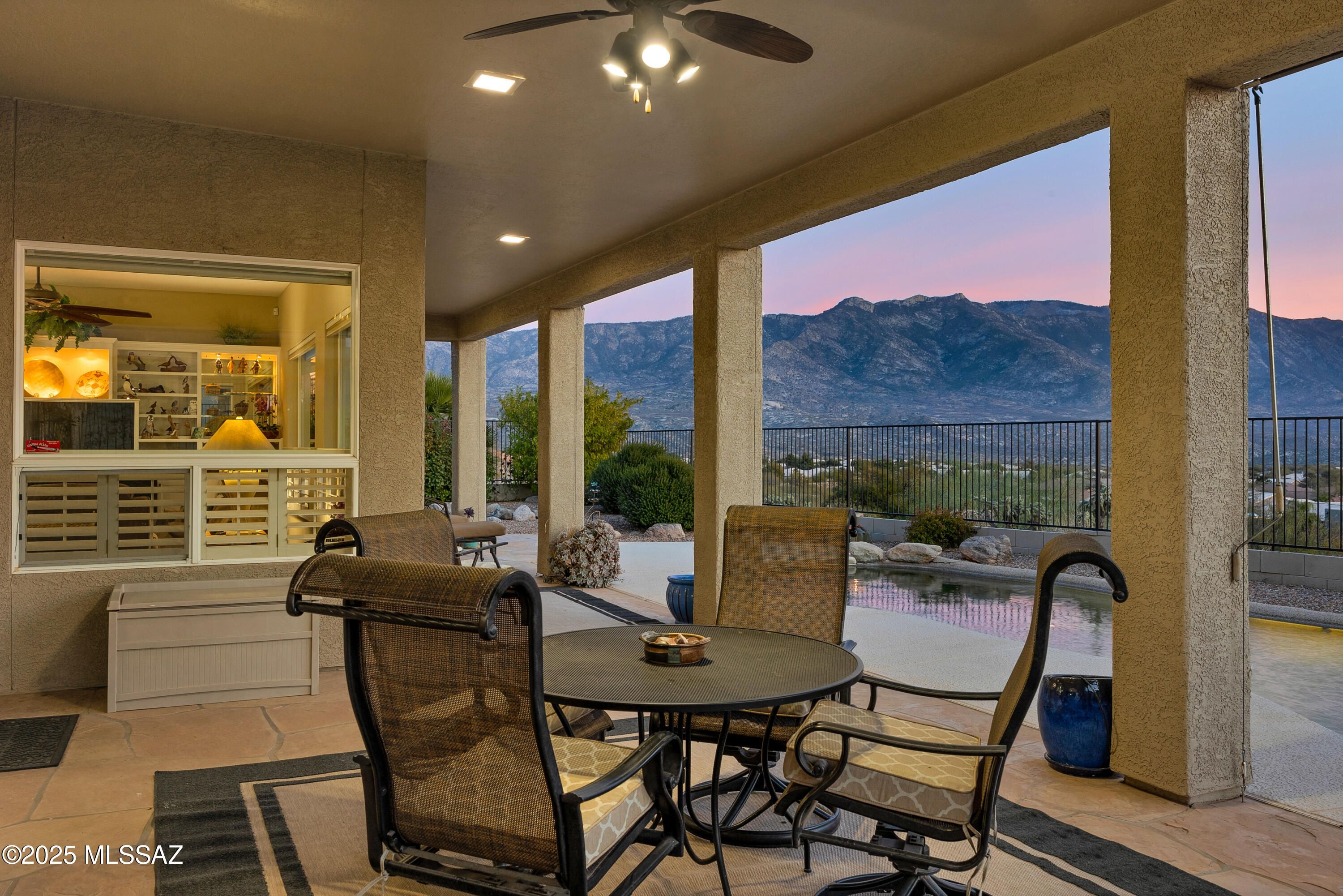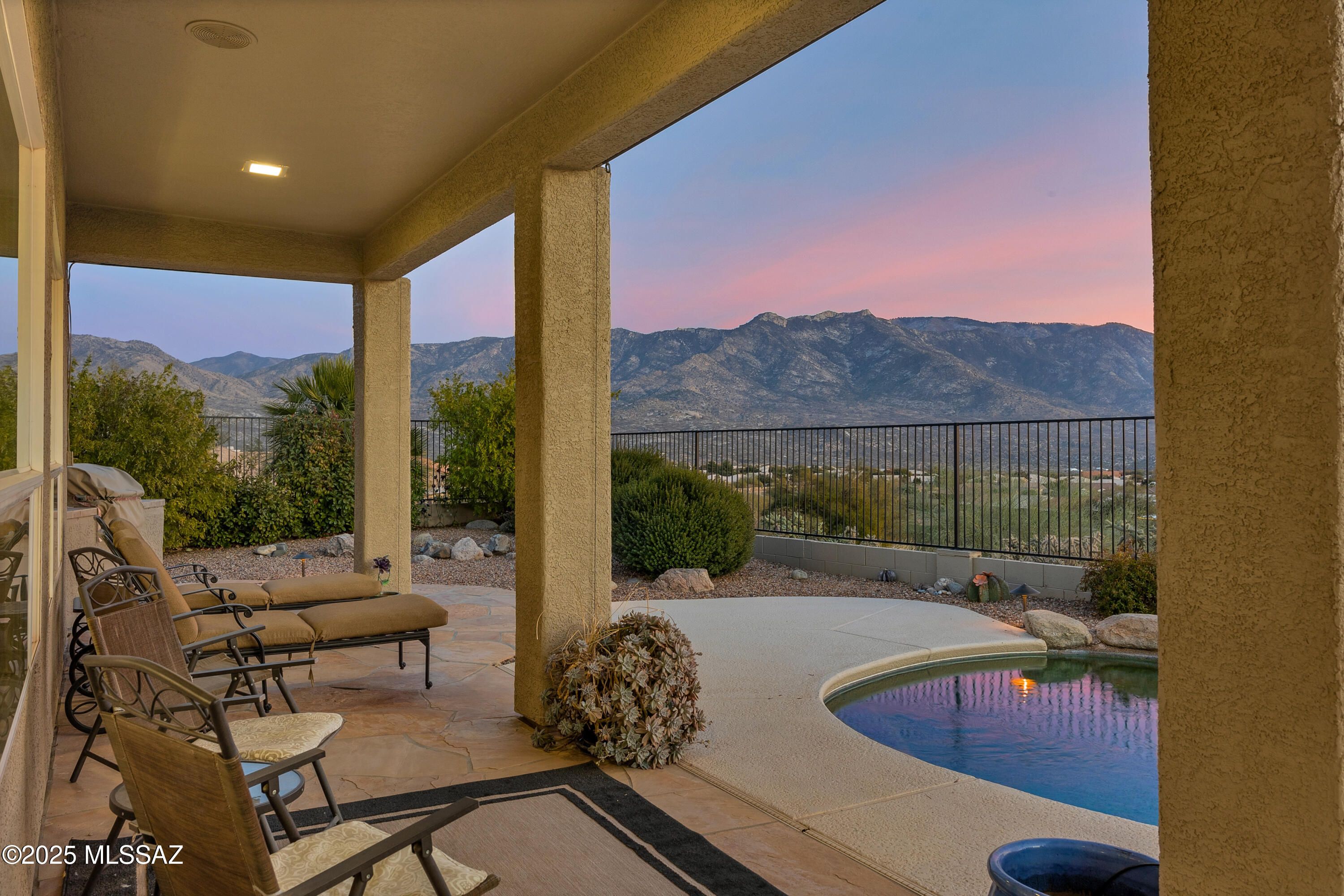 Breathtaking views of Catalina mountains overlooking the 9th Hole of the Mountainview Golf Course makes this Sundance model a must see! This property offers unparalleled comfort, thoughtful upgrades, and a lifestyle that feels like a permanent vacation. The kitchen is a chef's dream updated with black stainless-steel appliances, including a Bosch dishwasher, GE Advantium oven, gas cooktop, Elkay Quartz Luxe kitchen sink, and natural granite countertops. A water filtration system ensures pristine hydration. The Casita, complete with a Murphy bed and full bath, is perfect for visitors or multi-generational living. A Jack & Jill bathroom adds functionality and privacy for additional bedrooms upstairs. Primary suite includes: Blackout blinds, walk out to patio, and serene views.