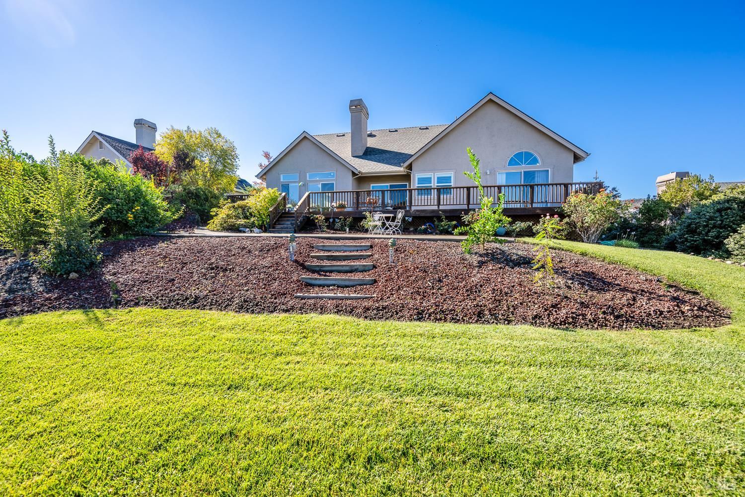 This exceptional El Verano floorplan - 2281 sq. ft. with 2.5baths - has been masterfully remodeled with uncompromising craftsmanship and design. Upon entry, half walls and faux posts have been removed to create an effortless, open flow. The kitchen, primary bath and hall bath feature stunning Calacatta Neolith Quartz counters, complemented by rift-sawn cabinetry in the hall and primary baths. The kitchen offers abundant storage, including an added pantry, and is equipped with stainless steel GE appliances, highlighted by a 5-burner gas range and a Fisher & Paykel dishwasher. The family room showcases and open wood-beam ceiling with tongue and groove detailing, while a double sided fireplace warms both the living and family rooms. Hunter-Douglas power shades easily filter the sunlight. The luxurious primary bath includes a freestanding jetted spa tub and a roll-in shower with Calacatta penny tile accents. The primary bedroom, living room and family room each offer easy access to the expanded deck, where panoramic views set the perfect backdrop for relaxation or entertaining. Laundry room includes newer washer & dryer. The approx 1/3 acre offers a lower patio, lawn and fruit trees. New Roof. Two-car garage with plenty of storage and an accessibility ramp.