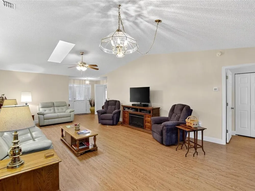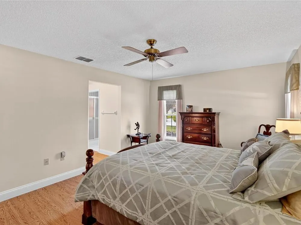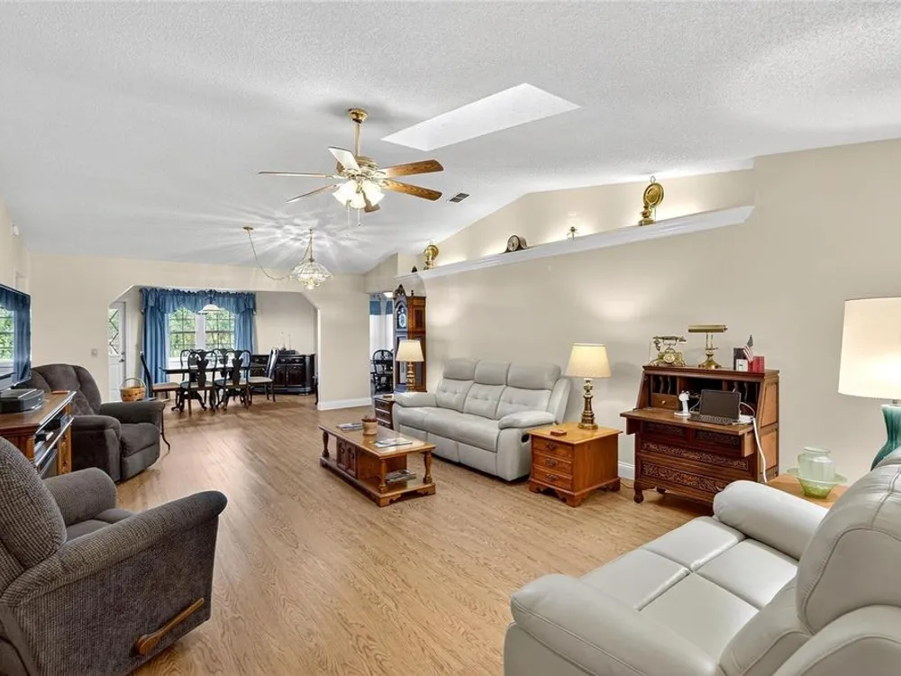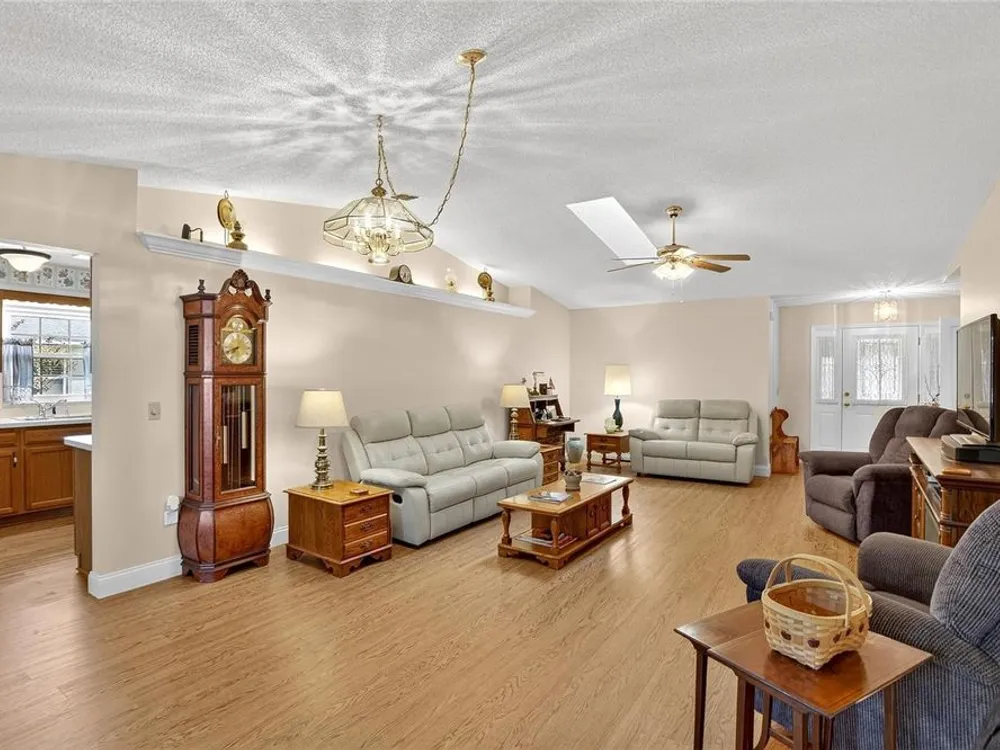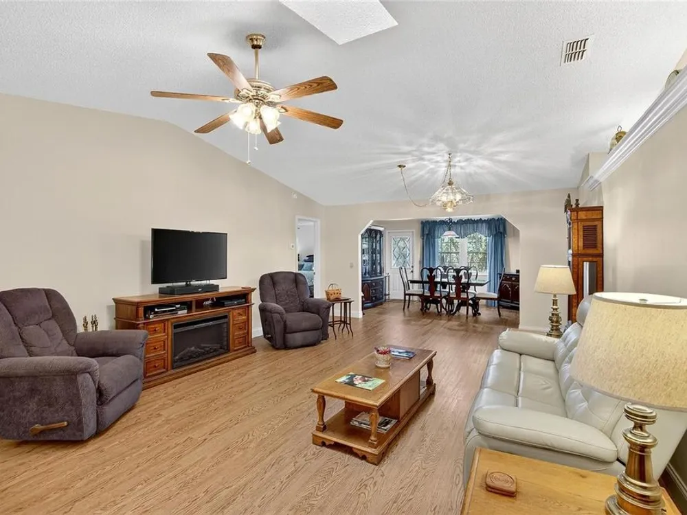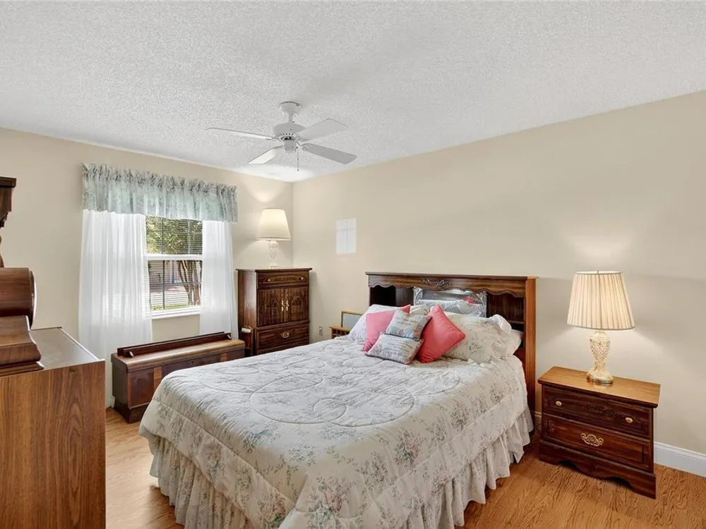 Welcome home to this gorgeous 3-bedroom, 2-bath residence with 1,857 square feet of gracious living in the highly sought-after 55+ gated community of Silver Lakes. Set on a premium .25 lot, one of the largest in the neighborhood, this home offers extra elbow room between neighbors, a spacious backyard, and a meticulously maintained interior that’s truly move-in ready. From the moment you step through the front door, you’ll be drawn to the soaring ceilings, open floor plan, and the spacious living room that flows seamlessly into the dining and kitchen areas. Luxury vinyl plank flooring and 5 inch baseboards flows throughout the entire home - no carpeting here! The kitchen features abundant cabinet and counter space, a breakfast bar, closet pantry, cozy breakfast nook, and an upgraded GE Black Stainless Appliance Suite with natural gas range, refrigerator, dishwasher, and microwave. The inside utility room adds convenience with a utility sink, additional storage cabinets, and plenty of space to stay organized. The washer and gas dryer are included with the home. The formal dining room is both elegant and inviting, enhanced by beautiful crown molding that adds a touch of sophistication. Large windows frame picturesque views of the backyard, filling the room with natural light and creating the perfect setting for family dinners, holiday gatherings. The spacious master bedroom offers a comfortable retreat with plenty of room for your favorite furnishings and a large walk-in closet that provides exceptional storage. The ensuite bath is thoughtfully designed with a beautifully tiled shower, a separate wet room for added privacy, a convenient linen closet, and even an additional storage closet—ensuring everything has its place. The two guest bedrooms are tucked away in their own private suite, offering comfort and privacy for family or visitors. Each room features a spacious closet and plenty of natural light, making them perfect for overnight stays or even a home office. A shared bathroom with a tiled tub and shower, along with its own linen closet. The garage is a dream with a workbench, storage cabinets, wet sink, separate side entry, a newer hurricane-rated garage door, and garage door opener. More features include Double-hung tempered glass hurricane windows 2019, Aluminum gutters & soffits 2020, hurricane-rated garage door, garage door opener 2018, HVAC 2018 and a Brand-New 30-year architectural shingle roof will be installed with an accepted offer. Sitting under the shade tree on the front patio or enjoying a cup of coffee on the enclosed 4 seasons front porch or grilling out on the rear patio, relaxation is what it's all about with this home! Silver Lakes is designed for low-maintenance living, along with a low monthly HOA fee of $225 that covers cable, internet, lawn care, & reclaimed water for irrigation. The recently updated Clubhouse is the heart of the neighborhood, offering a junior Olympic-sized heated pool and spa surrounded by a paver patio, a fitness center, sauna, library, kitchen, banquet hall, card room or take a walk around the three lakes in the community. With plenty of activities to choose from, Silver Lakes is welcoming, pet-friendly, and ideally located close to shopping, dining, medical facilities, and I-4 for easy travel to both Tampa and Orlando, as well as world-famous attractions. Don’t miss the chance to own this beautifully maintained home in a beautiful community—schedule your private showing today!