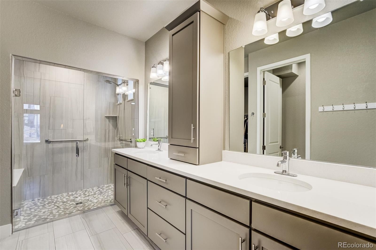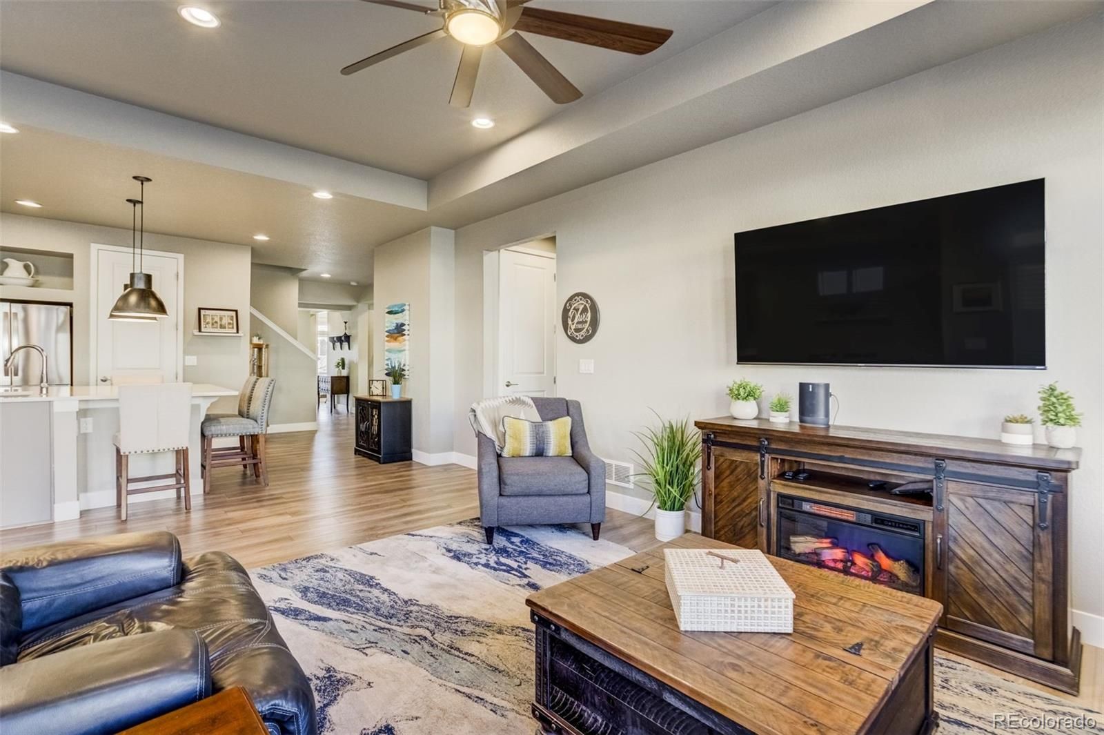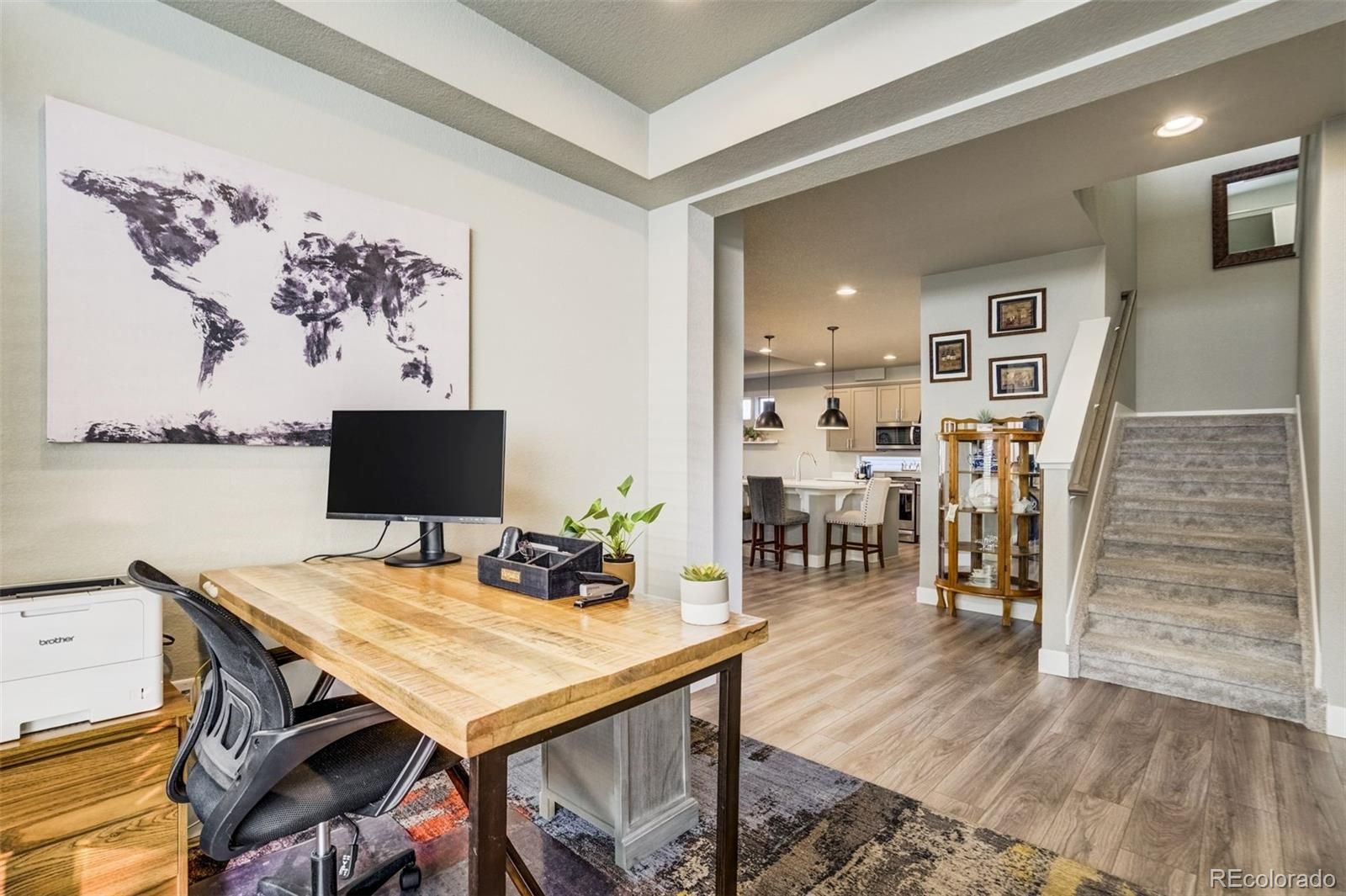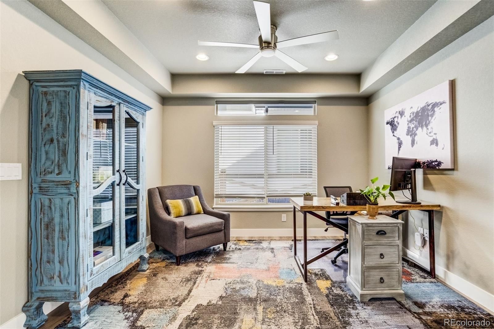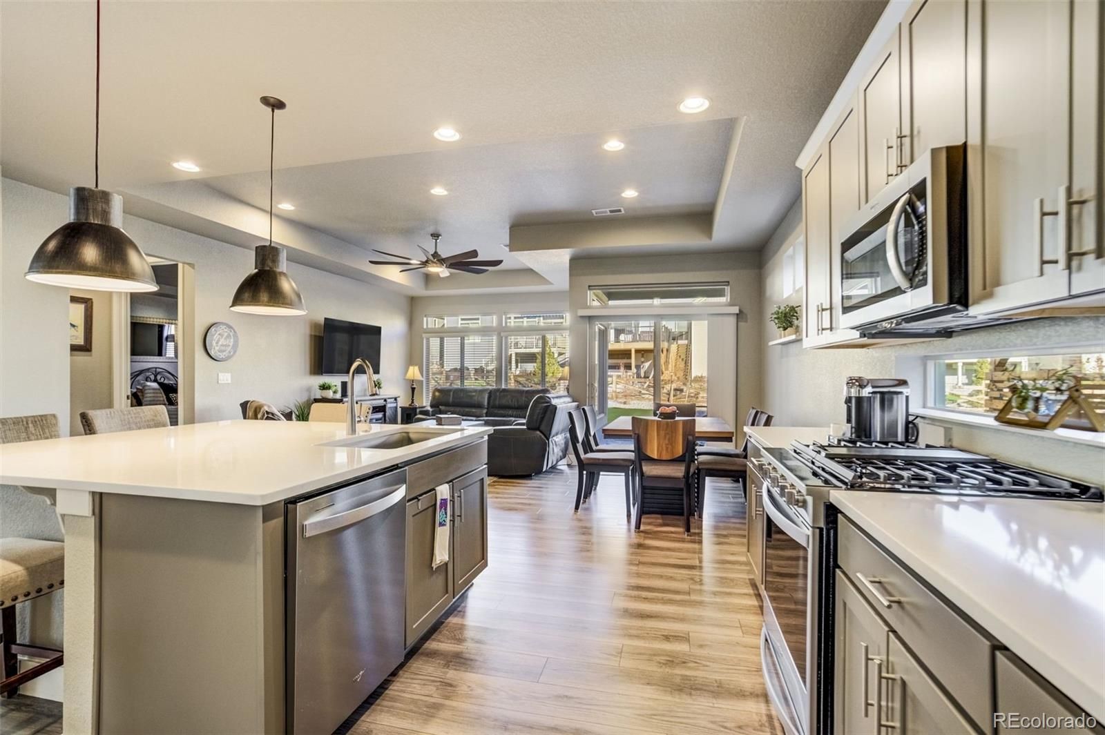 Beautifully upgraded two-story home located in The Retreat, a gated 55+ community within Banning Lewis Ranch, where thoughtful design meets effortless, low-maintenance living. Impeccably maintained residence offers the ease of main-level living with modern finishes throughout. Once inside, you’ll find luxury vinyl plank flooring throughout an open-concept layout that seamlessly connects the living room, dining area, and kitchen—perfect for both everyday living and entertaining. The kitchen is a true centerpiece, featuring a large island, quartz countertops, a walk-in pantry, stainless steel appliances, and a gas range. The spacious main-level primary suite boasts elegant coffered ceilings and an en-suite bathroom with a curbless walk-in shower, double vanity, and walk-in closet. A secondary bedroom with its own walk-in closet, a dedicated office or study, and a laundry room with extra cabinetry complete the main floor, offering exceptional functionality and storage. Upstairs, you’ll find an additional bedroom with a walk-in closet, a full bathroom, and an oversized loft—providing flex space for a media room, or play area. The fully finished garage features epoxy floors, a bike mount, a workbench, additional cabinets/outlets, and even a conveniently located hose bib. Step outside to enjoy the extended patio and covered porch with a gas hardline—perfect for grilling and outdoor entertaining. This home also has one of the largest lots in the neighborhood. The backyard is fully fenced, landscaped, and finished with artificial turf, while the HOA handles front lawn maintenance for truly low-maintenance living. Banning Lewis Ranch provides exceptional community amenities, including a community center with events, a fitness center, a pool, and an extensive network of hiking & biking trails. With main-level living, modern upgrades, and resort-style amenities (including snow removal), this home offers comfort, convenience, and lifestyle all in one.