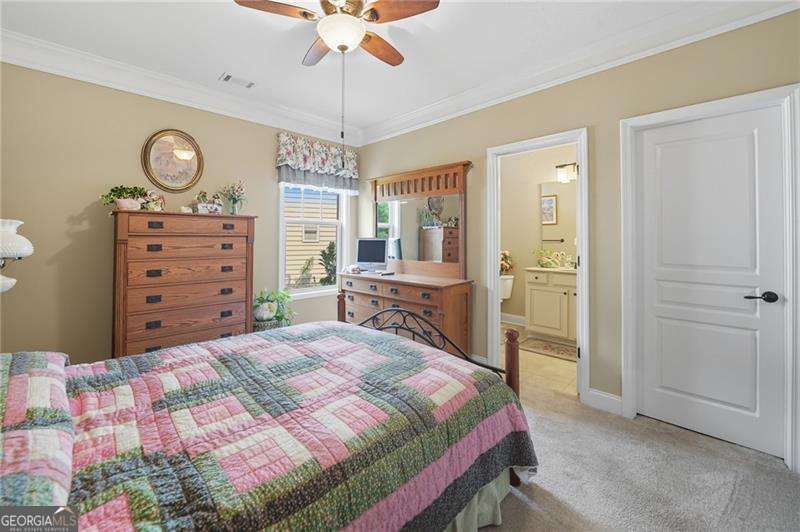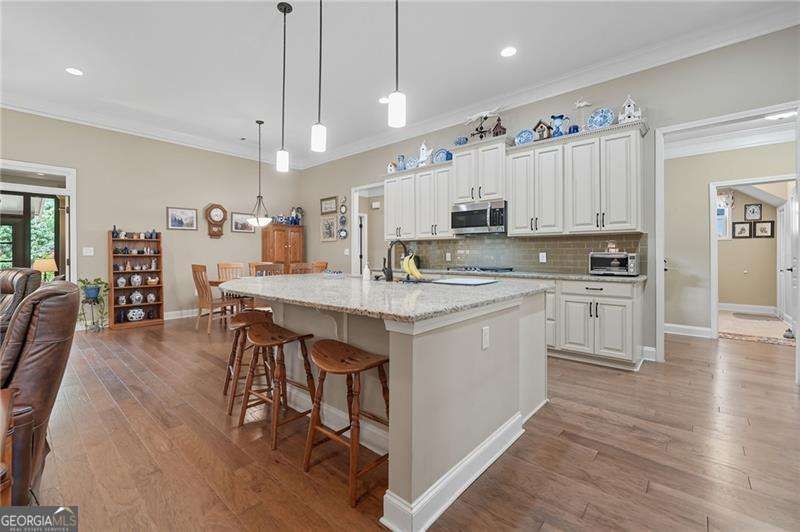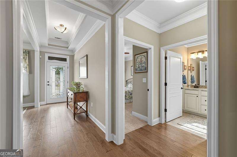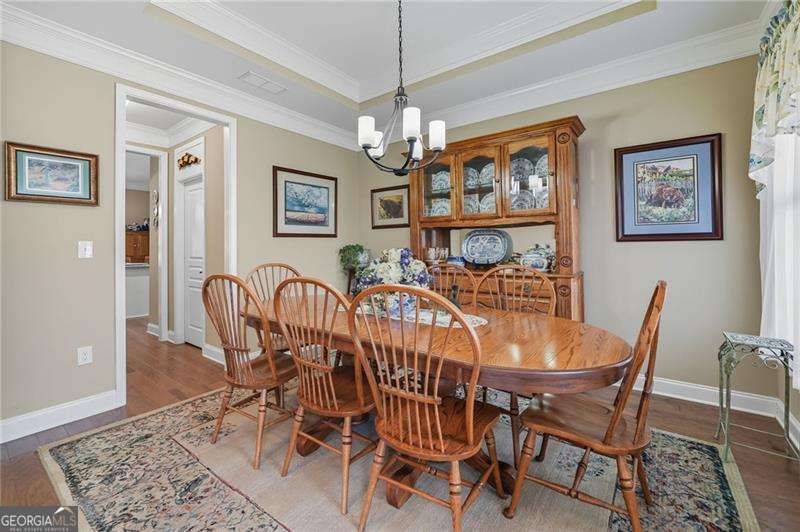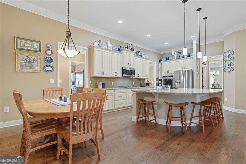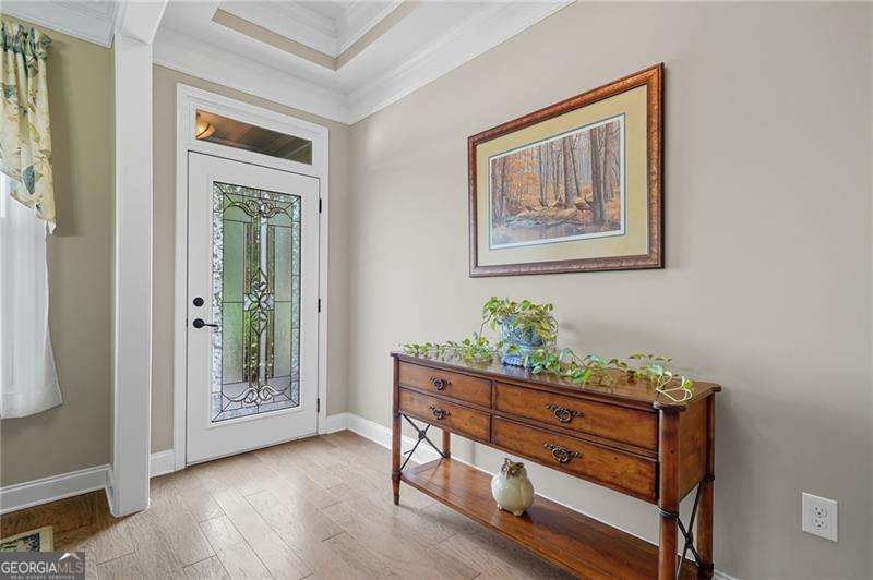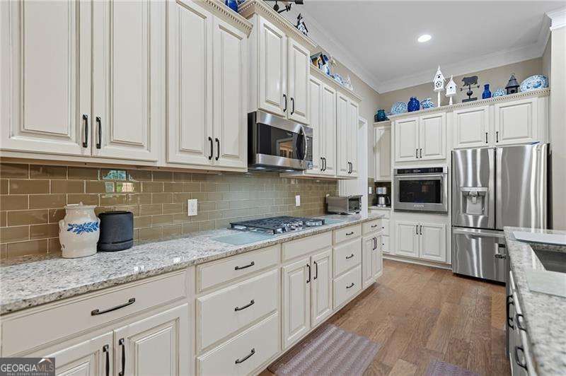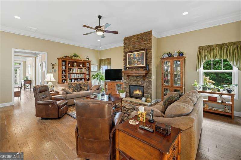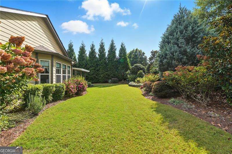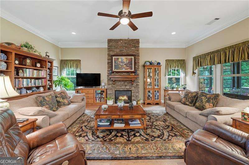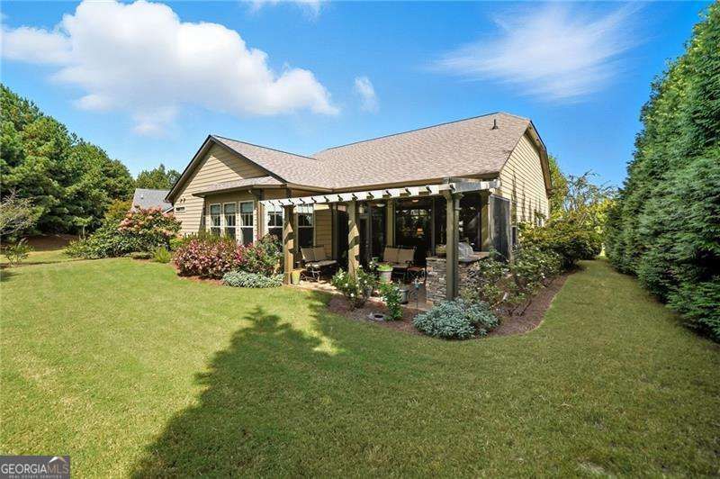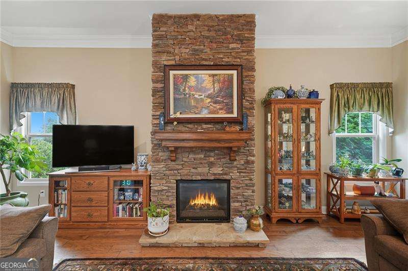 This desirable Preston floorplan sits on a well-landscaped corner lot and offers 3 bedrooms, 3 full baths, an extended garage, butler's pantry, technology center, enclosed porch, and covered patio. The deluxe kitchen features upgraded off-white cabinets, premium stainless-steel appliances, a double wide stainless-steel sink, subway backsplash, and a large walk-in pantry. Main living areas have elegant wide plank wood flooring, 11-foot ceilings, crown molding, extra-wide baseboards, and trey ceilings. The spacious family room boasts a dramatic floor to ceiling stacked stone fireplace, while the master suite includes bay windows, sitting area, dual vanities, frameless walk-in shower, and a large walk-in closet. Additional features include ceiling fans throughout. The home is in Soleil, the premier active adult neighborhood in Georgia. Soleil is located on over 500 acres in the hills just north of Downtown Canton with indoor and outdoor pools, tennis courts, pickleball courts, a tennis center with a full-time pro, a garden area, a greenhouse, and walking trails. The 30,000 square foot clubhouse has a large ballroom, billiard room, card rooms, a craft room, meeting rooms, a large kitchen, a workout room with machines, an exercise room, indoor pool and changing rooms. Soleil has a full-time activity director and over 50 clubs to keep residents busy.