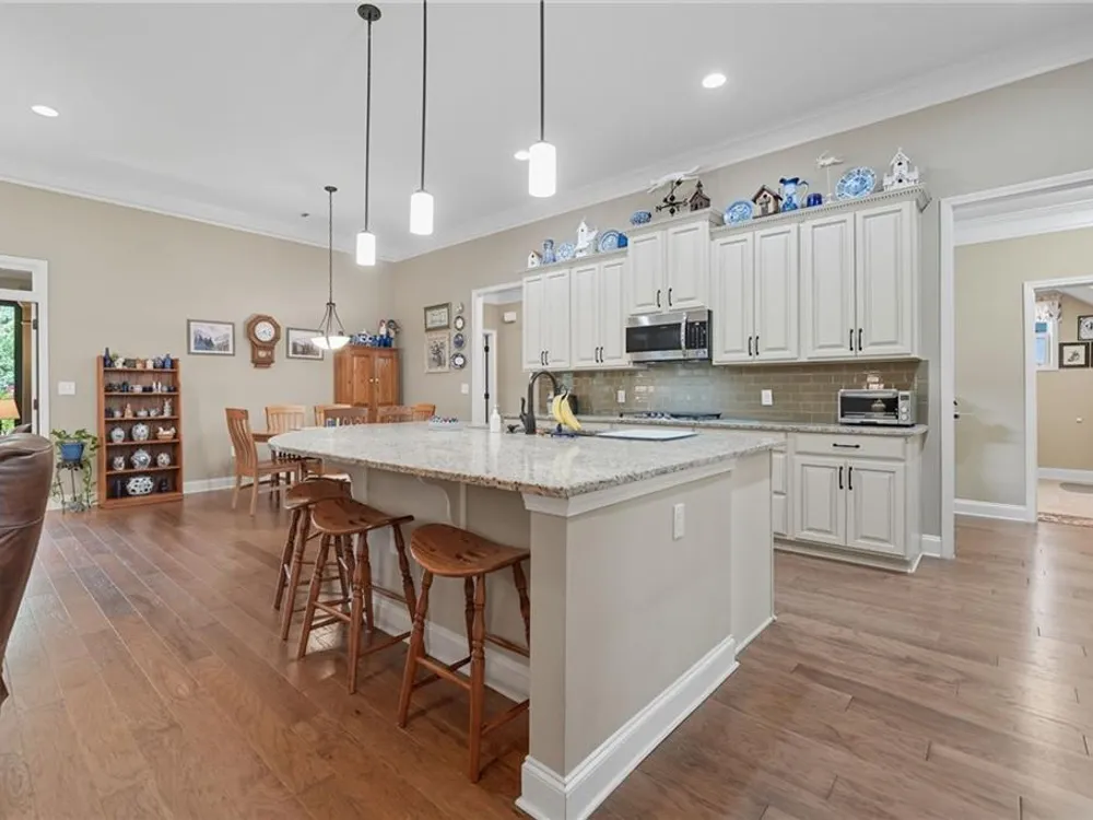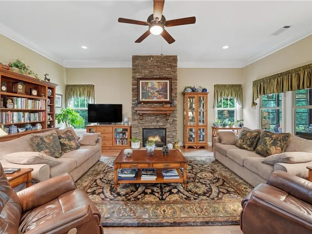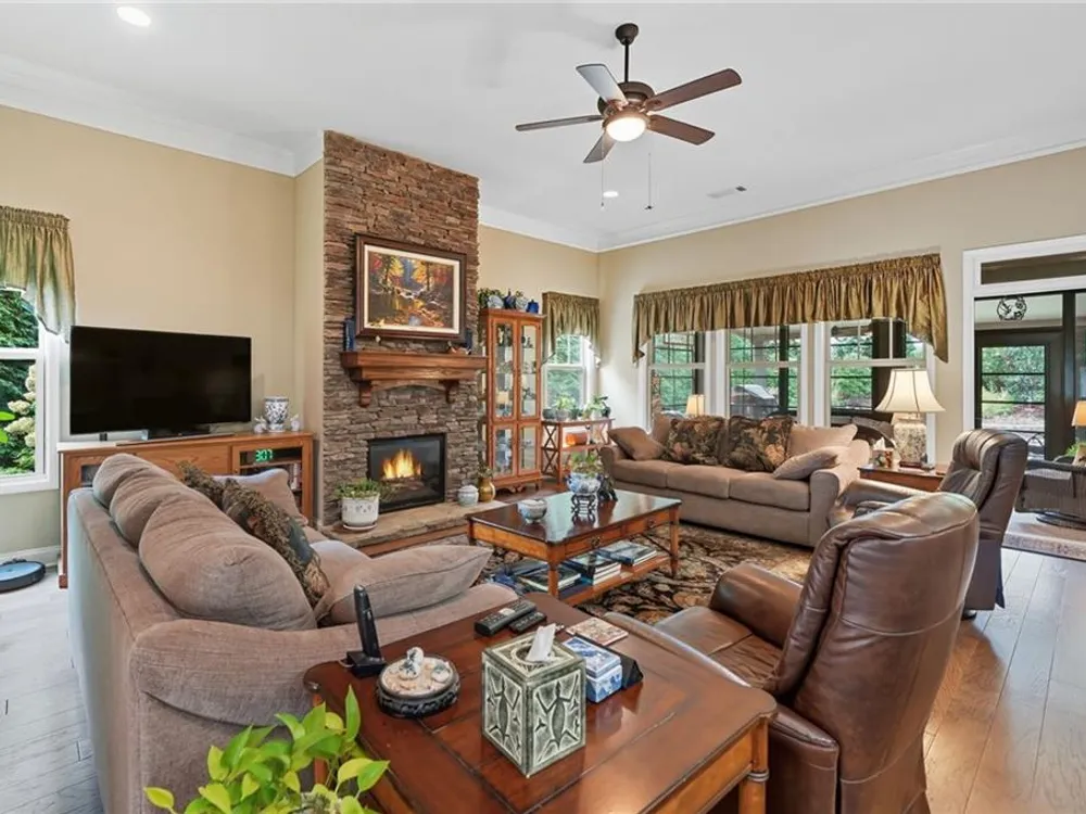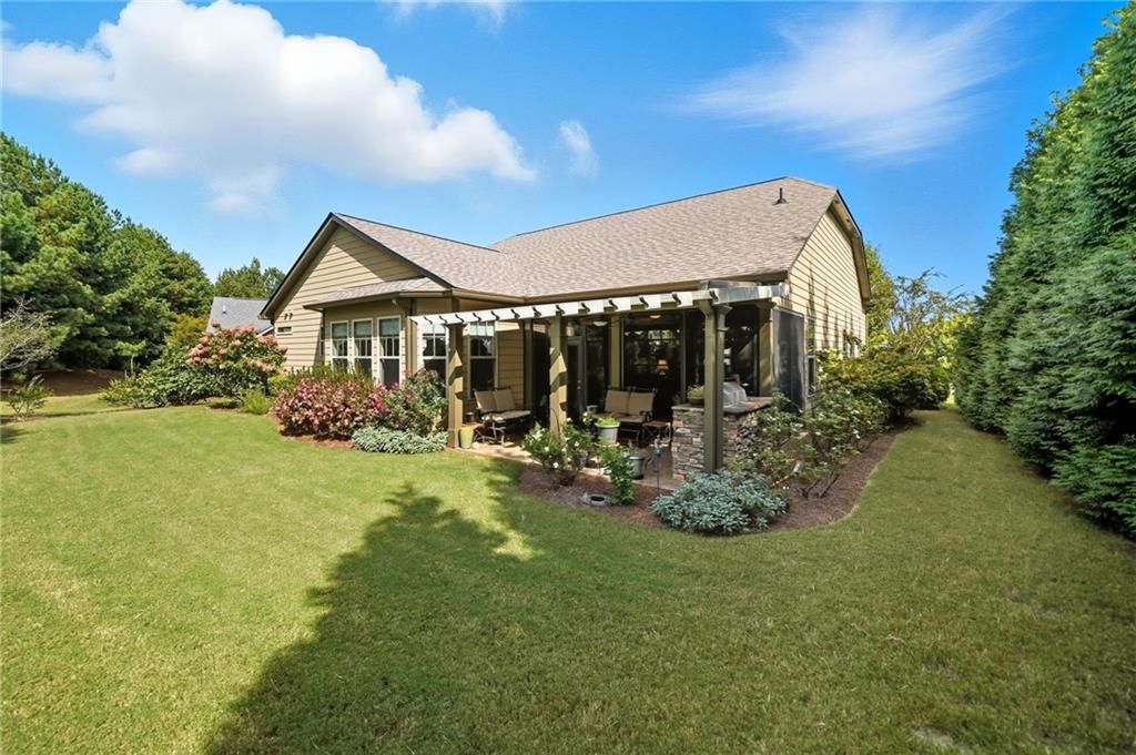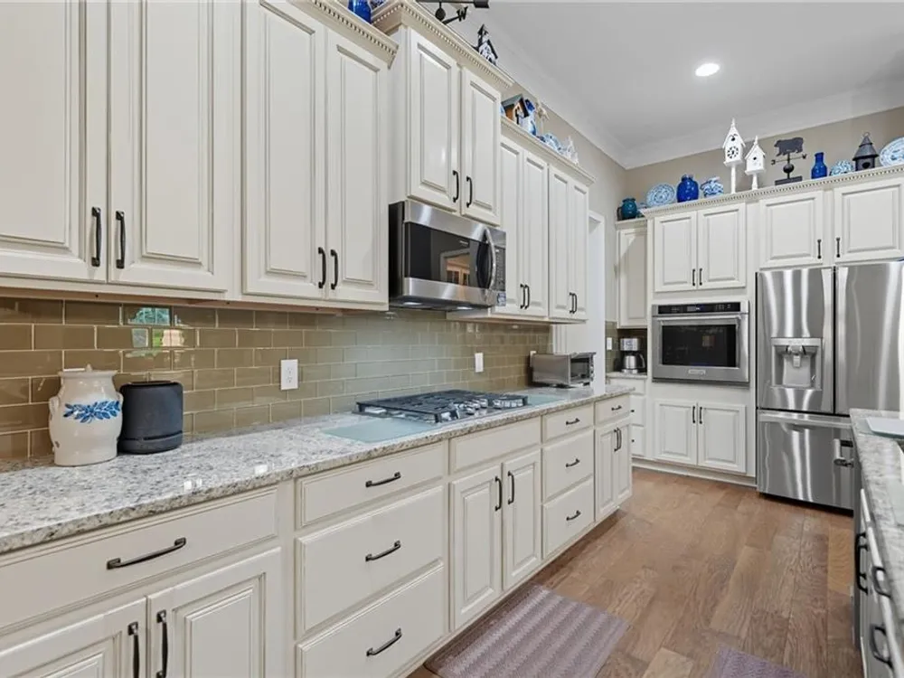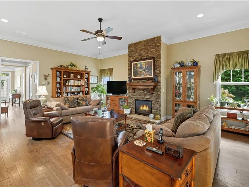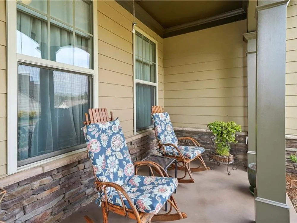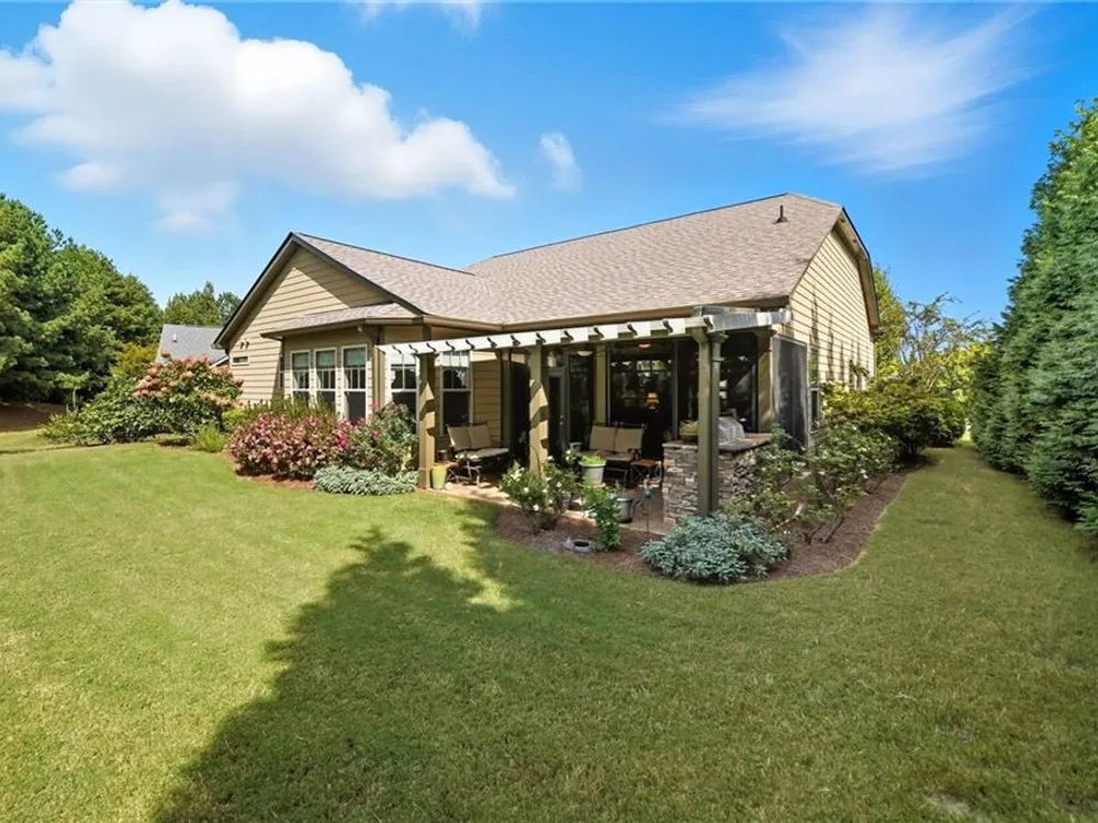 This desirable Preston floorplan sits on a well-landscaped corner lot and offers 3 bedrooms, 3 full baths, an extended garage, butler’s pantry, technology center, enclosed porch, and covered patio. The deluxe kitchen features upgraded off-white cabinets, premium stainless-steel appliances, a double wide stainless-steel sink, subway backsplash, and a large walk-in pantry. Main living areas have elegant wide plank wood flooring, 11-foot ceilings, crown molding, extra-wide baseboards, and trey ceilings. The spacious family room boasts a dramatic floor to ceiling stacked stone fireplace, while the master suite includes bay windows, sitting area, dual vanities, frameless walk-in shower, and a large walk-in closet. Additional features include ceiling fans throughout. The home is in Soleil, the premier active adult neighborhood in Georgia. Soleil is located on over 500 acres in the hills just north of Downtown Canton with indoor and outdoor pools, tennis courts, pickleball courts, a tennis center with a full-time pro, a garden area, a greenhouse, and walking trails. The 30,000 square foot clubhouse has a large ballroom, billiard room, card rooms, a craft room, meeting rooms, a large kitchen, a workout room with machines, an exercise room, indoor pool and changing rooms. Soleil has a full-time activity director and over 50 clubs to keep residents busy.