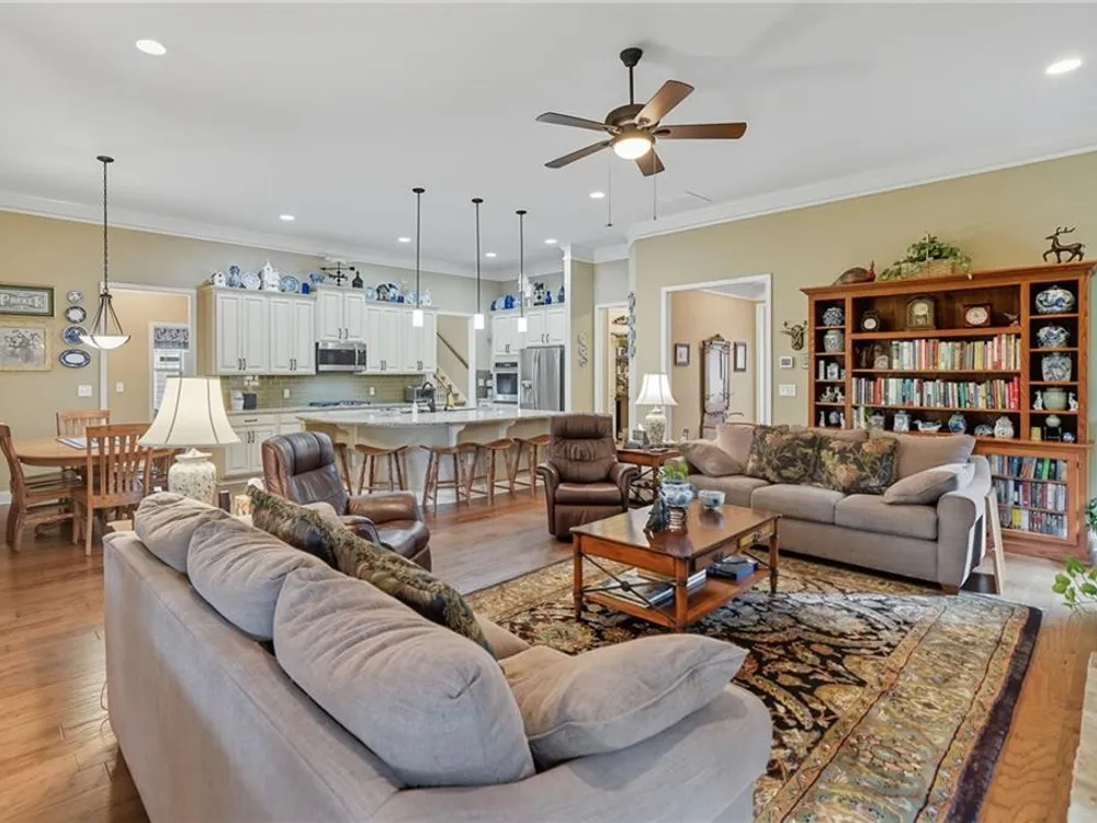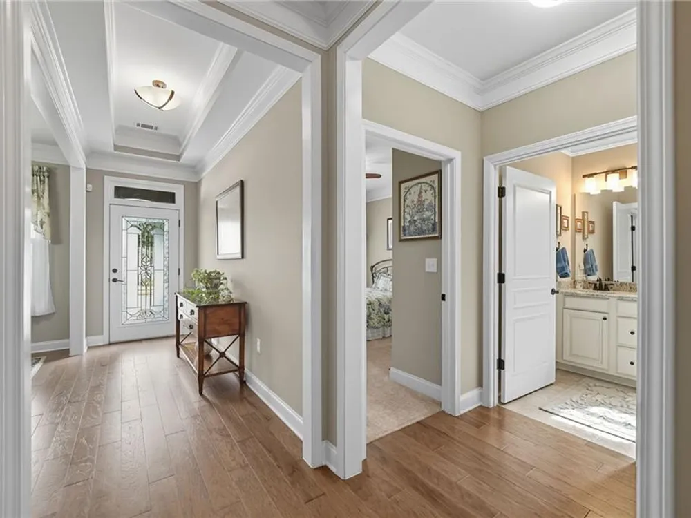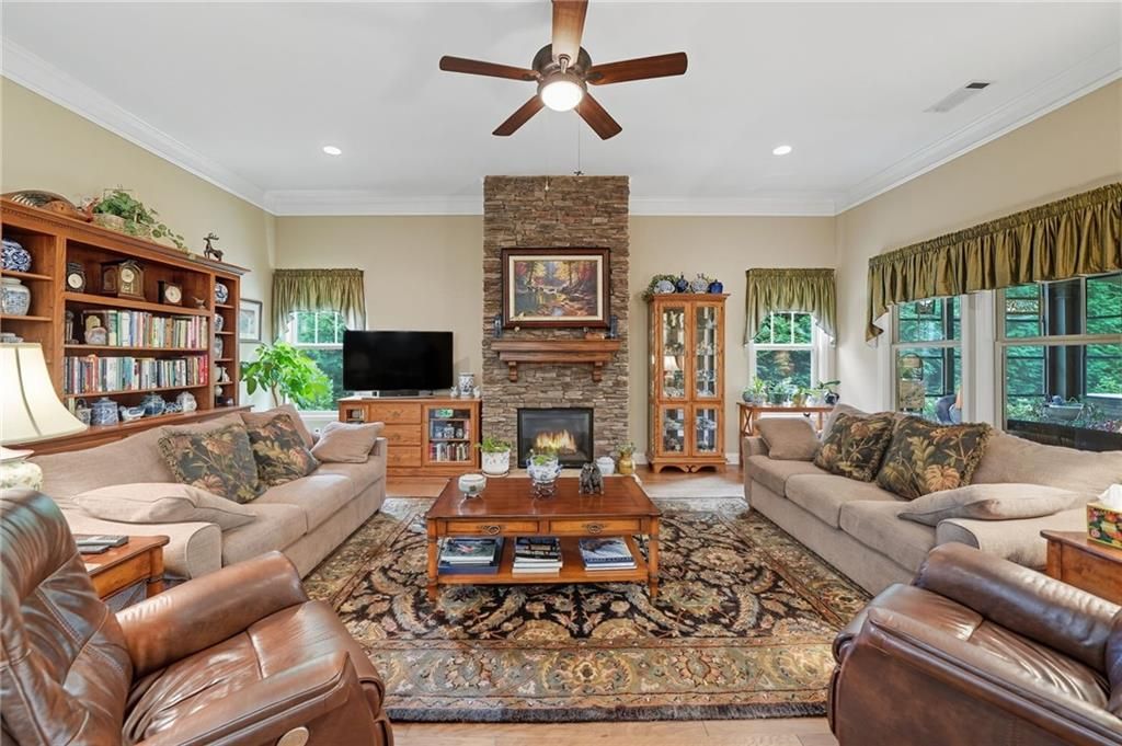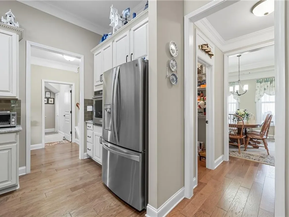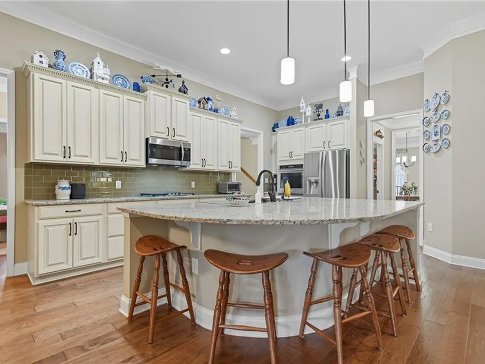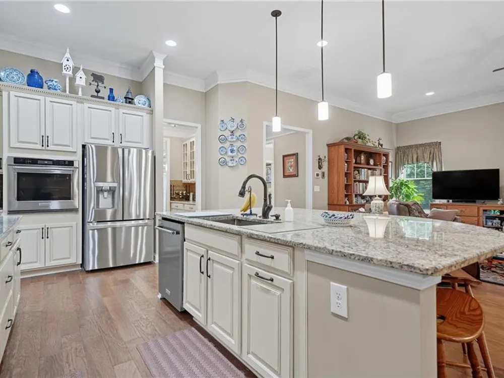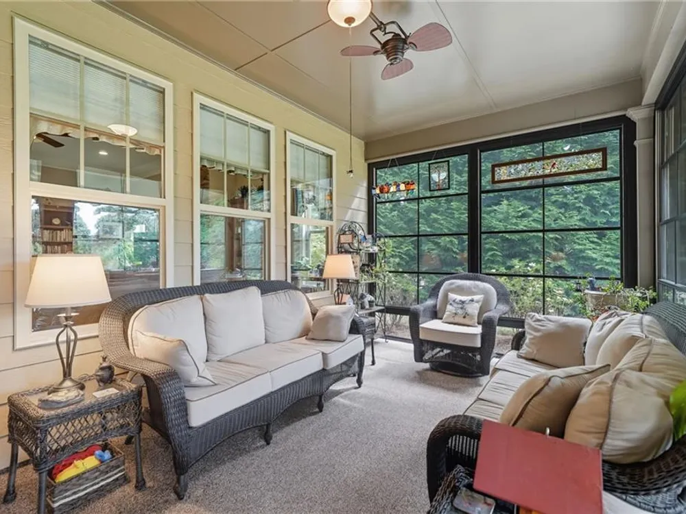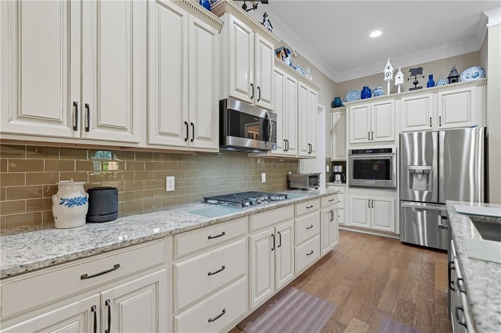 This desirable Preston floorplan sits on a well-landscaped corner lot and offers 3 bedrooms, 3 full baths, an extended garage, butler’s pantry, technology center, enclosed porch, and covered patio. The deluxe kitchen features upgraded off-white cabinets, premium stainless-steel appliances, a double wide stainless-steel sink, subway backsplash, and a large walk-in pantry. Main living areas have elegant wide plank wood flooring, 11-foot ceilings, crown molding, extra-wide baseboards, and trey ceilings. The spacious family room boasts a dramatic floor to ceiling stacked stone fireplace, while the master suite includes bay windows, sitting area, dual vanities, frameless walk-in shower, and a large walk-in closet. Additional features include ceiling fans throughout. The home is in Soleil, the premier active adult neighborhood in Georgia. Soleil is located on over 500 acres in the hills just north of Downtown Canton with indoor and outdoor pools, tennis courts, pickleball courts, a tennis center with a full-time pro, a garden area, a greenhouse, and walking trails. The 30,000 square foot clubhouse has a large ballroom, billiard room, card rooms, a craft room, meeting rooms, a large kitchen, a workout room with machines, an exercise room, indoor pool and changing rooms. Soleil has a full-time activity director and over 50 clubs to keep residents busy.