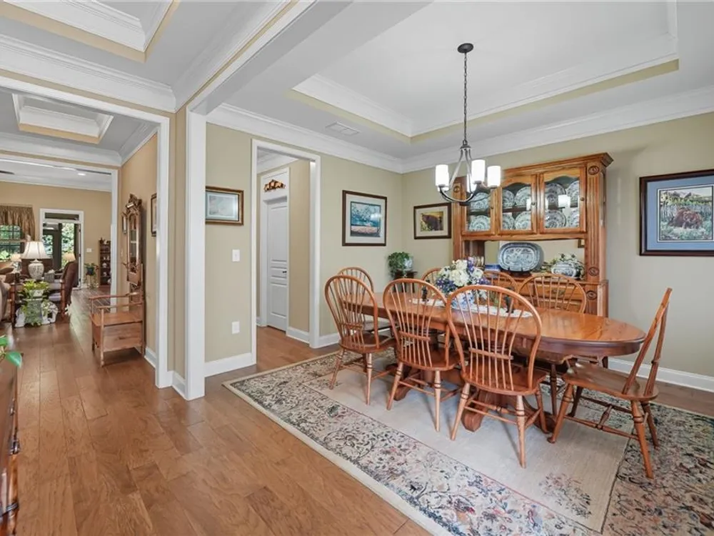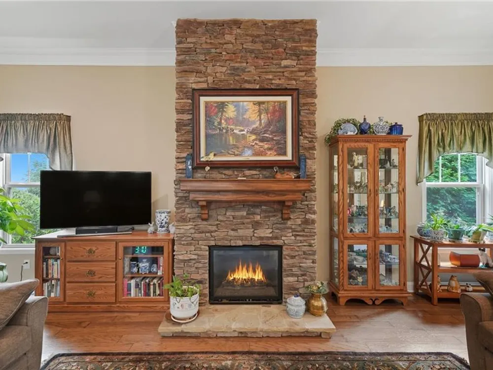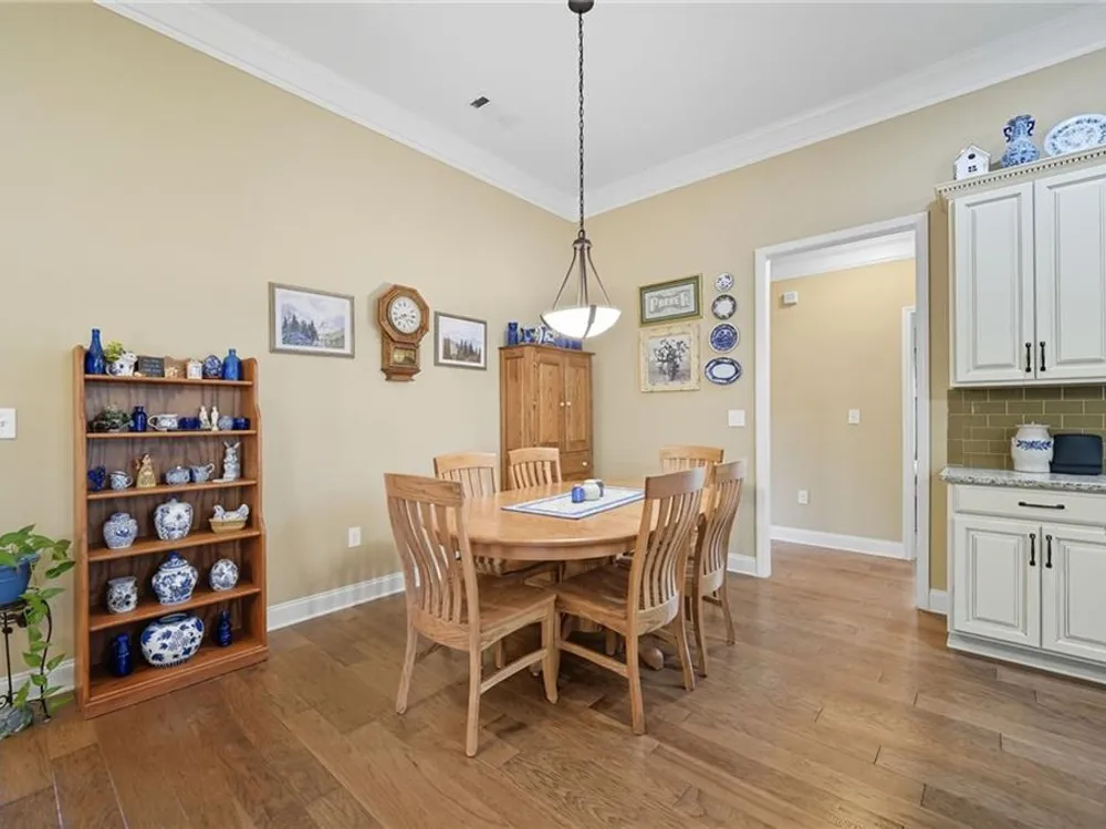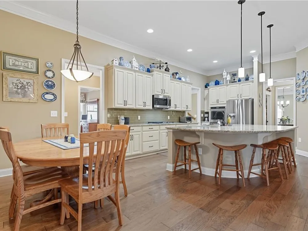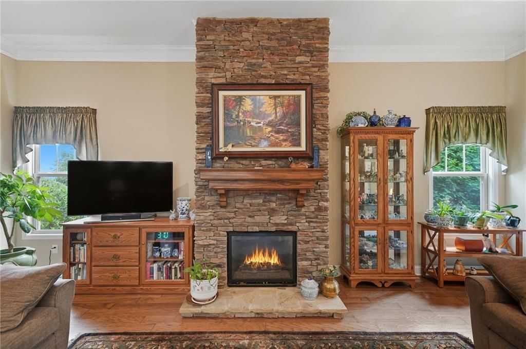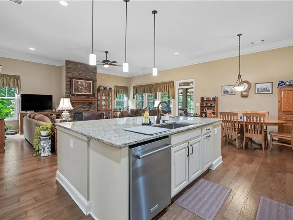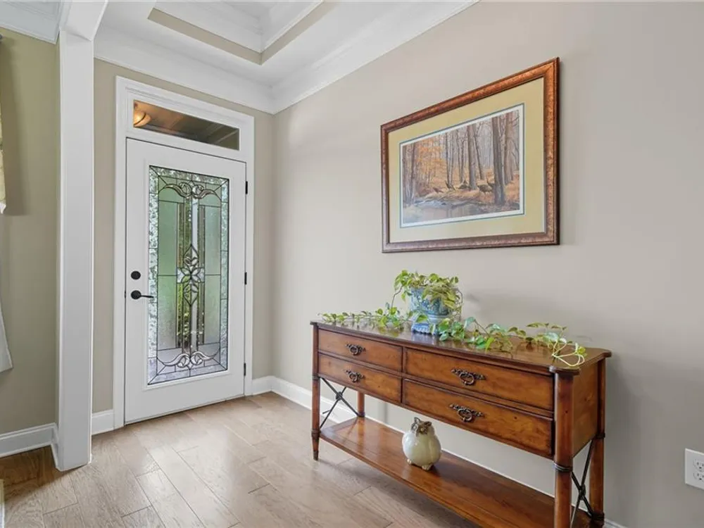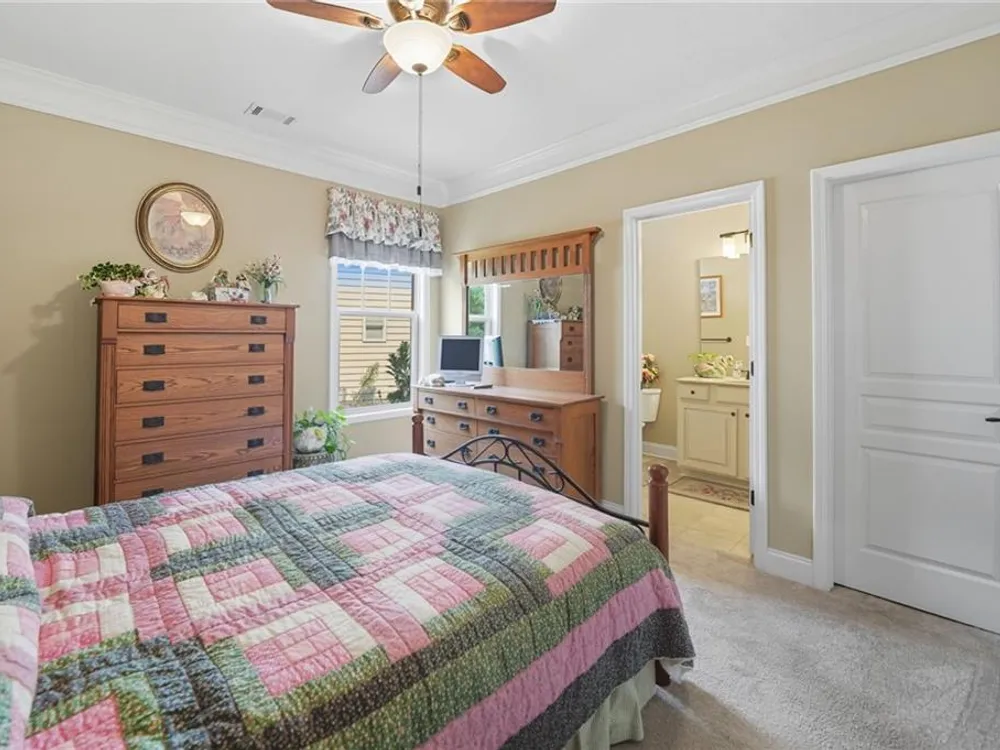 This desirable Preston floorplan sits on a well-landscaped corner lot and offers 3 bedrooms, 3 full baths, an extended garage, butler’s pantry, technology center, enclosed porch, and covered patio. The deluxe kitchen features upgraded off-white cabinets, premium stainless-steel appliances, a double wide stainless-steel sink, subway backsplash, and a large walk-in pantry. Main living areas have elegant wide plank wood flooring, 11-foot ceilings, crown molding, extra-wide baseboards, and trey ceilings. The spacious family room boasts a dramatic floor to ceiling stacked stone fireplace, while the master suite includes bay windows, sitting area, dual vanities, frameless walk-in shower, and a large walk-in closet. Additional features include ceiling fans throughout. The home is in Soleil, the premier active adult neighborhood in Georgia. Soleil is located on over 500 acres in the hills just north of Downtown Canton with indoor and outdoor pools, tennis courts, pickleball courts, a tennis center with a full-time pro, a garden area, a greenhouse, and walking trails. The 30,000 square foot clubhouse has a large ballroom, billiard room, card rooms, a craft room, meeting rooms, a large kitchen, a workout room with machines, an exercise room, indoor pool and changing rooms. Soleil has a full-time activity director and over 50 clubs to keep residents busy.