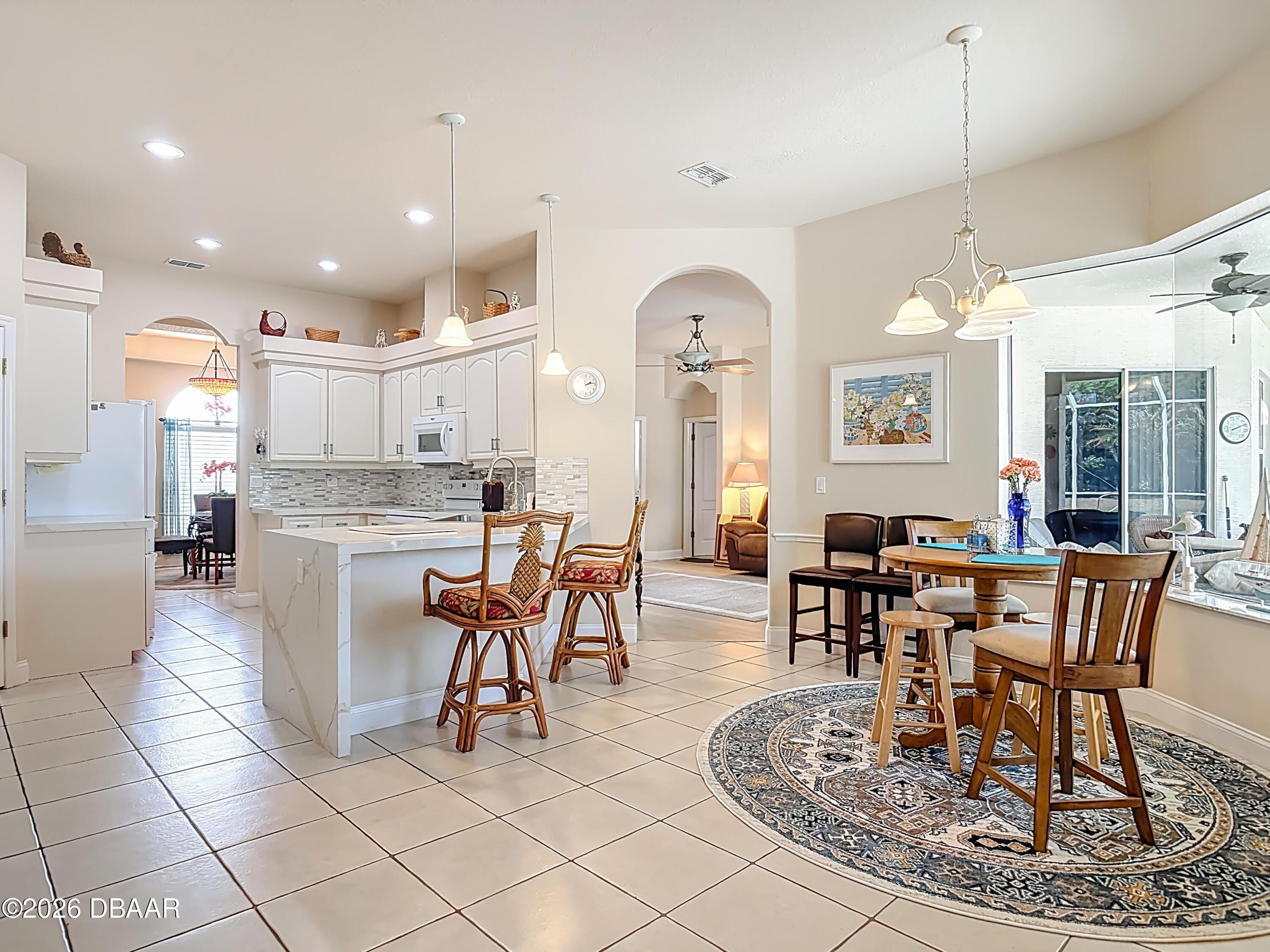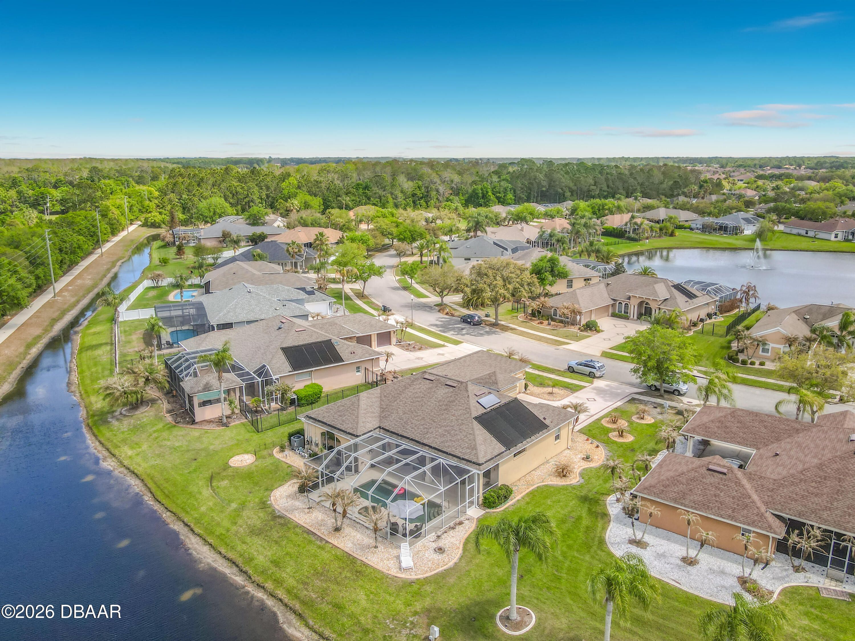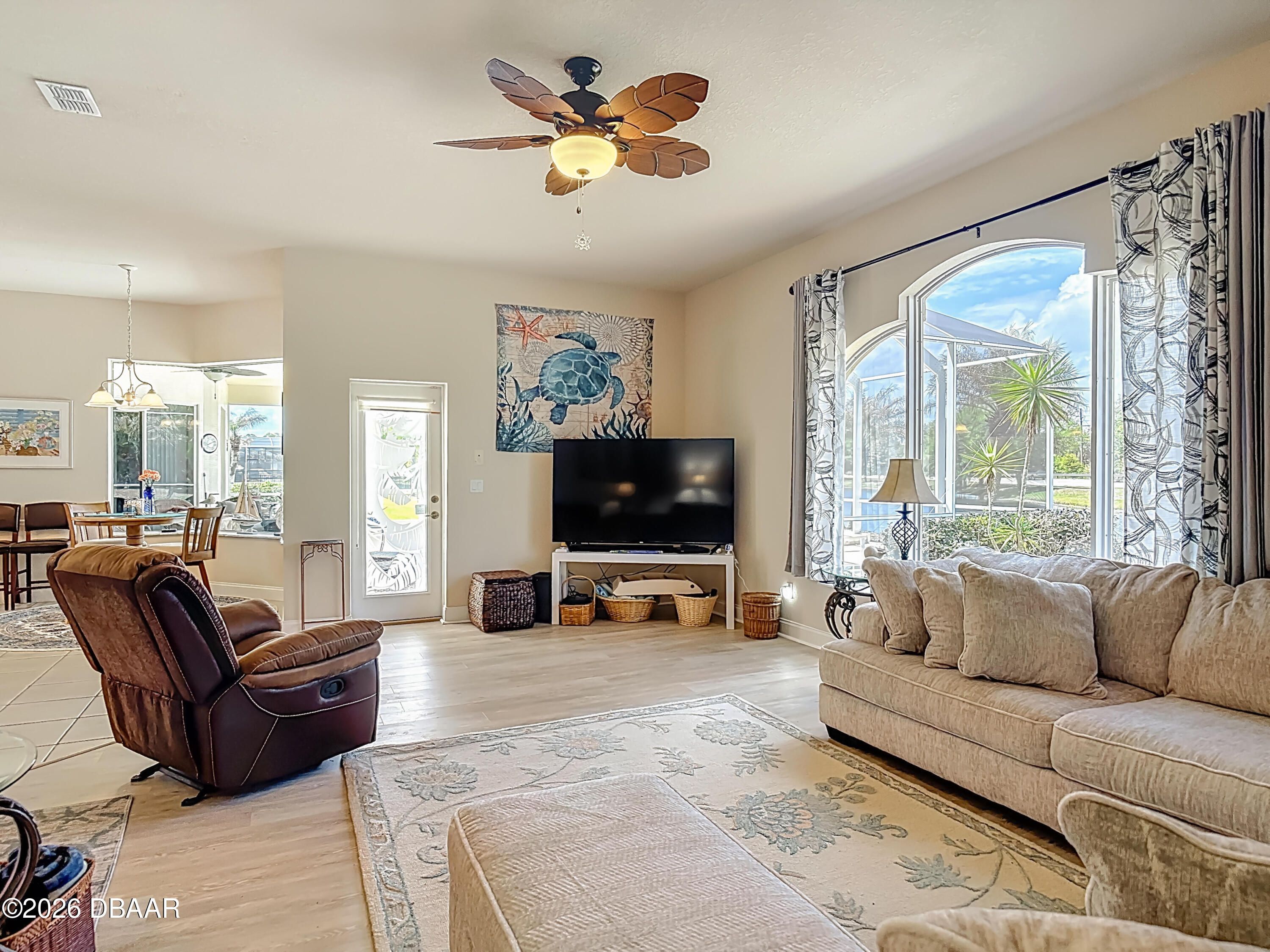 Location, location, location! In the heart of New Smyrna Beach, this lakefront home offers stunning sunset views in a desirable golf community. This 3-bedroom, 2-bath home features a split floor plan for privacy, with a spacious primary suite including a walk-in closet, Jacuzzi tub, separate shower, and direct access to the lanai and solar-heated saltwater pool with an outdoor jacuzzi for added relaxation. Two guest bedrooms share the second bathroom. The open kitchen boasts waterfall quartz countertops, 12-ft ceilings, fans in every room, and waterproof vinyl plank flooring throughout. Enjoy lake and pool views from most rooms, plus a large family room ideal for entertaining. Additional features include a solar pool heater and newer high-quality heater, large laundry room with sink and storage, and a 3-car garage with attic access and built-in racks. A rare lakefront opportunity in New Smyrna Beach!