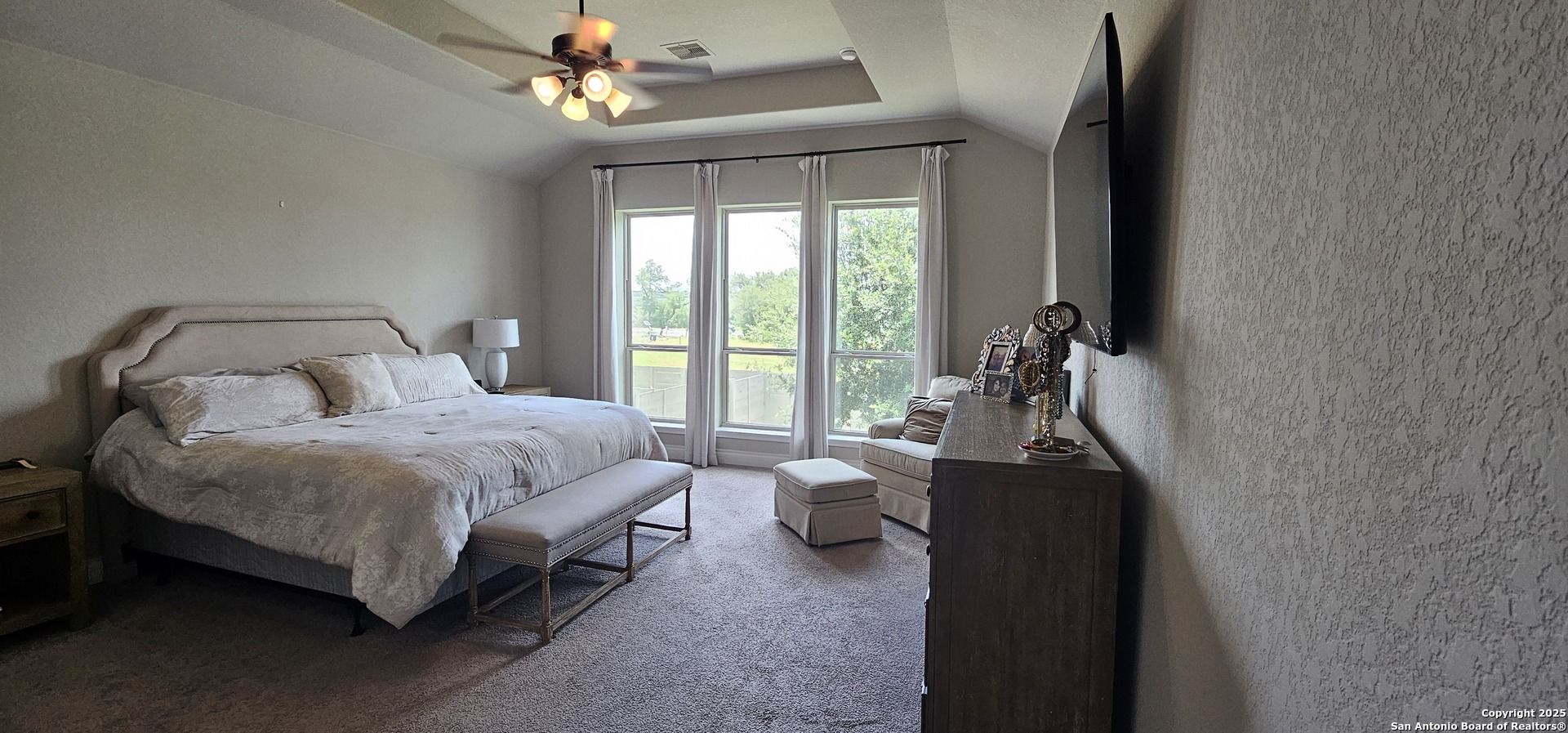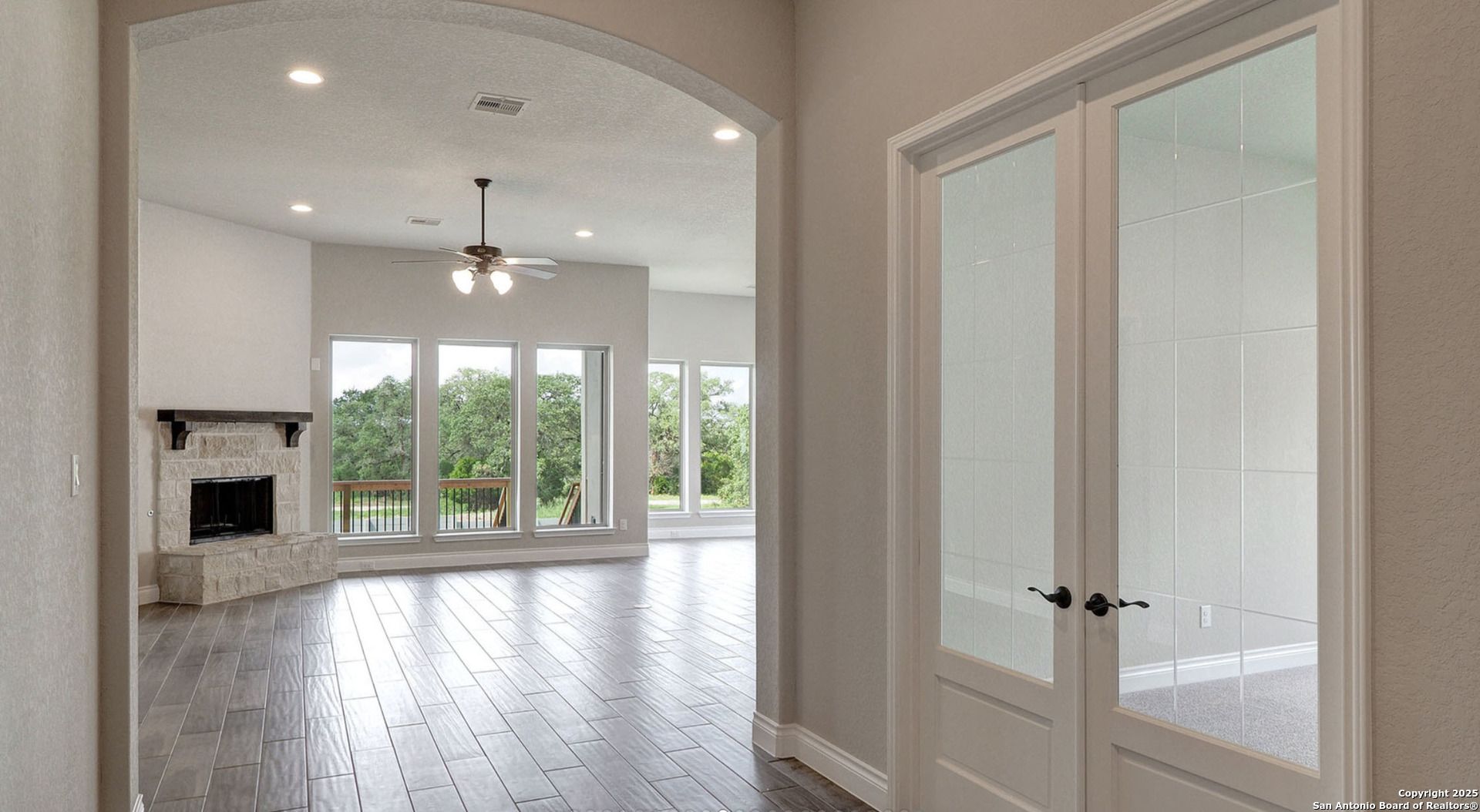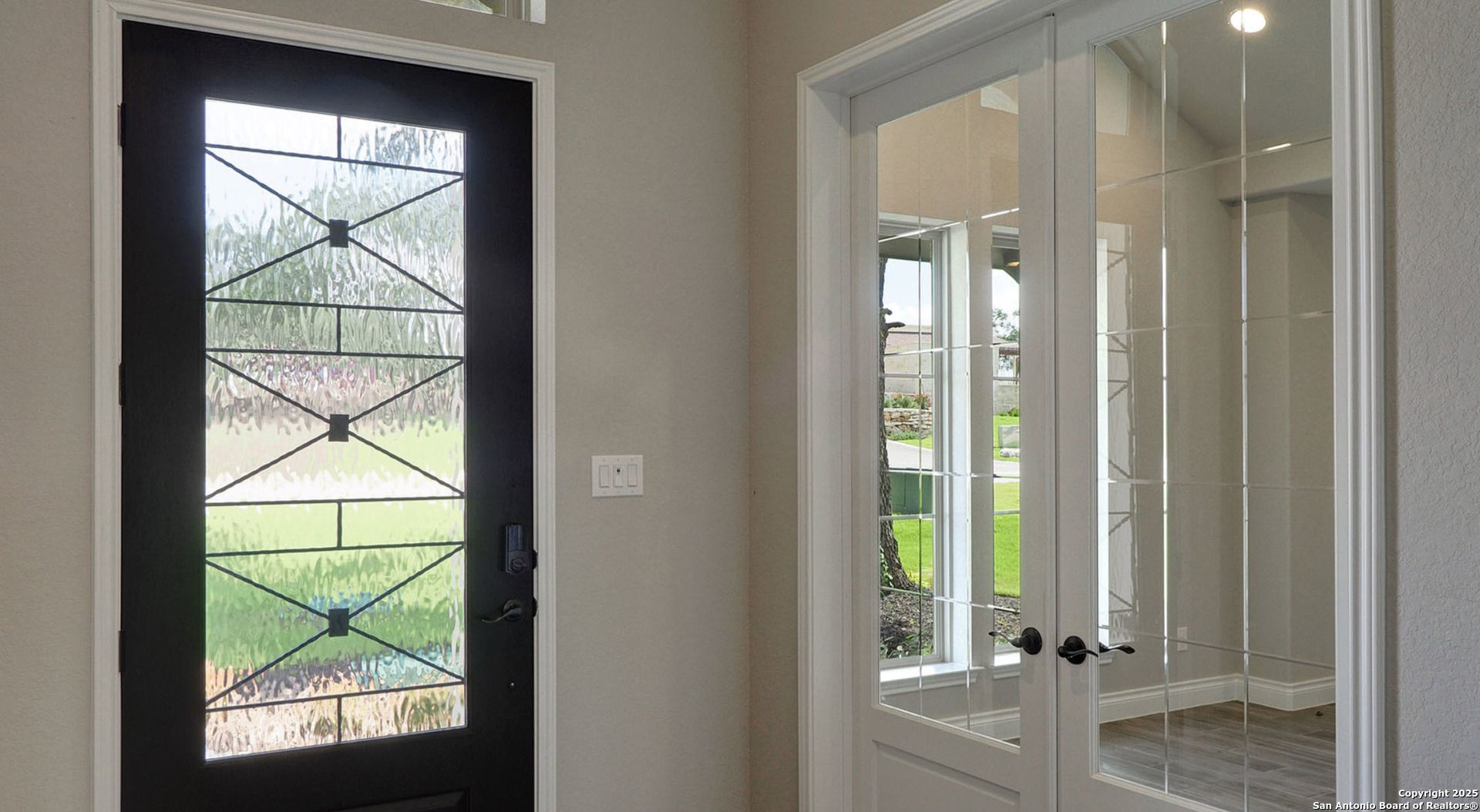Ready to find your dream home? Step inside this gorgeous Perry Home, where peace and privacy are yours with no front or back neighbors. You'll feel the difference on this expansive 80-foot-wide lot, starting with the striking mahogany front door that welcomes you. Natural light floods the home through walls of windows in the kitchen, family room, and master bedroom, creating a bright and airy feel. The open-concept layout makes it easy to move from the gourmet kitchen, with its oversized island, to the cozy family room, complete with a fireplace and elegant ceramic tile floors. This home is designed for both work and play. Find a quiet spot to focus in the private library, featuring French doors and a stunning 13-foot ceiling, or host game night in the dedicated game room, also with French doors. The master suite is your personal sanctuary. Relax with a wall of windows, a huge walk-in closet, and a luxurious bathroom boasting dual vanities, a garden tub, and a separate glass-enclosed shower. An additional guest suite with a full bath ensures visitors feel right at home. Beyond the home's beauty, you'll love the convenience. Enjoy peace of mind with a 10-year Perry Home foundation warranty. Plus, the location is unbeatable-simply walk across the street to the community gym and pool, or take a quick 5-minute golf cart ride to the incredible Vintage Oaks amenities, including the lazy river.