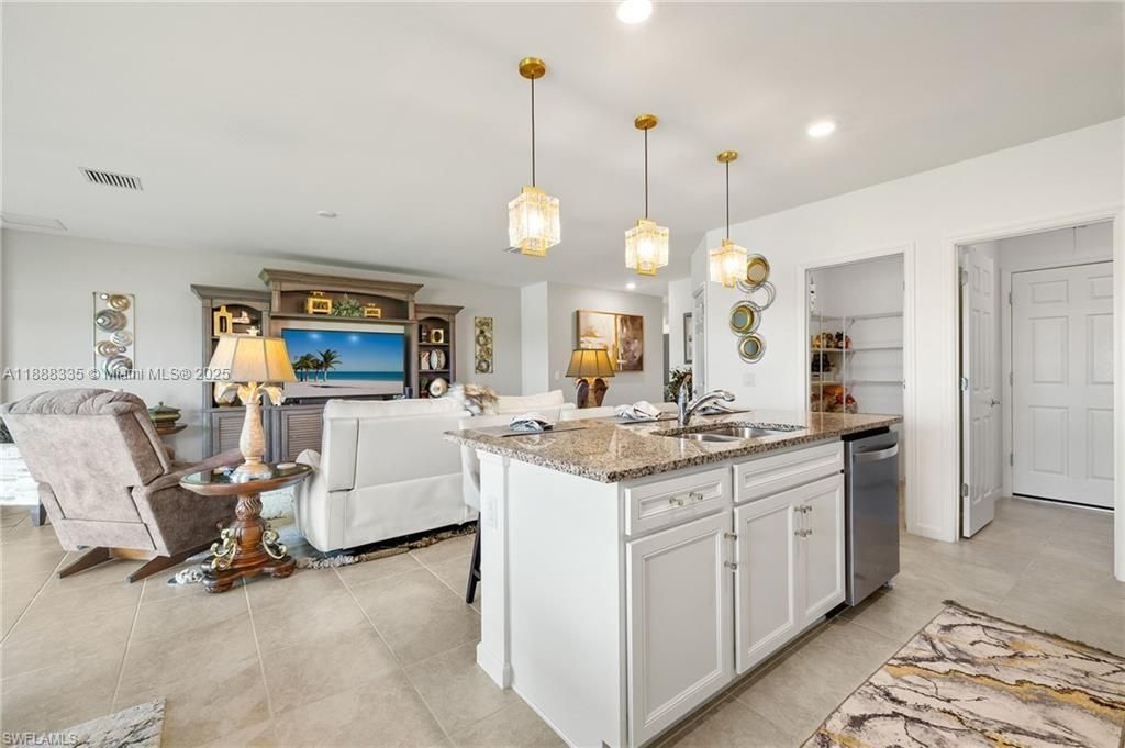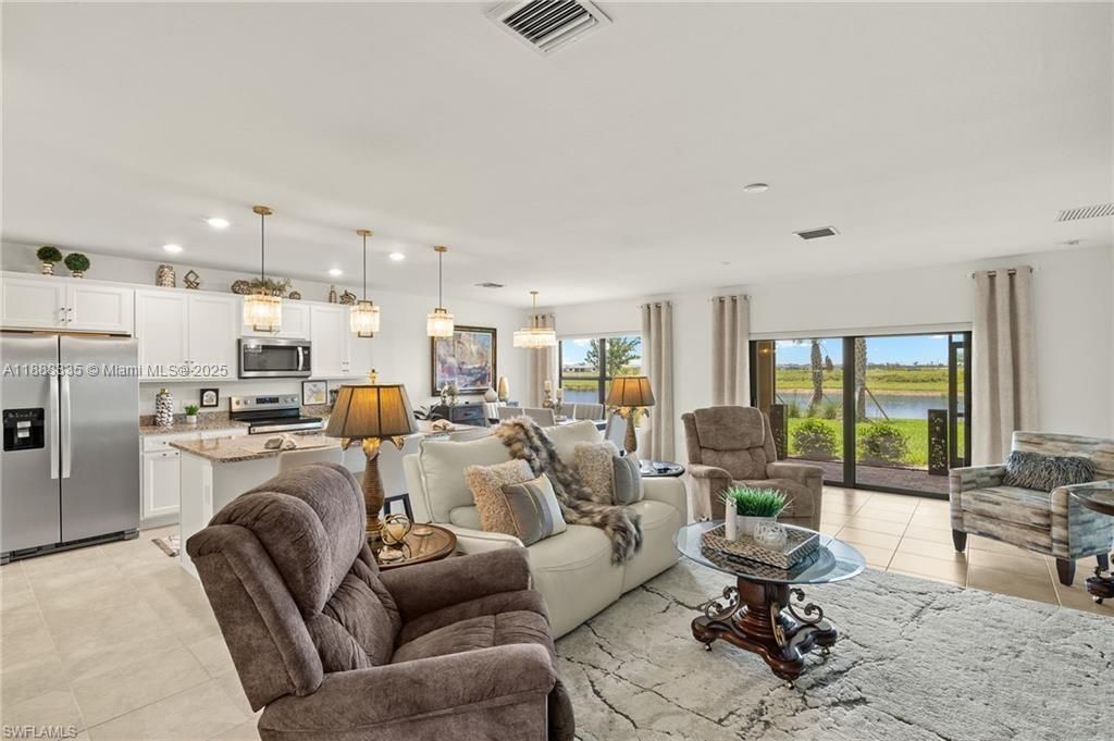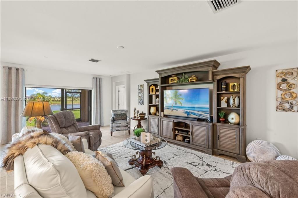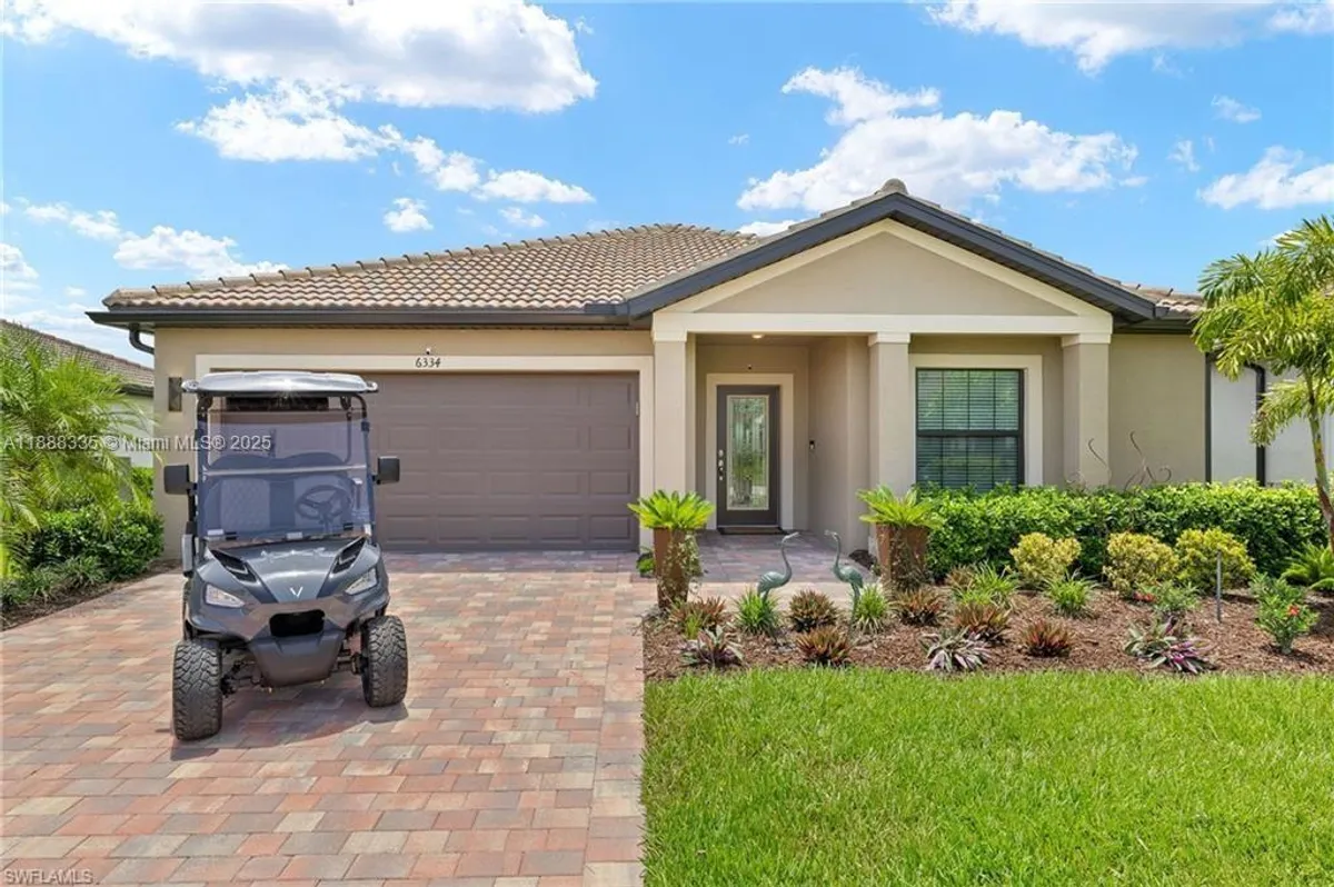 Unbelievable fully furnished turn-key Dolce model with 3 bedrooms, 2 baths, elegant furnishings, and a $13k golf cart! Home offers split floor plan, tiled living areas, luxury light fixtures, wall art, rugs, powered loveseat, recliners, power shades, ceiling fans, dining set, and full bedroom suites with king and twin beds on power bases. Perfect winter retreat! Located in Del Webb Naples, a premier 55+ resort community, residents enjoy two clubhouses with 30,000+ sq. ft. of amenities—resort-style pools, fitness center, movement studio, golf simulator, fire pit lounge, and on-site dining. Outdoor fun includes optional 18-hole golf, 12 pickleball courts, tennis, bocce, garden, and miles of trails. With endless activities and events, Del Webb offers the ultimate active adult lifestyle.