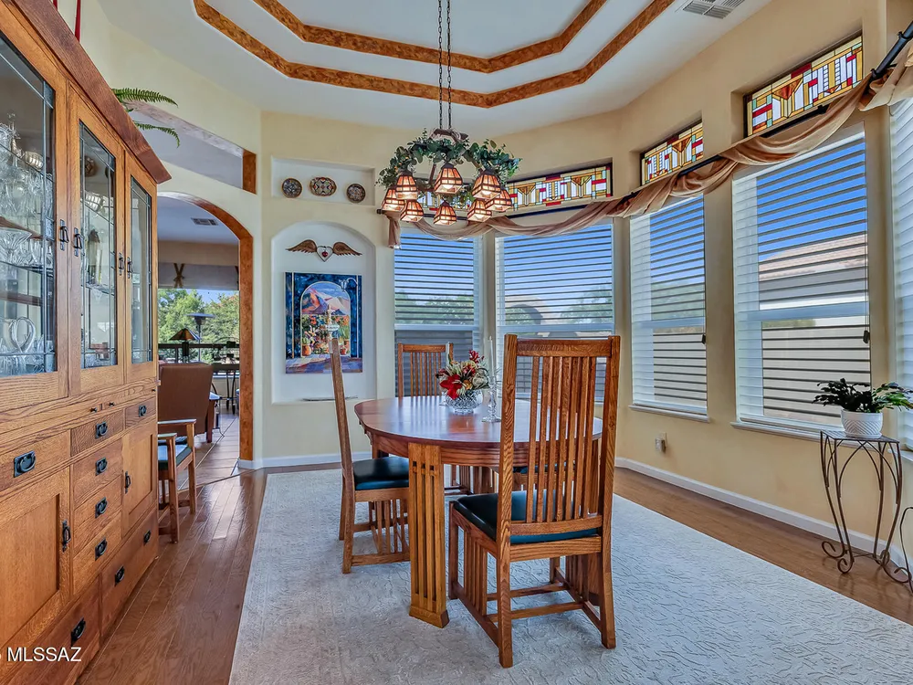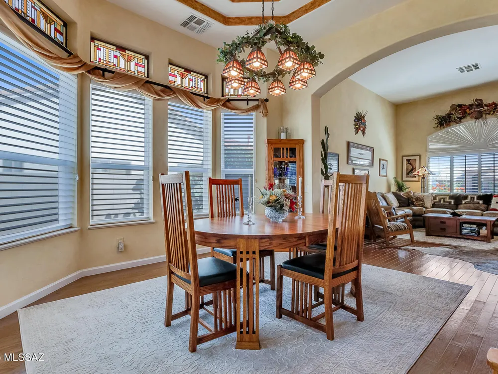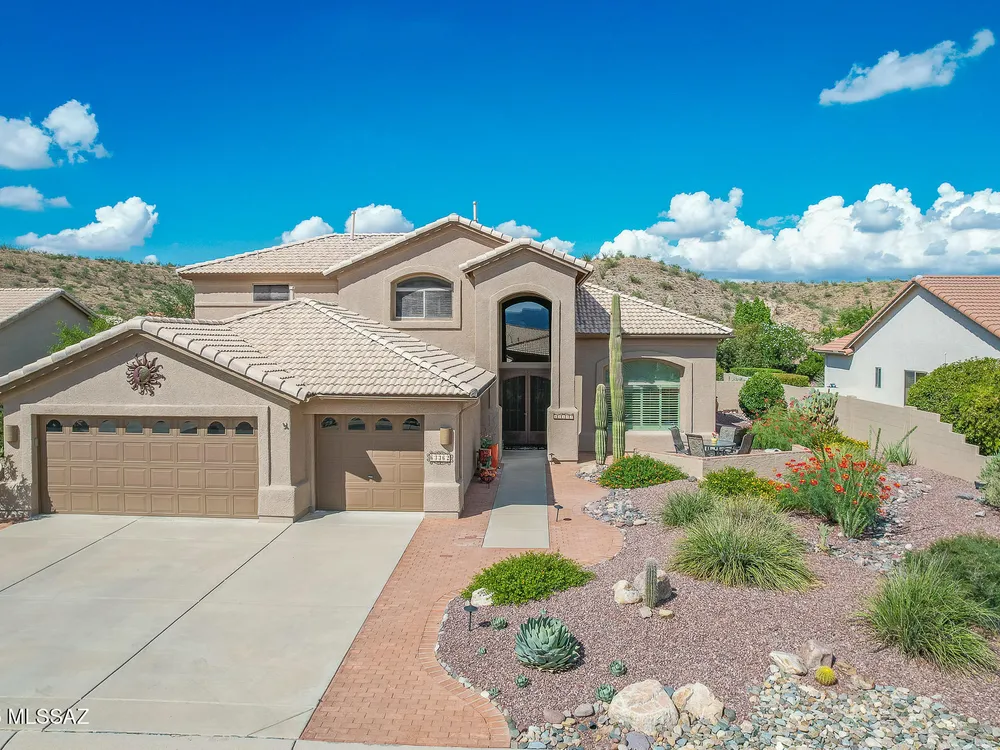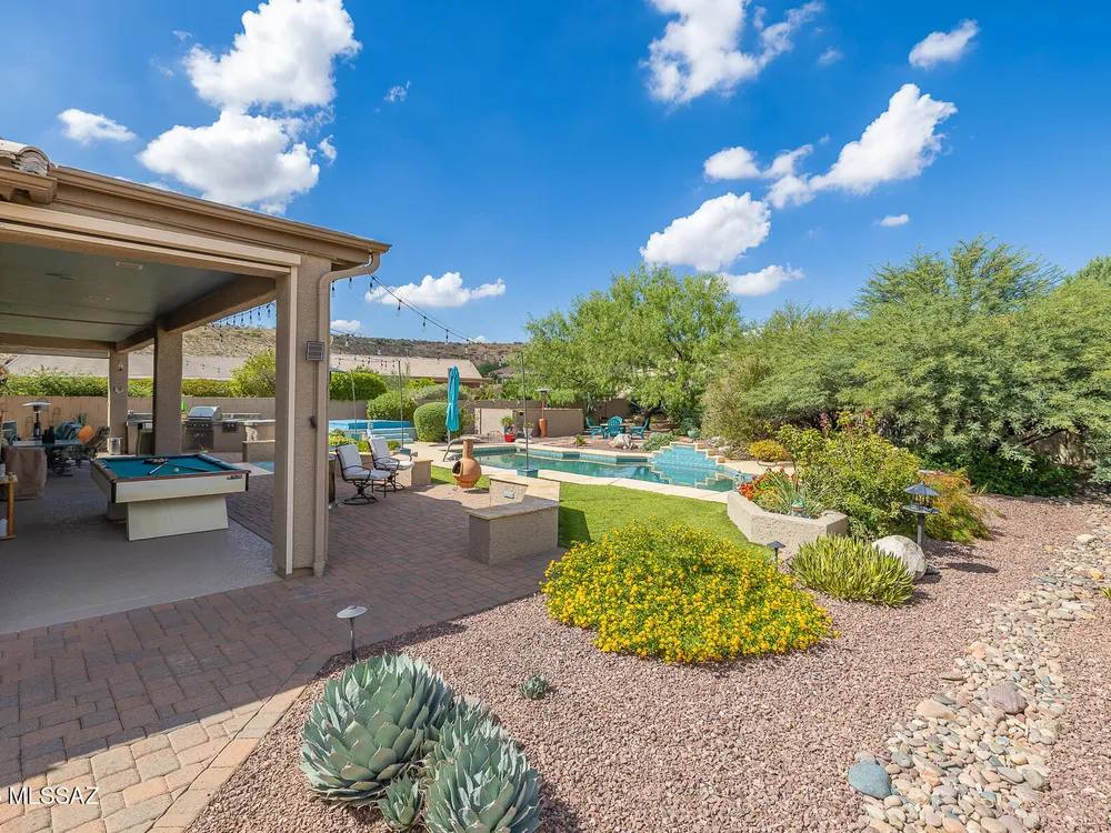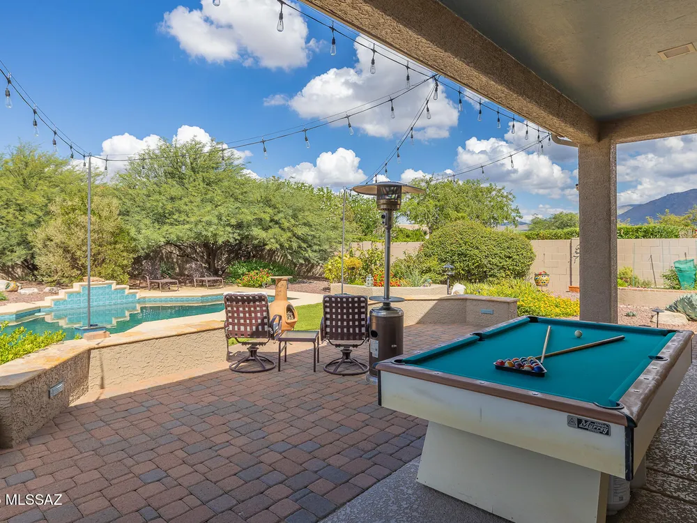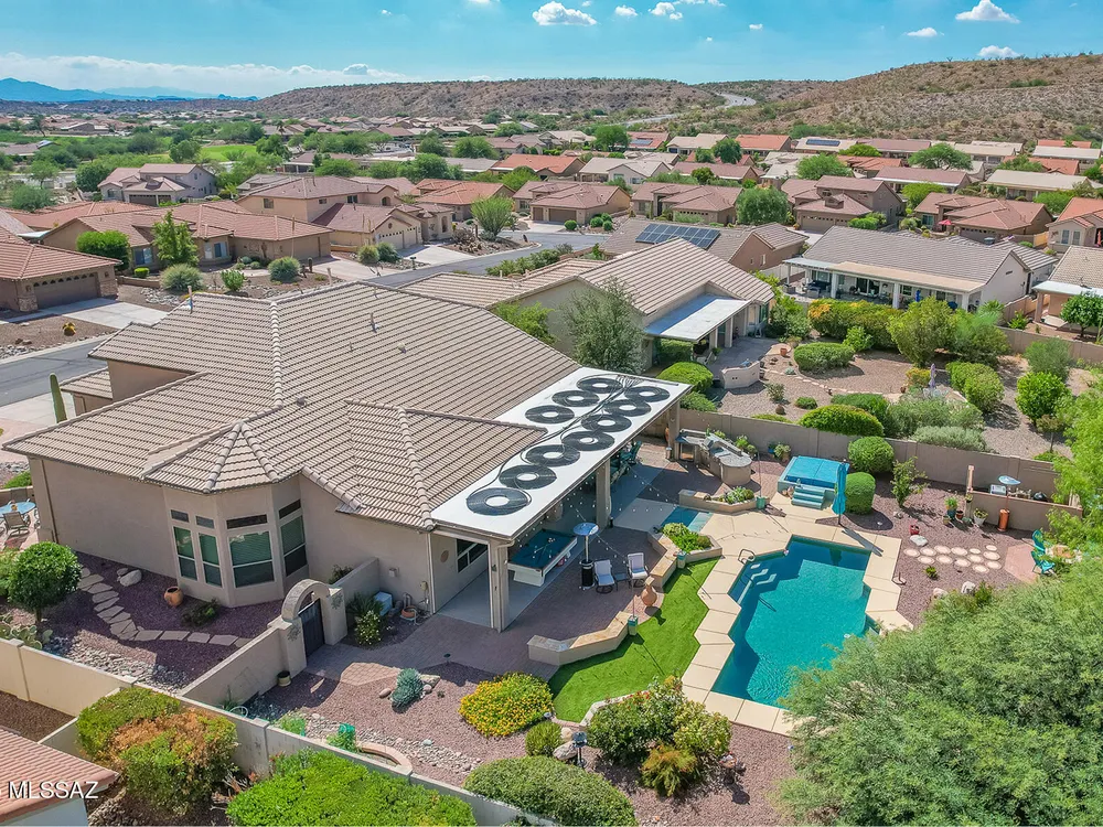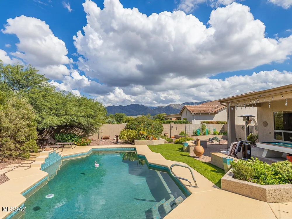 LUXURIOUS DESERT RETREAT boasts architectural detail throughout plus a large resort-style yard with solar heated pool, hot tub, billiards table, plus Catalina Mountain and hillside views. This elegant 3BD/2.5BA +Den (3,237 sq ft) two-story Sundance model of 2x6 construction offers a large Owner's Suite on main level. Front paver courtyard with views flows to a dramatic foyer with winding wood banister staircase, elegant engineered wood flooring, soaring & recessed ceilings, plus formal living room with dramatic picture window and dining room with 5-panel bay window with upper stained glass inserts. Beyond lies a spacious Den and open concept Great room with walls of windows, built-in media center with fireplace, and breakfast nook with built-in buffet. Gourmet kitchen is a delight with