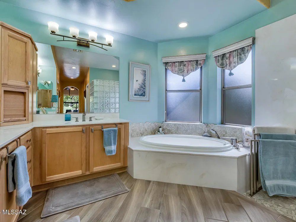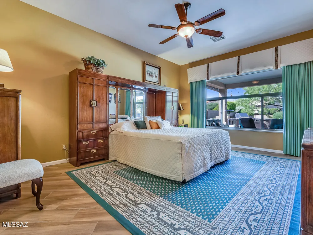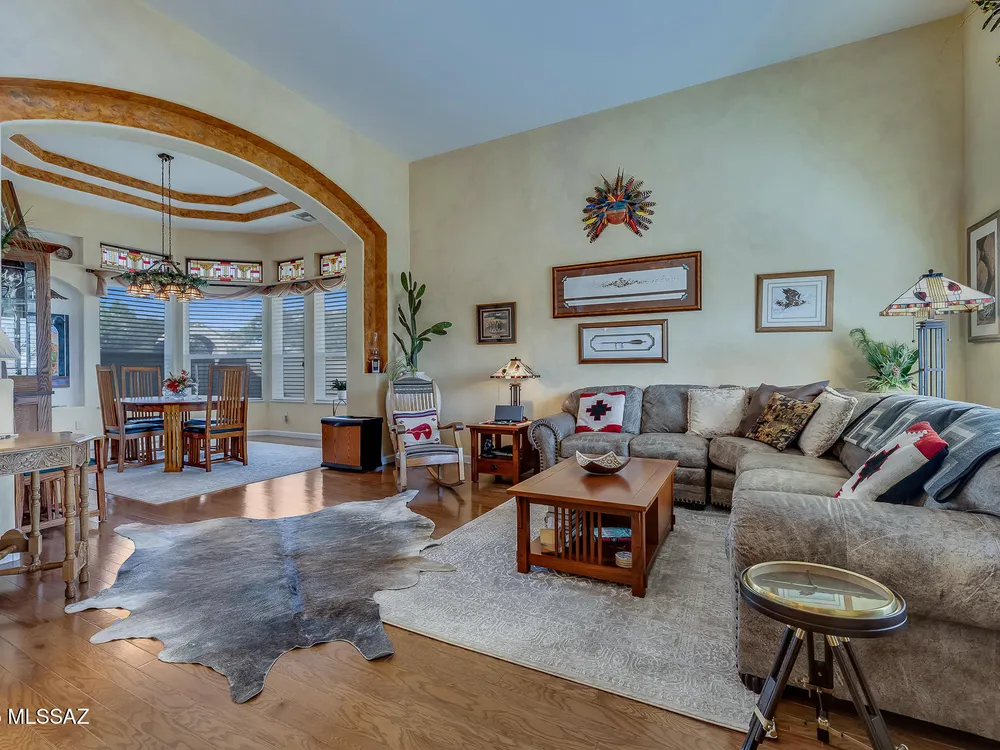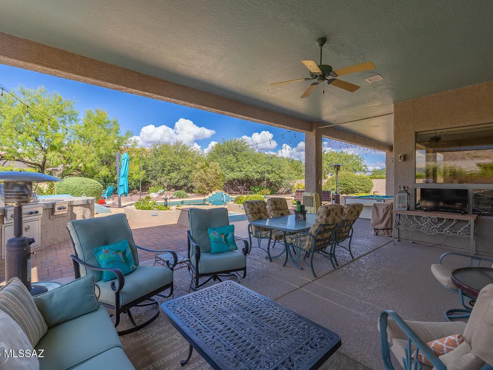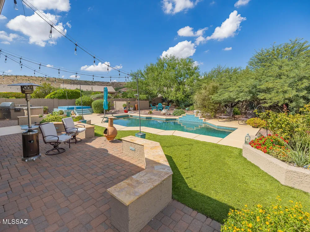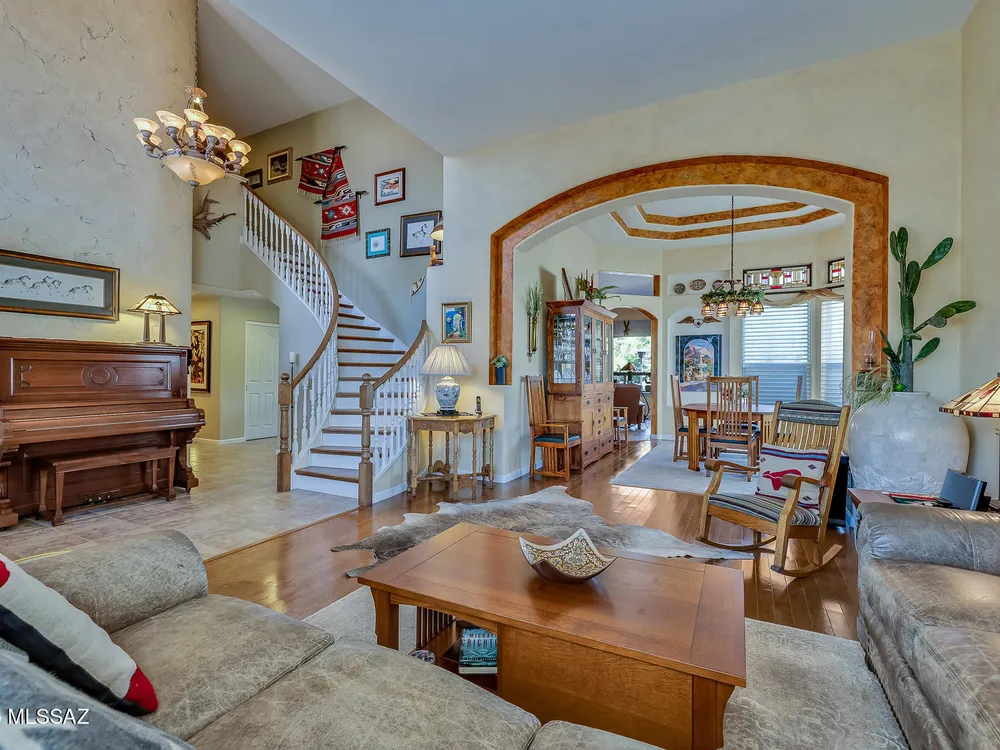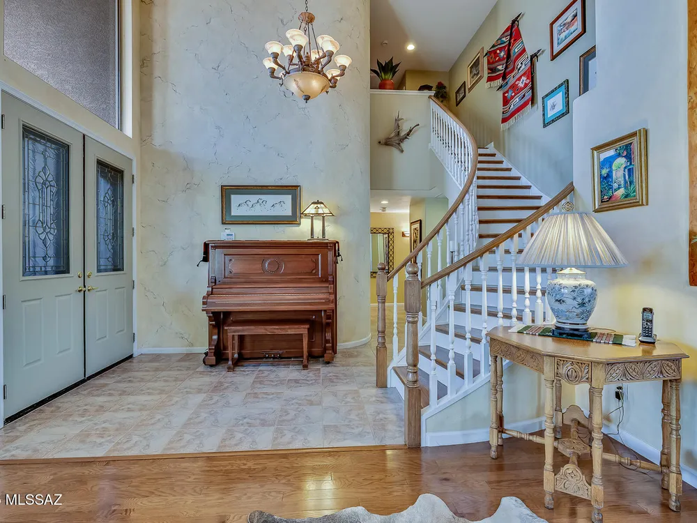 LUXURIOUS DESERT RETREAT boasts architectural detail throughout plus a large resort-style yard with solar heated pool, hot tub, billiards table, plus Catalina Mountain and hillside views. This elegant 3BD/2.5BA +Den (3,237 sq ft) two-story Sundance model of 2x6 construction offers a large Owner's Suite on main level. Front paver courtyard with views flows to a dramatic foyer with winding wood banister staircase, elegant engineered wood flooring, soaring & recessed ceilings, plus formal living room with dramatic picture window and dining room with 5-panel bay window with upper stained glass inserts. Beyond lies a spacious Den and open concept Great room with walls of windows, built-in media center with fireplace, and breakfast nook with built-in buffet. Gourmet kitchen is a delight with
