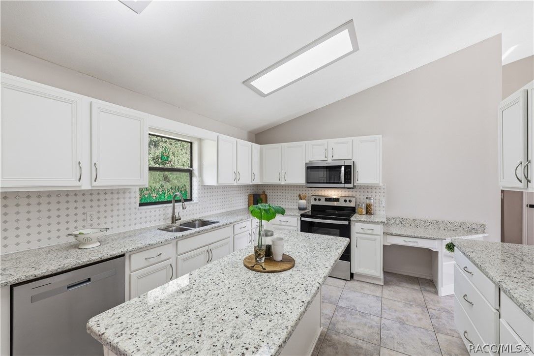 - Cathedral Ceiling(s), Primary Suite, Stone Counters, WoodCabinets, Window Treatments, First Floor Entry