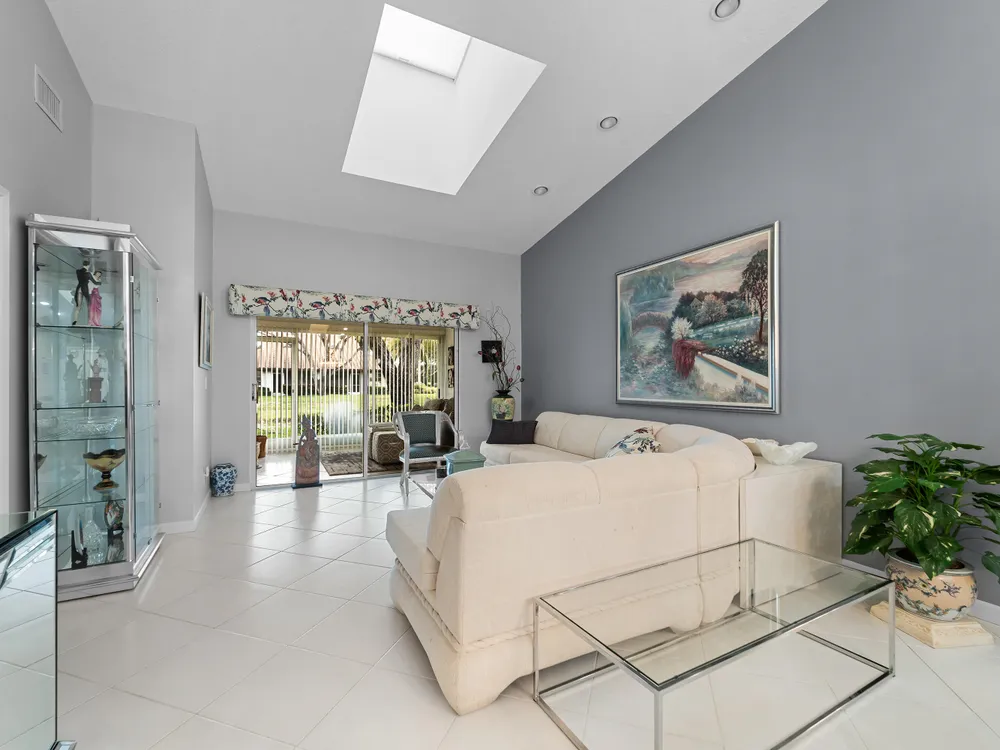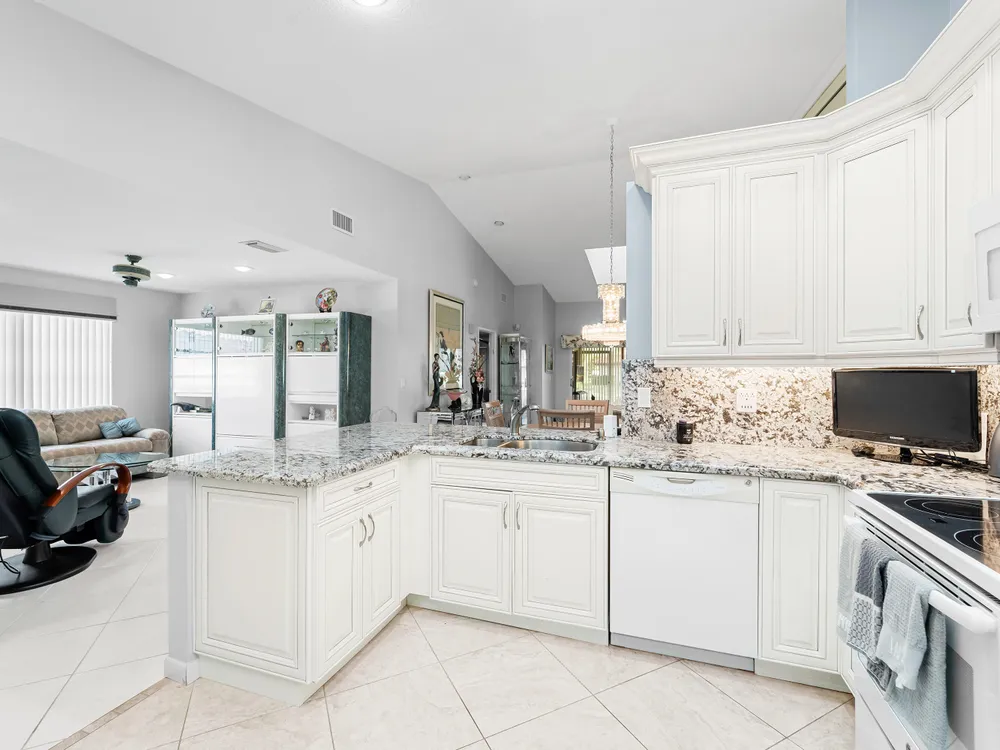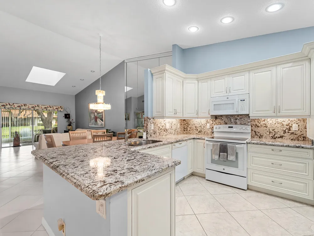 Lovely and light-filled, this 2-bedroom, 2-bath villa with den and attached one-car garage offers comfort, style, and plenty of space to make your own. Step into the spacious, eat-in kitchen featuring stunning granite countertops, high-grade wood cabinetry, and newer appliances--a perfect spot for both casual meals and entertaining. The remodeled primary and guest baths each showcase walk-in showers (no tubs to step over), while the primary suite boasts two California-style walk-in closets and a glassed-in linen closet for added convenience.The main living areas have tile on the diagonal, while the primary bedroom features comfortable under the foot wood laminate flooring. The cathedral ceiling with 2 skylights bathes the living room and kitchen in natural light. A fully enclosed,
