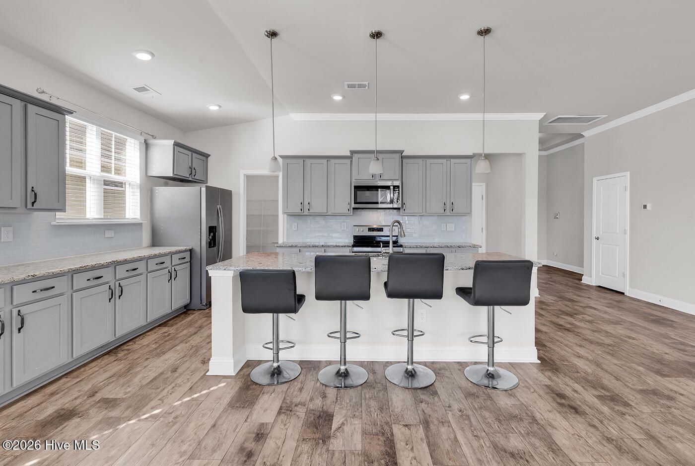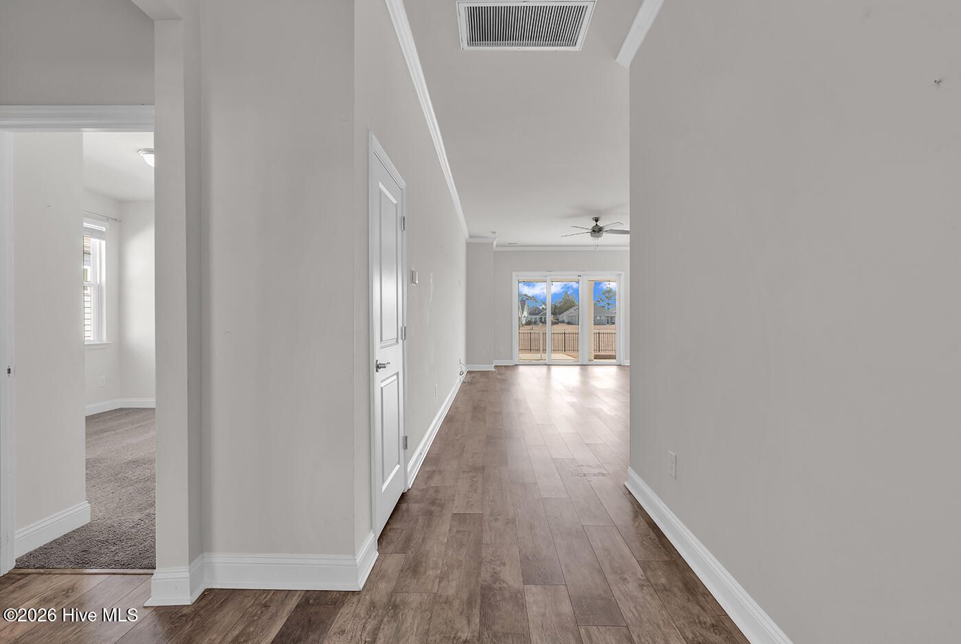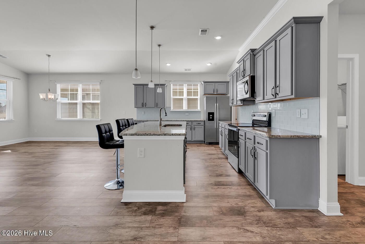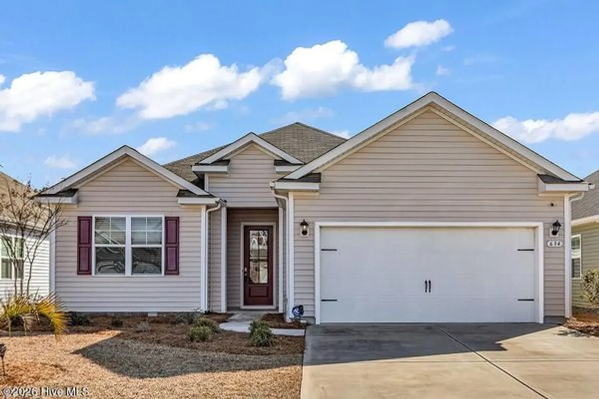 Welcome to this beautifully maintained 3-bedroom, 2-bath home in The Groves at The Farm in Carolina Shores, North Carolina. Designed for comfortable living and effortless entertaining, this home features a bright open floor plan that seamlessly connects the main living spaces. The spacious kitchen is a true centerpiece, showcasing modern gray painted cabinetry, granite countertops, wide-plank laminate wood flooring, and a large island perfect for gatherings with family and friends. The great room is filled with natural light thanks to abundant windows and soaring 9-foot ceilings, creating an airy and inviting atmosphere. Large sliding glass doors lead to an expansive screened-in porch, ideal for enjoying indoor-outdoor living year-round. From here, take in peaceful views of the community pond and the privacy of the fenced backyard. Its perfect for relaxing, entertaining, or letting pets play. Conveniently located near local shopping, renowned Calabash seafood dining, and the beautiful shores of Sunset Beach, this home offers the perfect blend of style, comfort, and coastal lifestyle.