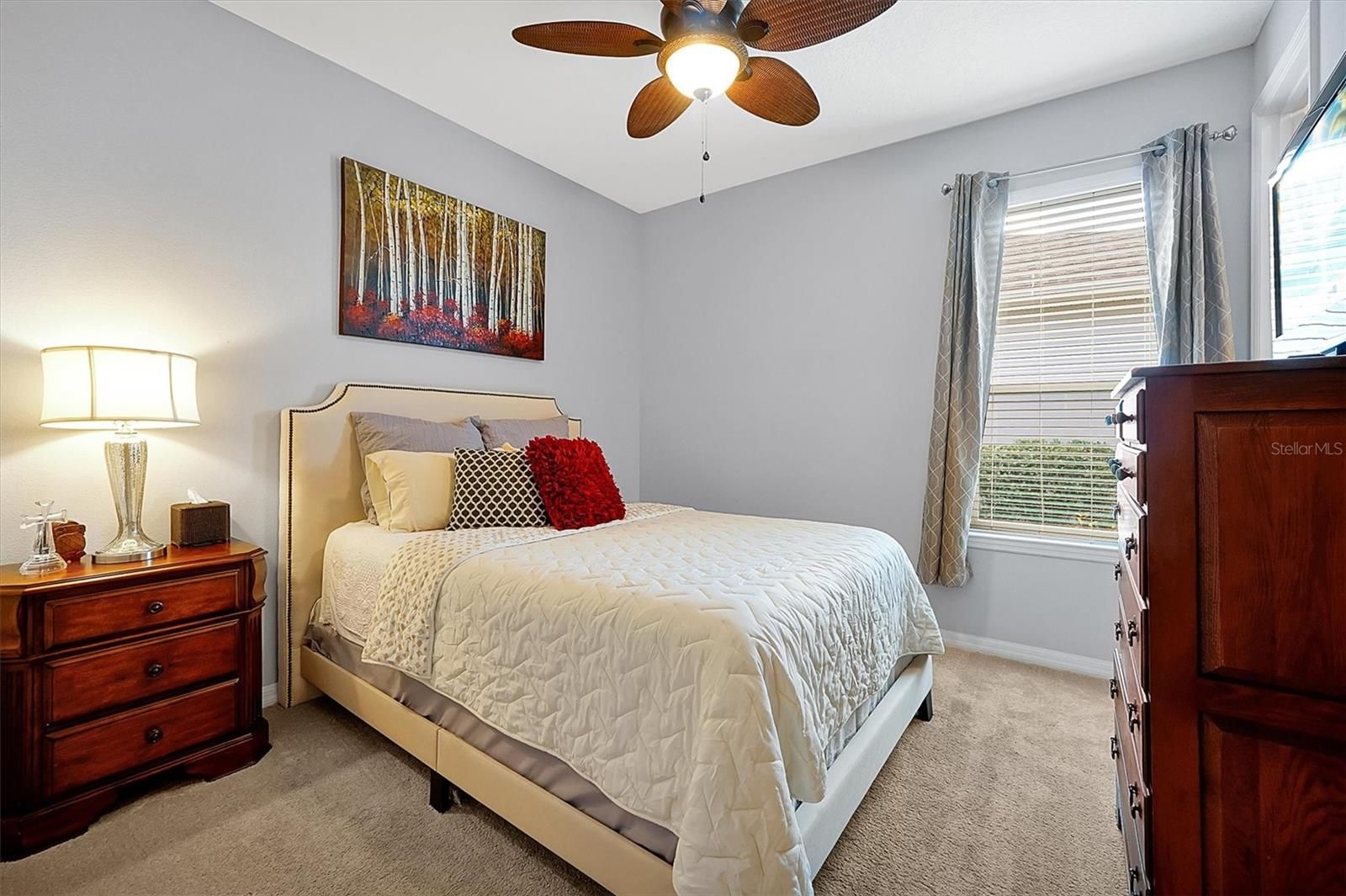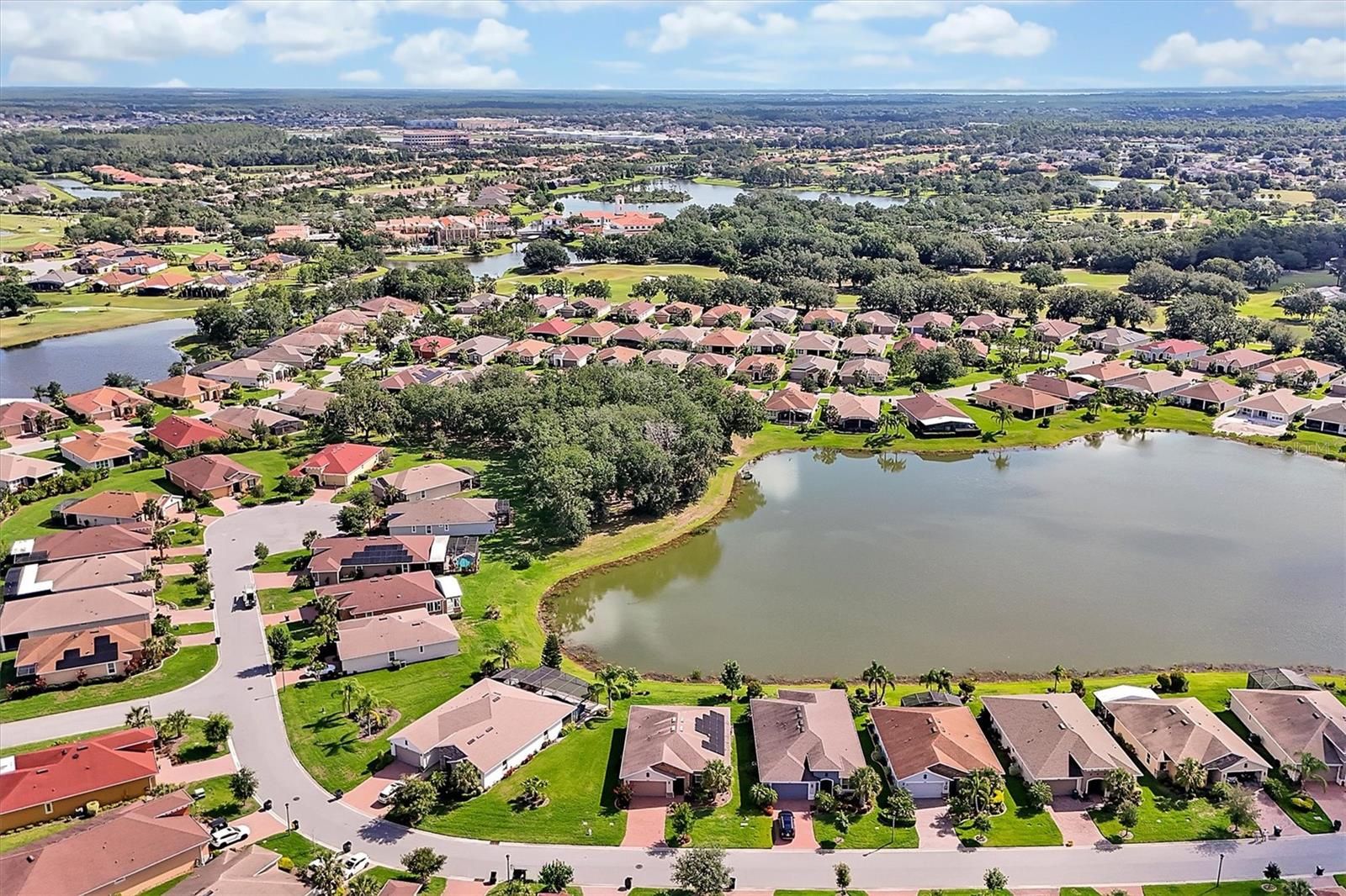 Having a home with solar panels means your electric bills will never exceed $35 each month! Compare that to the hundreds of dollars your neighbors spend now and the rising cost of utilities in Florida, and you'll understand why this home should be high on your list! Solar system is fully paid and owned by the seller and will convey upon closing. Why have your morning coffee while looking at your neighbor's porch when you can gaze at the eagles, ducks, turtles, and other wildlife on your own lakefront lot? Nestled in one of the most active, nature-filled 55+ communities in Florida, this single-owner home with fully owned solar array is pristine---featuring an open floor plan and relaxing views of the lake and surrounding wildlife. Discover all that retirement life can be by living just a short golf cart (or walking) path away from the clubhouse, restaurants, fitness center, main street, golf course, and more! Enter the home through the decorative glass entry into the foyer. An office space (and Murphy bed) is located through double doors on the right, and a guest bath and bedroom with walk-in closet is found off the entry hall. The open family room features a tray ceiling and island with sink and breakfast bar, as well as a triple slider and large windows with custom plantation shutters overlooking the screened lanai, lake and nature areas. Just off the living area is the primary bedroom, a bright and spacious room with custom plantation shutters, ensuite bathroom, double sinks, and large walk-in shower. Enjoy the amenities of this active community, including golf, tennis, swimming, pickleball, bocce, fitness center, and various social events, concerts, and gatherings! Make this home in vibrant Solivita your active community in retirement; growing old has never felt so young!