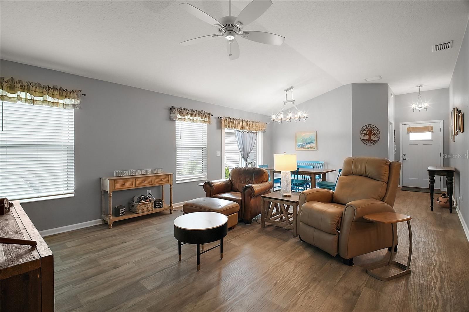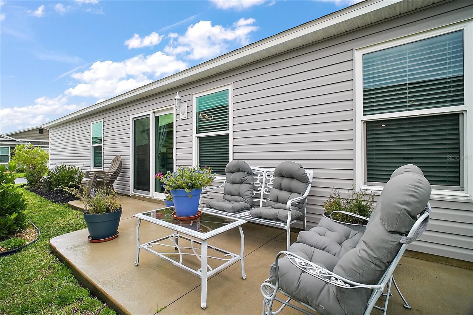 Welcome to your dream home! This stunning 2021 Emerald Villa in the desirable Village of Citrus Grove offers a perfect blend of luxury and comfort. Featuring 3 spacious bedrooms and 2 modern baths, this home is designed for both relaxation and entertainment. As you enter, you'll be captivated by the open concept living area with high ceilings, creating a bright and airy atmosphere. The inviting dining area, complete with upgraded light fixtures, boasts sliders that lead to a private side patio—ideal for morning coffee or evening retreats. The contemporary kitchen is a chef's delight, featuring stainless steel appliances, including a gas stove, sleek dark cabinetry with soft-close features with a convenient breakfast bar with stools included. An inside laundry area is thoughtfully tucked away behind bifold doors off the kitchen for added convenience. The owner's suite is a true oasis, complete with a ceiling fan, walk-in closet, and en suite bathroom that includes dual sinks, a linen closet, a water closet, and a luxurious shower with glass sliding doors. The other 2 guest bedrooms offer a quiet and serene sanctuary for your guests or private office space. Situated in a low-traffic area, this home is perfectly located within 3 squares—just 1 mile to Sawgrass Grove, 3.5 miles to Eastport Square, and 5 miles to Brownwood Square. Enjoy nearby amenities such as the dog park, Ezell Recreation Center, walking paths, and the Southern Oaks Championship Golf Course. Experience the vibrant lifestyle of The Villages! Call today to schedule your private tour and make this beautiful villa your new home!