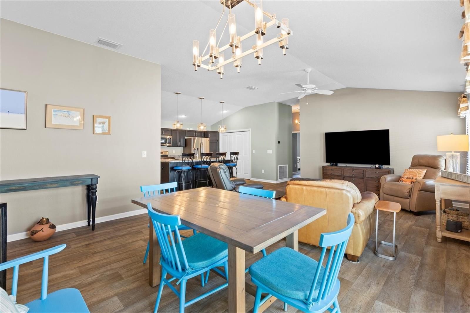 - Ceiling Fan(s), High Ceilings, Kitchen/Family Room Combo, Open Floorplan