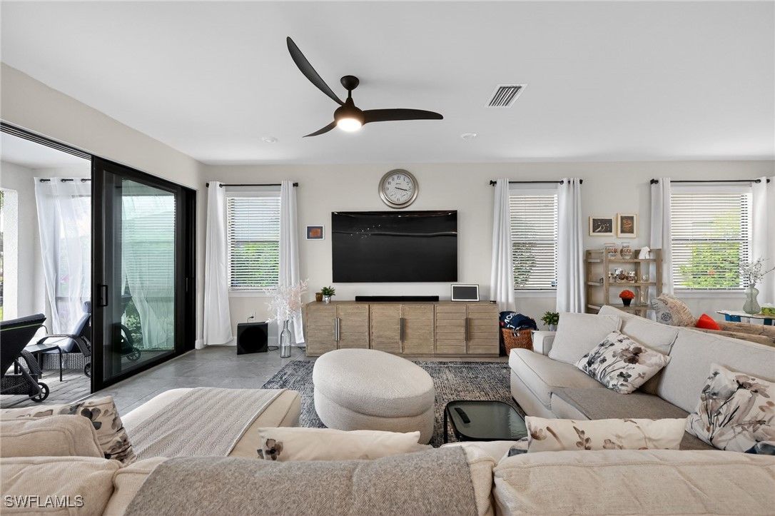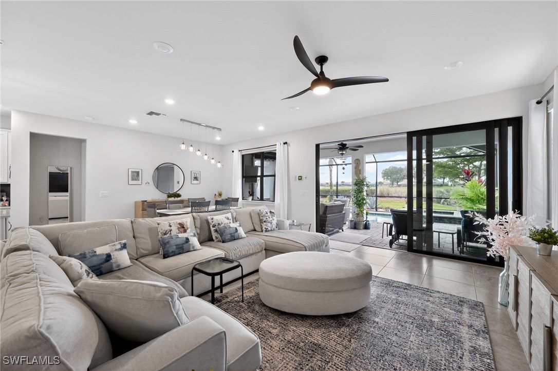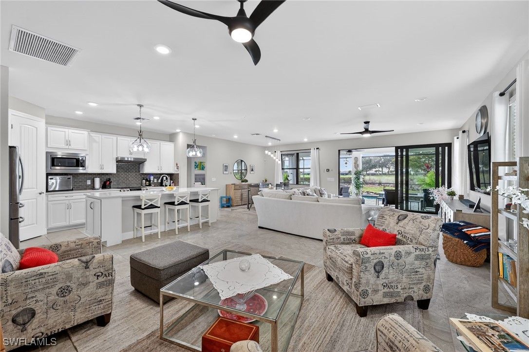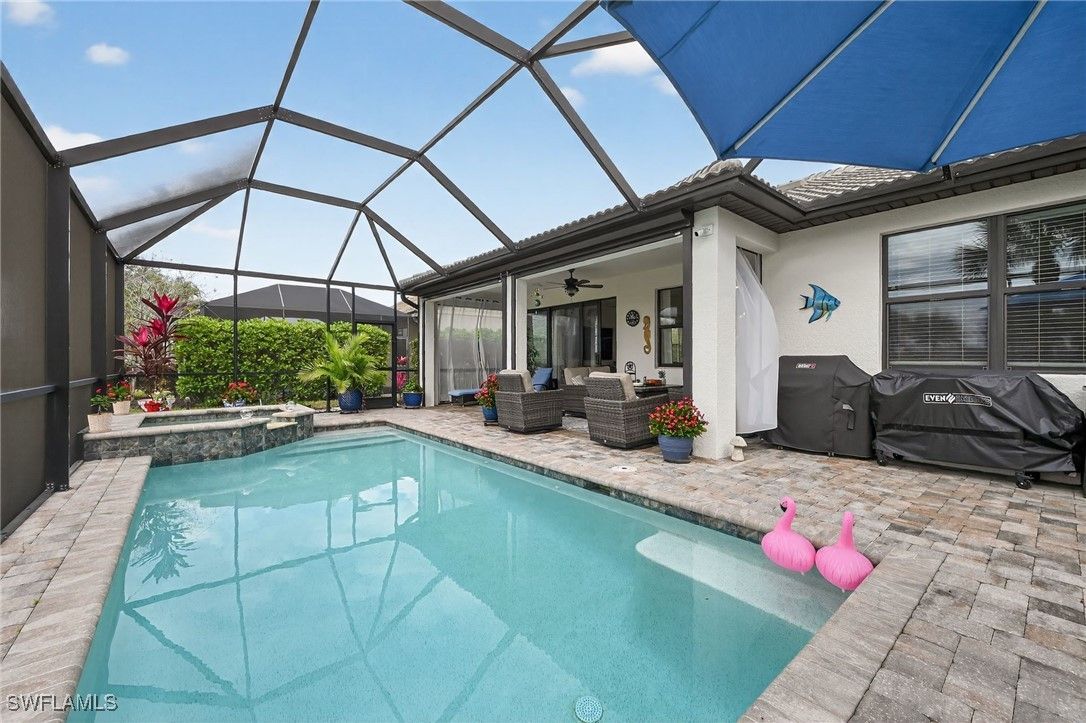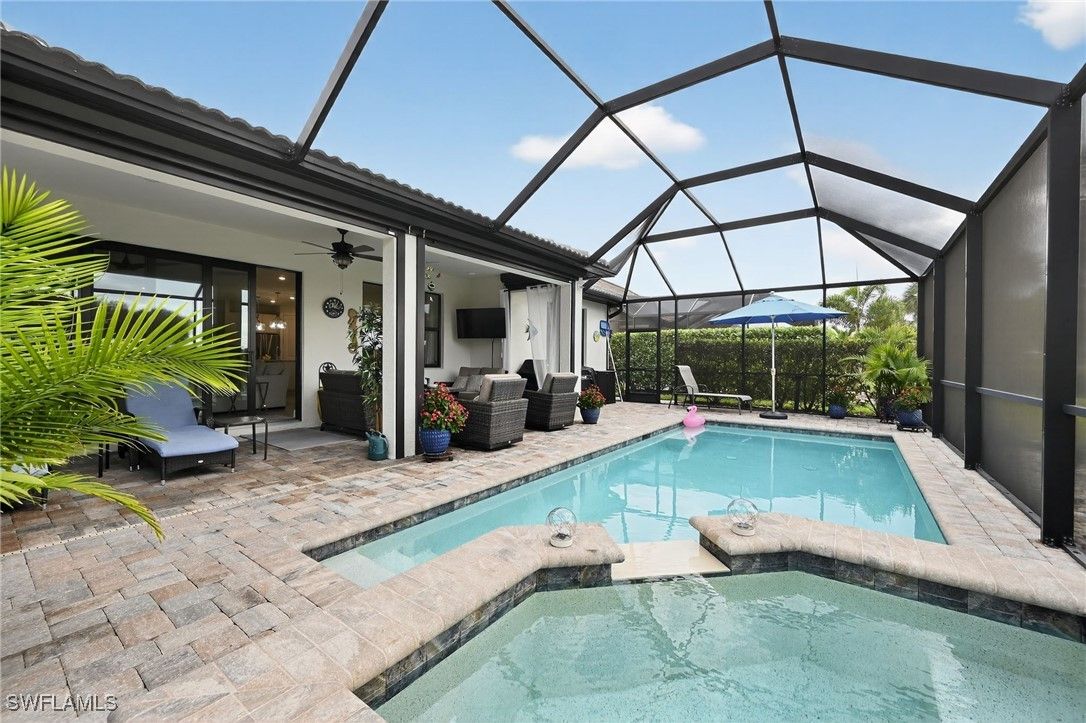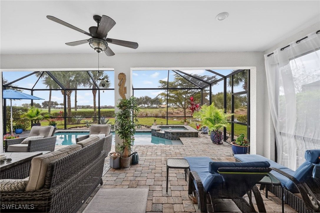 Welcome to this beautifully maintained home located in the heart of the highly sought-after Ave Maria Del Webb community. Featuring 2 bedrooms, 1 Den/Flex room, 2 bathrooms, and 2,036 square feet of thoughtfully designed living space. This residence offers a functional and inviting layout with bright interiors for everyday living and entertaining. Modern kitchen features with lots of storage space and a large island. Large master bath with a large glass shower in the primary bedroom. Enjoy the outdoor living Florida has to offer with your very own oasis. Oversized covered lanai, with a beautiful saltwater pool and in-ground spa, with a screened enclosure for all year-round use. Additional features included are a PANTER RUN GOLF COURSE golf membership, a 2025 EVOLUTION GOLF CART, and a premium lot, situated with a back yard westerly “sundown” view. The home also features hurricane high-impact windows throughout, with Storm Smart Kevlar auto shutters included and epoxy installed onto the garage floor. Enjoy the unique lifestyle of Ave Maria, which includes access to parks, walking trails, community amenities, dining, shopping, and year-round events. Conveniently located with easy access to Naples and the surrounding areas. This home is perfect as a primary residence or seasonal retreat. Residents have full access to a community pool, lap pool, gym, game room with pool, ping pong, and card room tables, plus a library. Aerobic exercise classes, 8 pickleball courts, a tennis court, and a bocce ball court. Other amenities include a sauna and steam room with showers, dressing room lockers, all inside the gym. 2 separate large community meeting rooms that include an indoor virtual golf practice room with an onsite restaurant and Golf store with clothing and golf equipment.