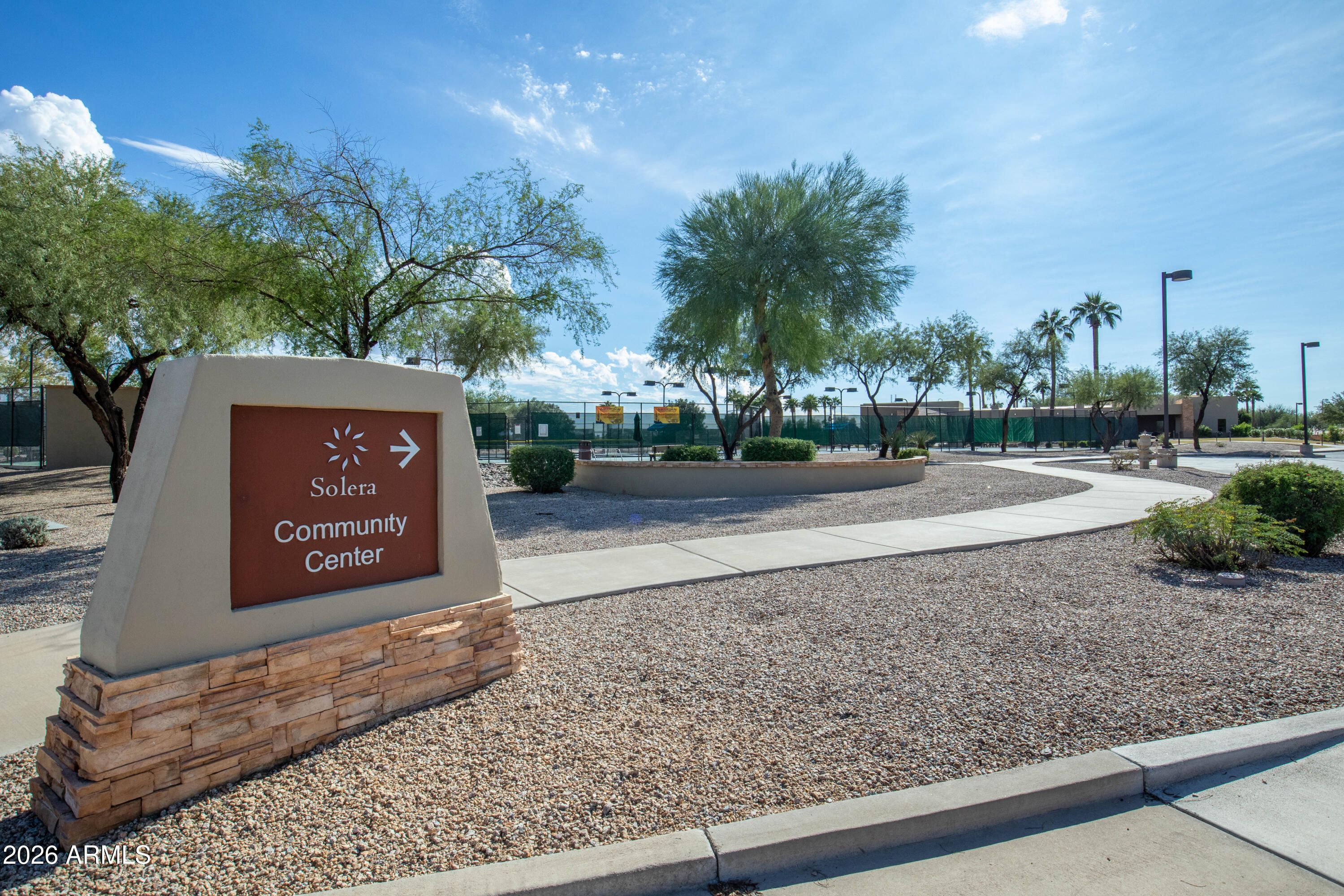 Welcome to this beautifully maintained 2 bedroom, 2 bath + Den home nestled in the desirable active adult community of Solera. Designed for easy living, this home features low-maintenance front and back yards. Inside, you'll find plantation shutters on every window, tile flooring in high-traffic areas, and cozy carpet in the bedrooms for added comfort. Enjoy relaxing on the covered patio surrounded by low-care desert landscaping—perfect for quiet mornings or evening gatherings. Residents of Solera enjoy an exceptional lifestyle with access to a recreation center, sparkling pool, golf course, pickleball courts, fitness center, and more. Experience resort-style living every day in this inviting community!