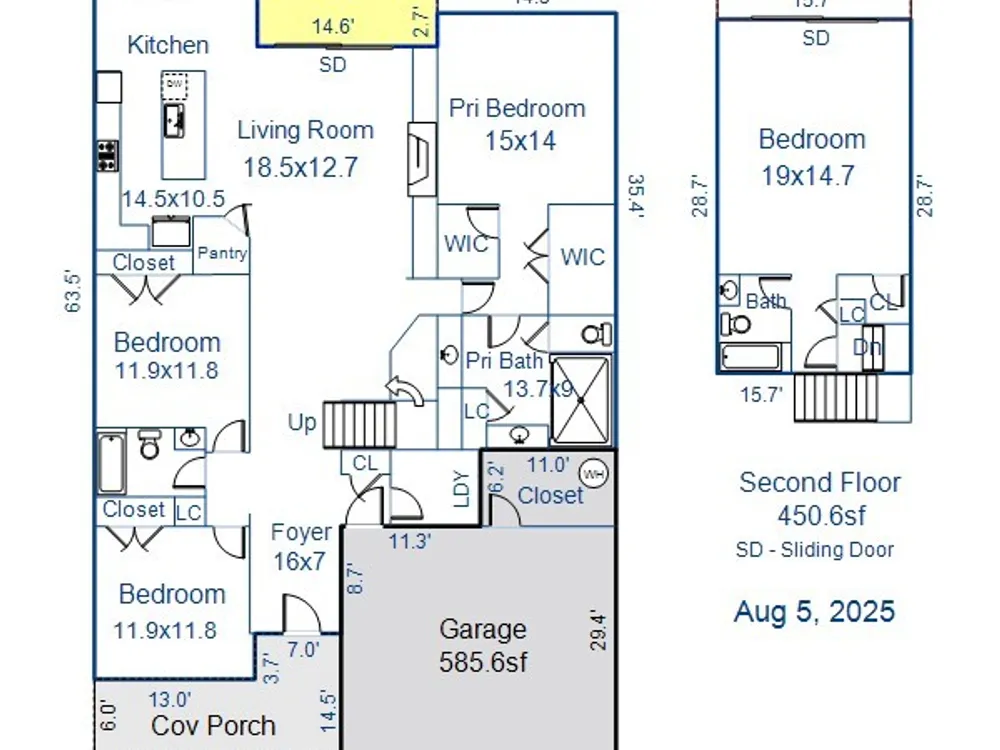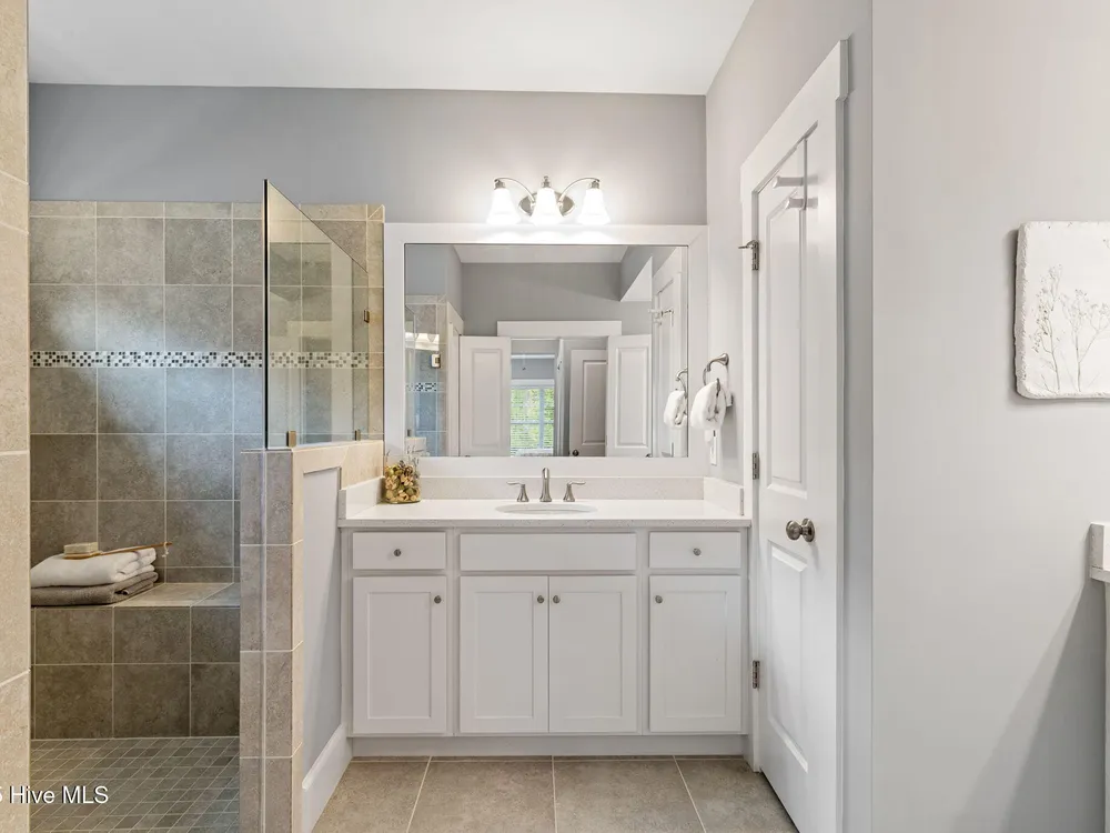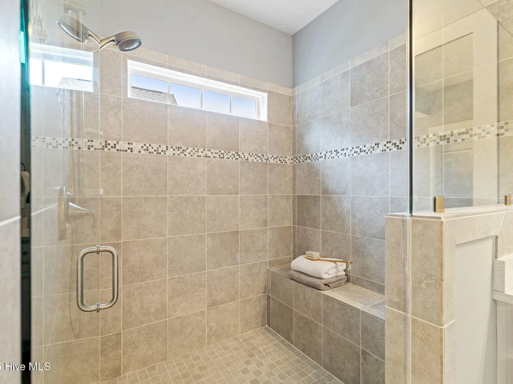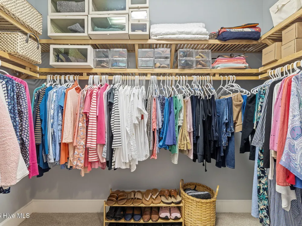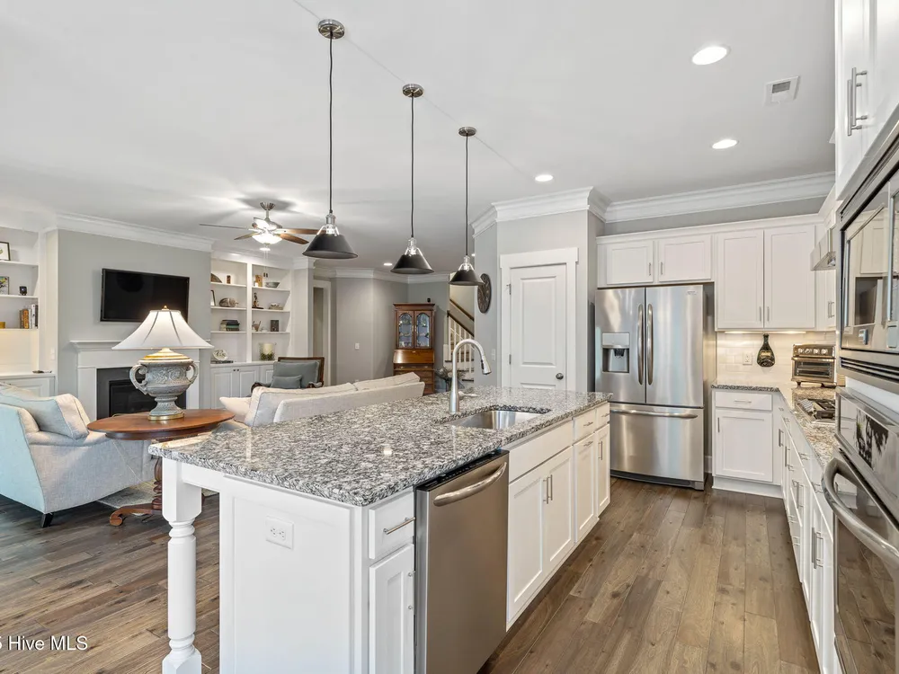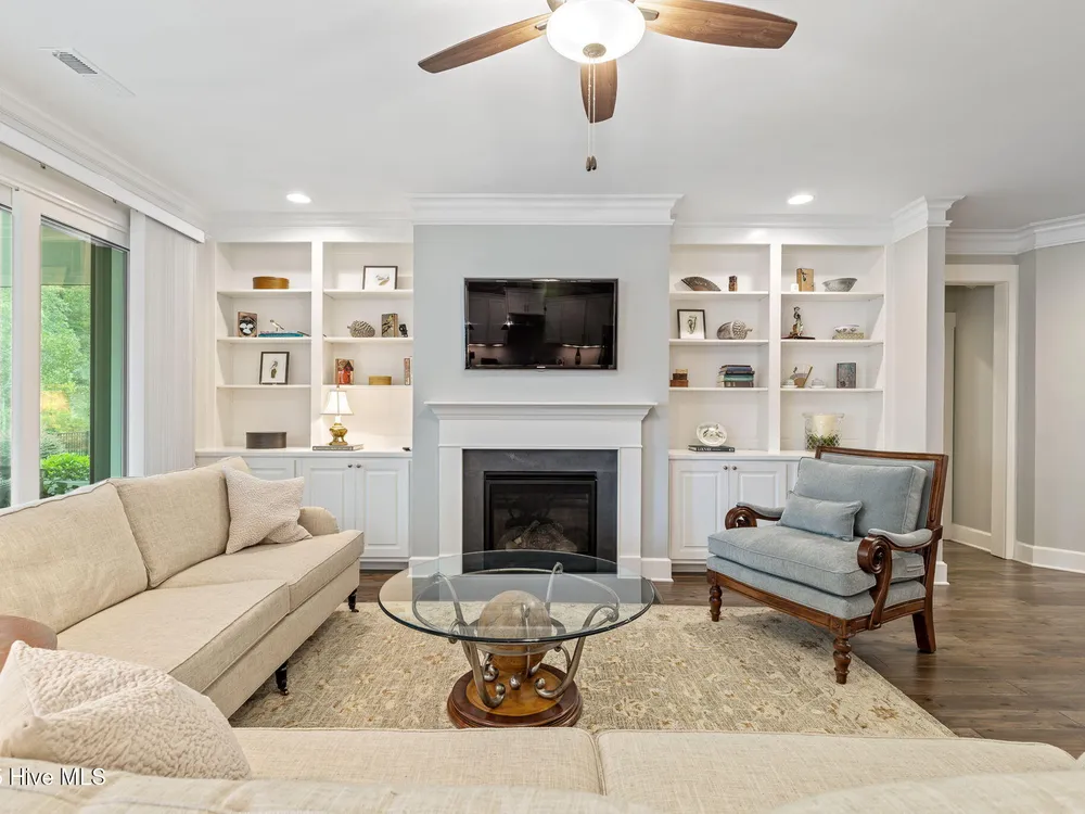 - Blinds/Shades, Solid Surface, Walk-In Closet(s), Walk-in Shower, Entrance Foyer, Pantry, Master Downstairs, Kitchen Island, High Ceilings, Gas Log, Ceiling Fan(s), Bookcases