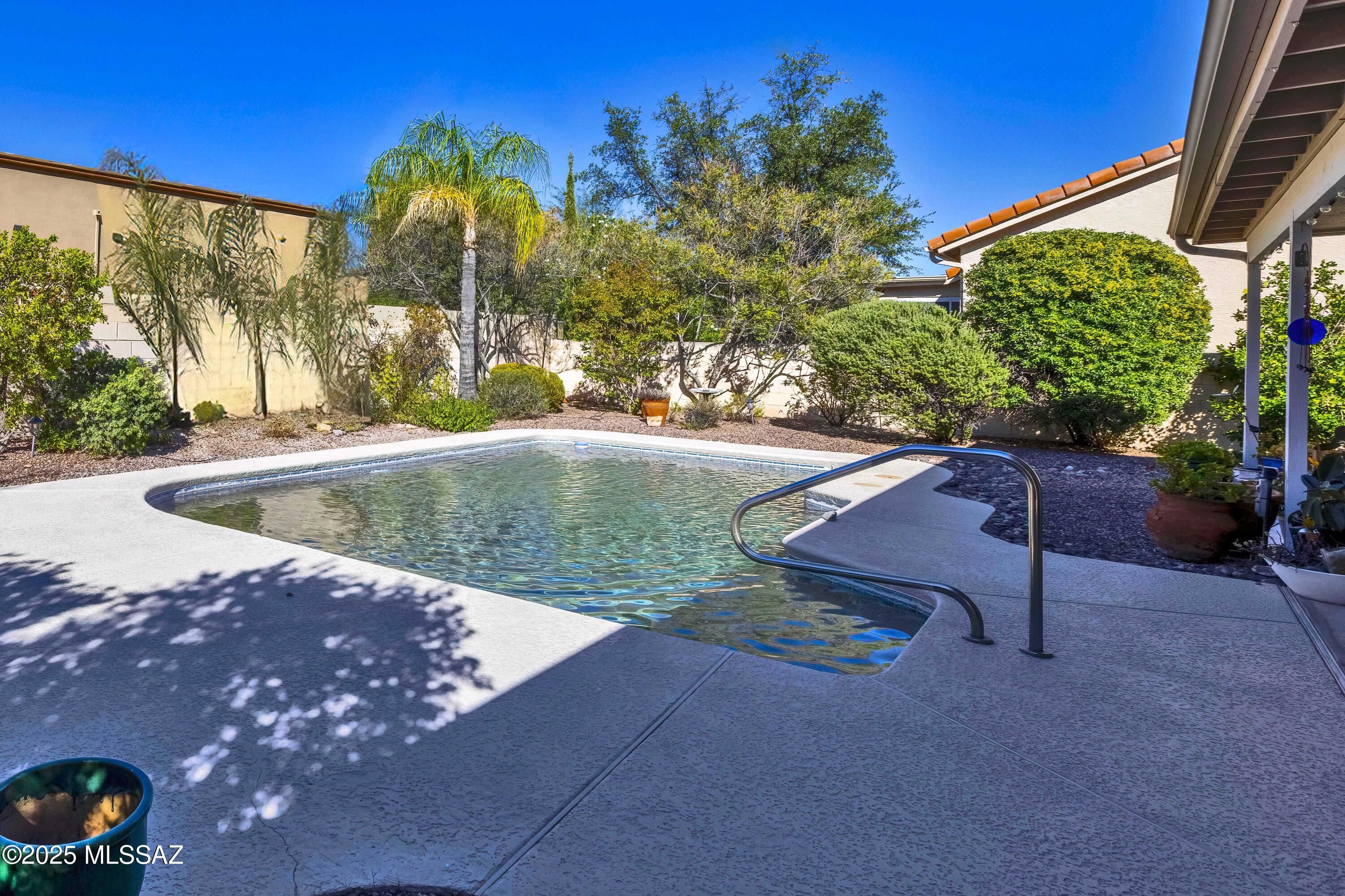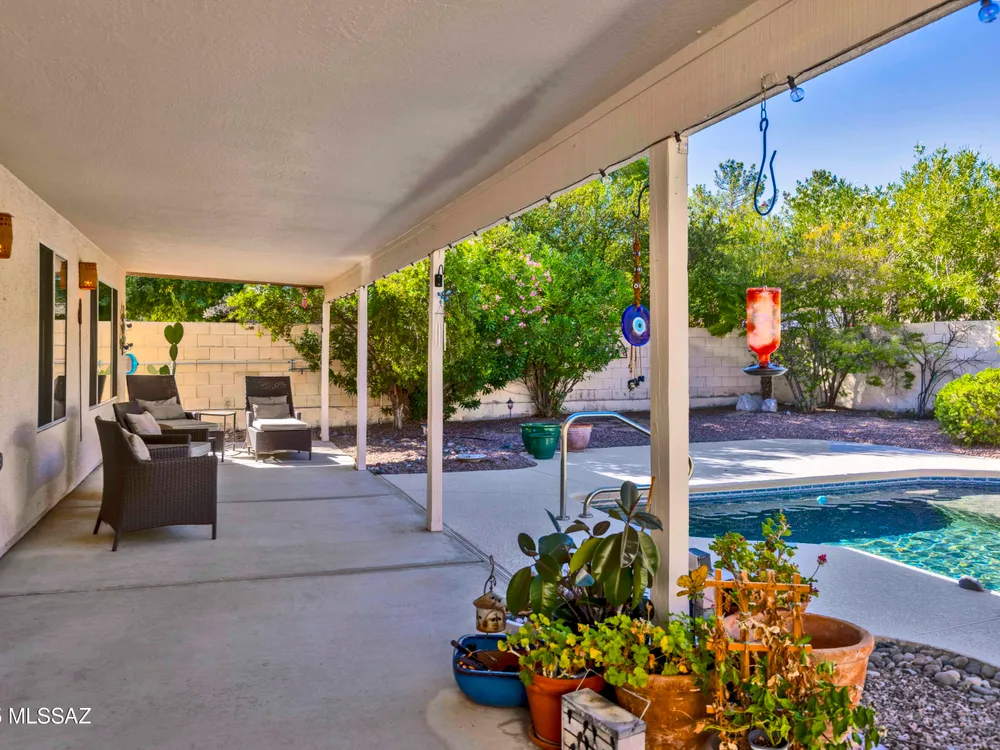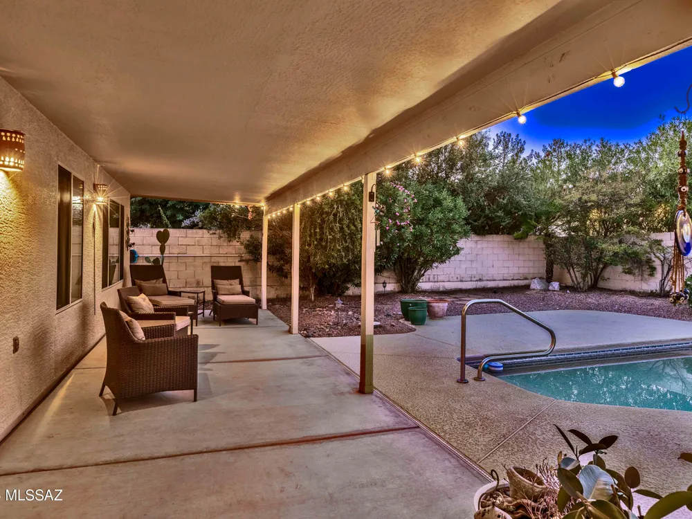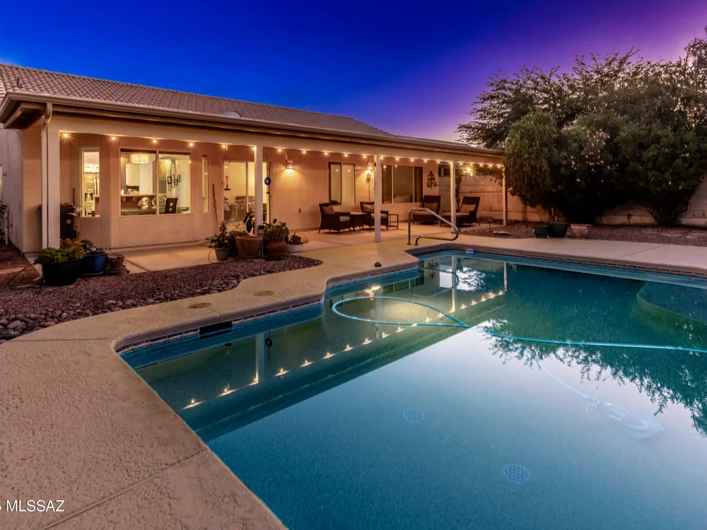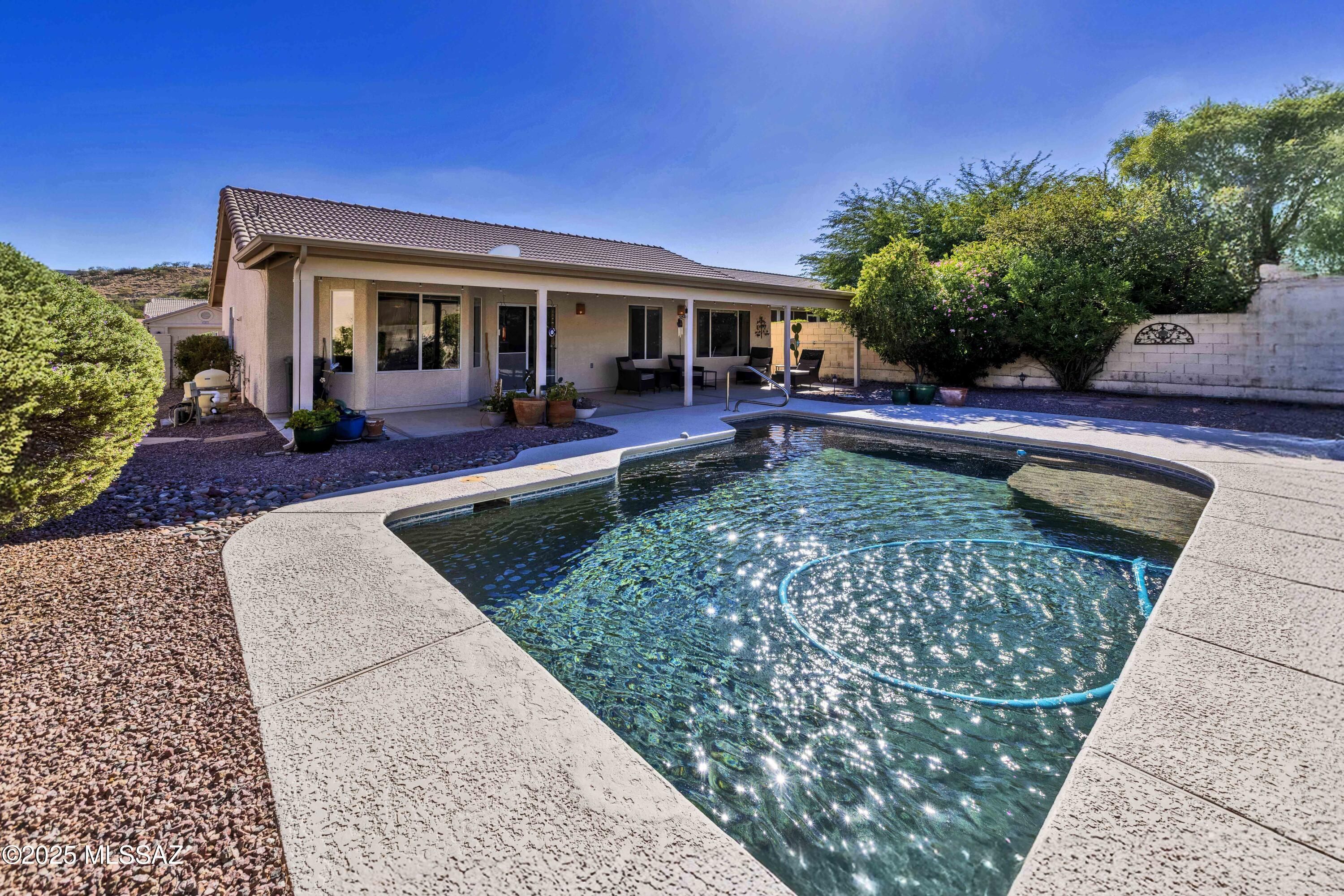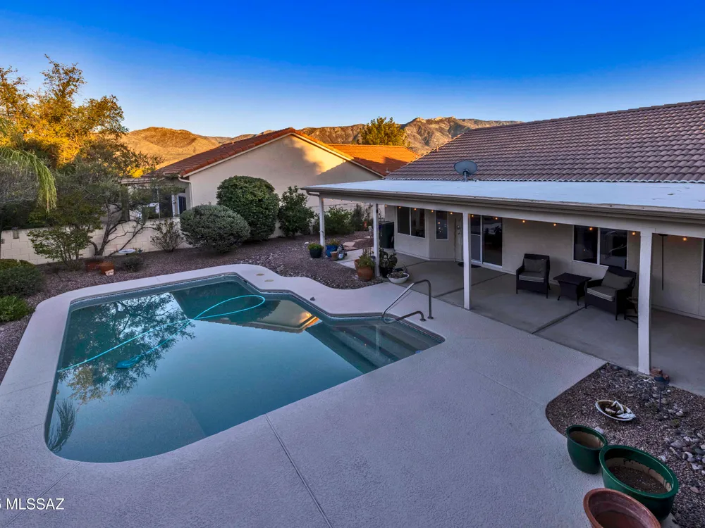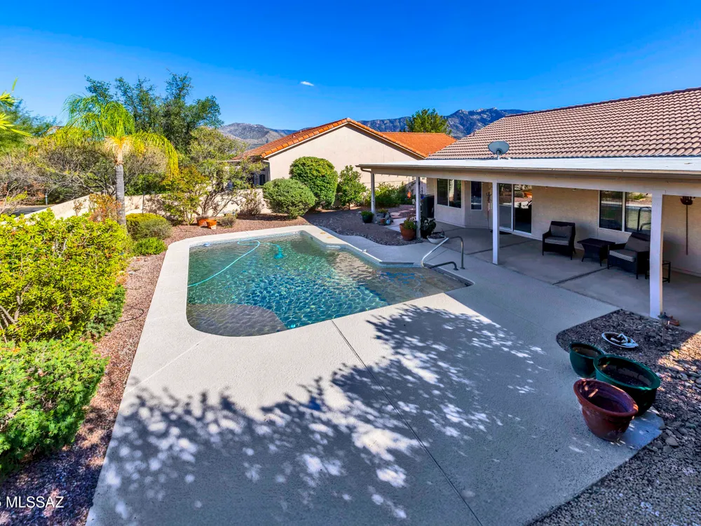 Enjoy entertaining in your private backyard oasis with sparkling pool, new Kool decking, and a covered, illuminated patio perfect for relaxing or hosting friends. This Contemporary Diego model offers tile floors in all the right places and an inviting living room ideal for quiet reading or a grand piano. The open kitchen features stainless appliances, breakfast bar, and bay windows in the nook, overlooking the great room and pool. The spacious owner's suite includes dual vanities and separate shower, while a large hobby room/office adds versatility. Laundry leads to the extended garage with storage, newer HVAC and hot water tank. A comfortable guest room and bath complete this home. Some Furniture Available on a Separate Bill of Sale. Don't you deserve to Retire in Style at SaddleBrooke,