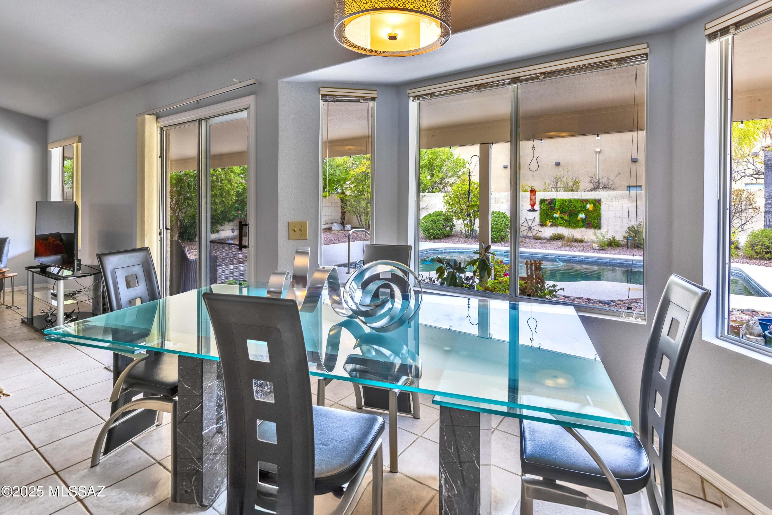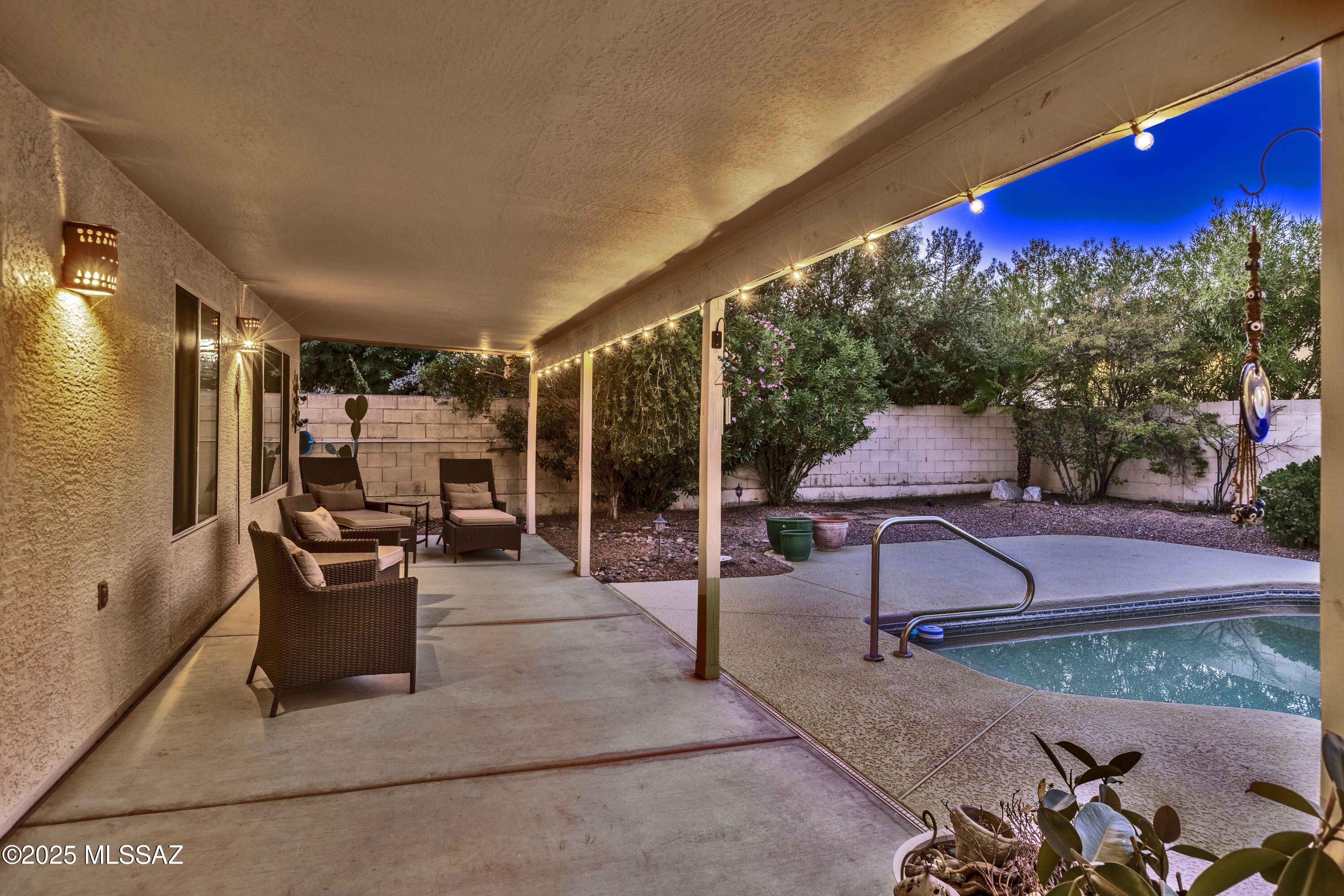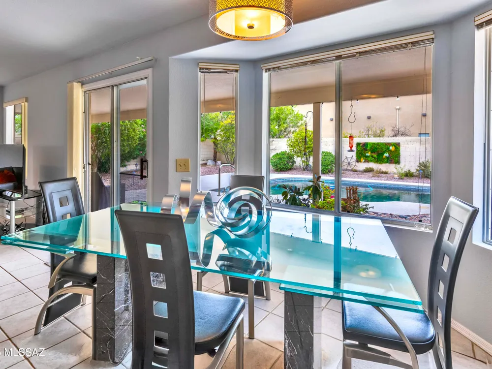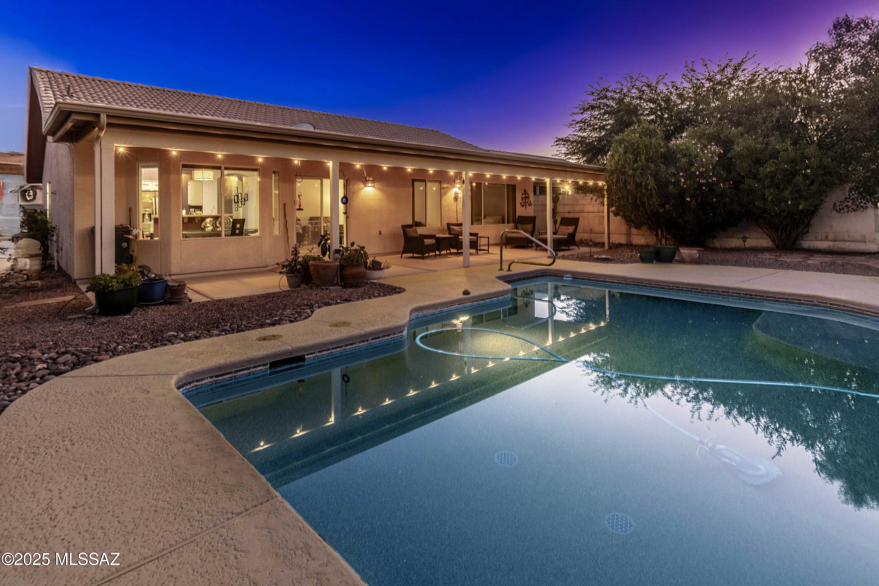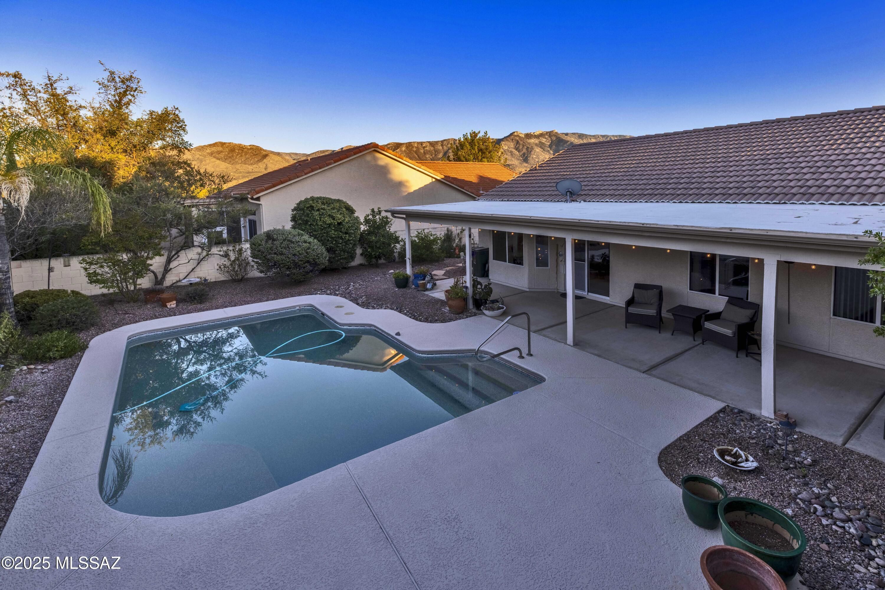 Enjoy entertaining in your private backyard oasis with sparkling pool, new Kool decking, and a covered, illuminated patio perfect for relaxing or hosting friends. This Contemporary Diego model offers tile floors in all the right places and an inviting living room ideal for quiet reading or a grand piano. The open kitchen features stainless appliances, breakfast bar, and bay windows in the nook, overlooking the great room and pool. The spacious owner's suite includes dual vanities and separate shower, while a large hobby room/office adds versatility. Laundry leads to the extended garage with storage, newer HVAC and hot water tank. A comfortable guest room and bath complete this home. Some Furniture Available on a Separate Bill of Sale. Don't you deserve to Retire in Style at SaddleBrooke,
