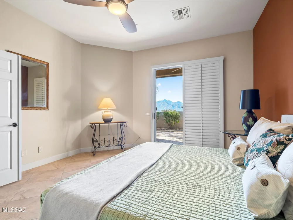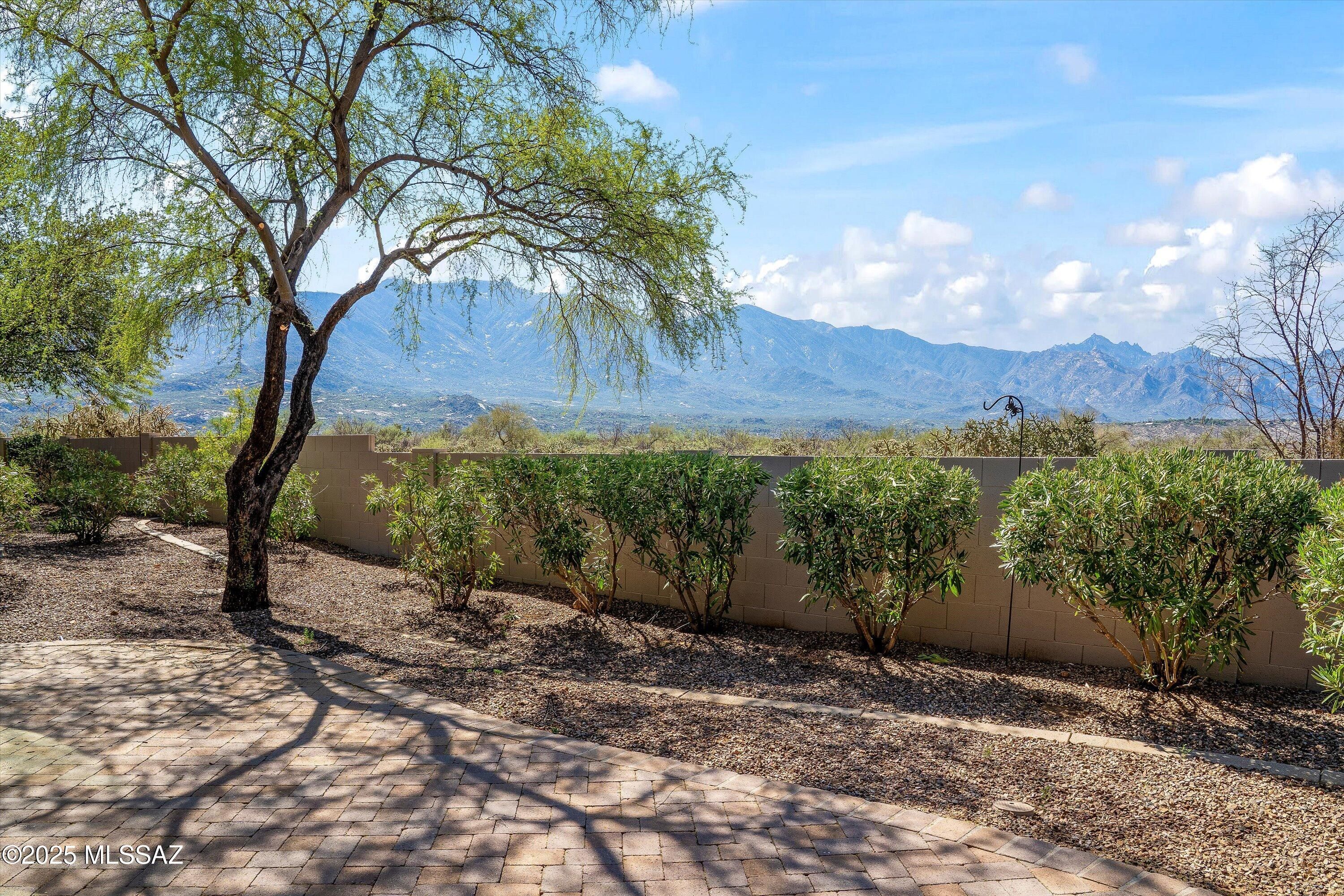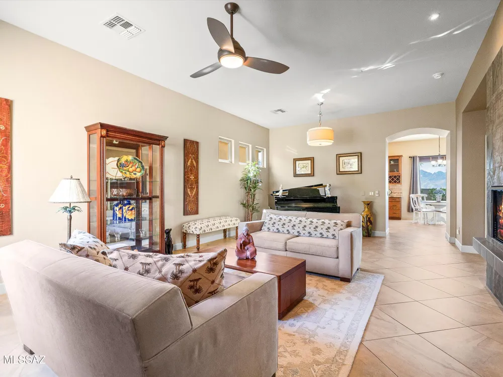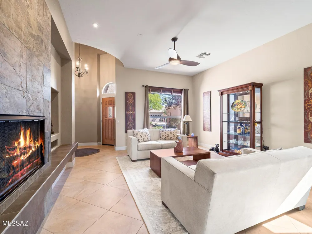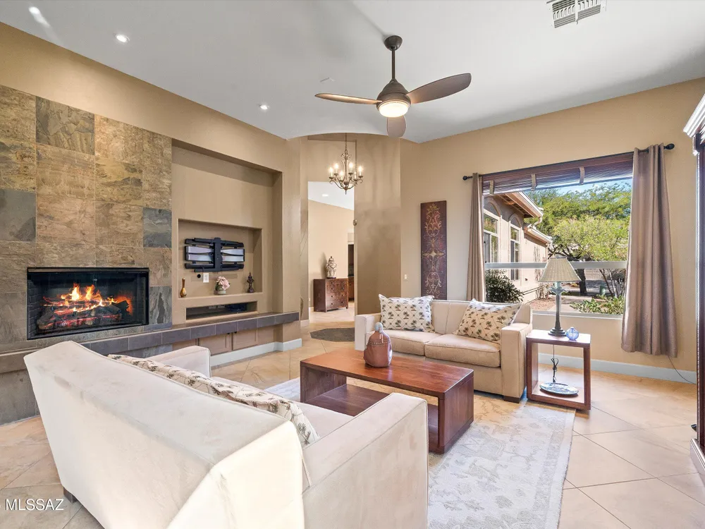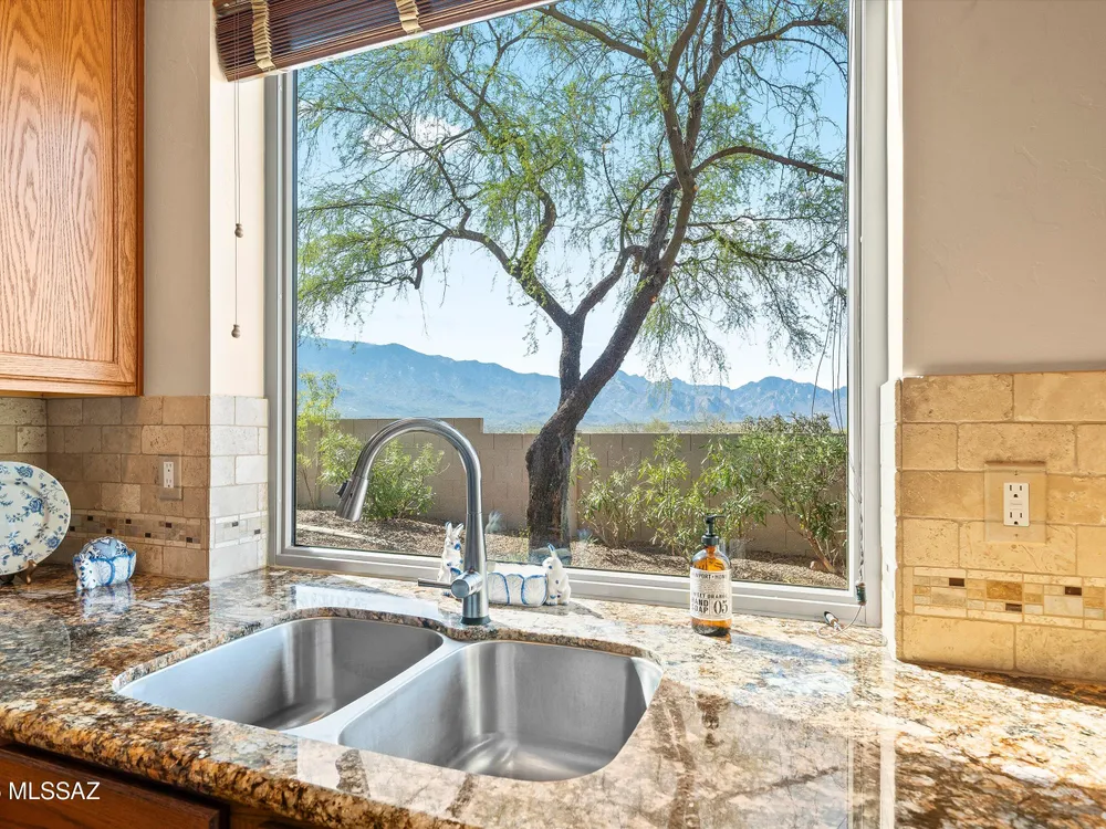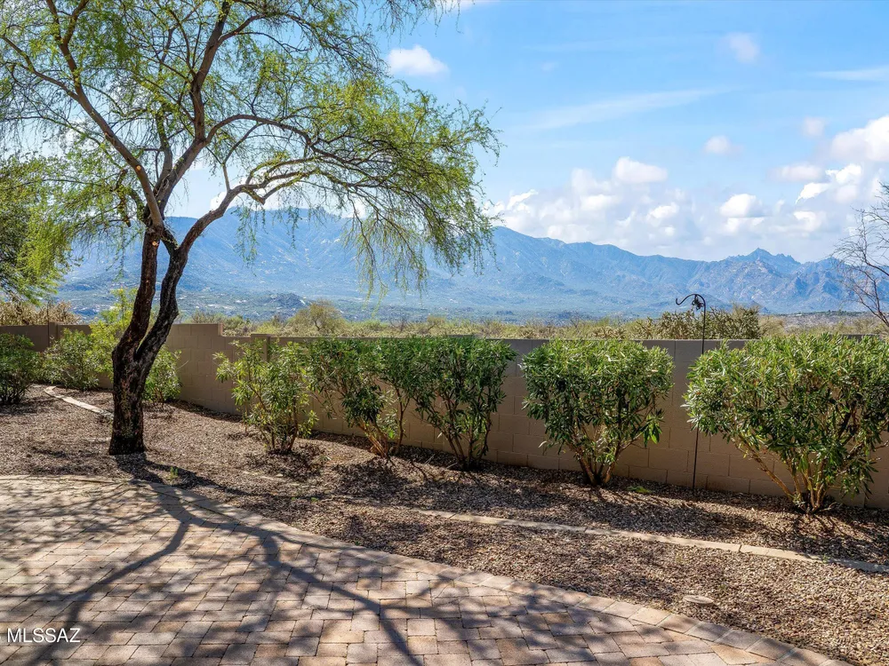 Catalina Mountain views from this gorgeous Verona model Villa. Designer touches include a slate gas fireplace, porcelain tile, kitchen with granite counters, ss appliances included. Large picture windows with built in UV protection flood the kitchen and breakfast nook with natural light. Primary suite has large slider leading to the backyard, remodeled bathroom and custom closet. Guest bedroom features murphy bed. Tranquil outdoor setting with extended brick paver patio, auto sun shade & breathtaking desert and mountain views. Epoxy-finished 2-car garage, sensor lighting, newer HVAC & water heater and whole house filtration system. HOA covers exterior maintenance.Saddlebrooke offers including golf, pickleball, tennis, pools, restaurants, fitness, clubs and more.