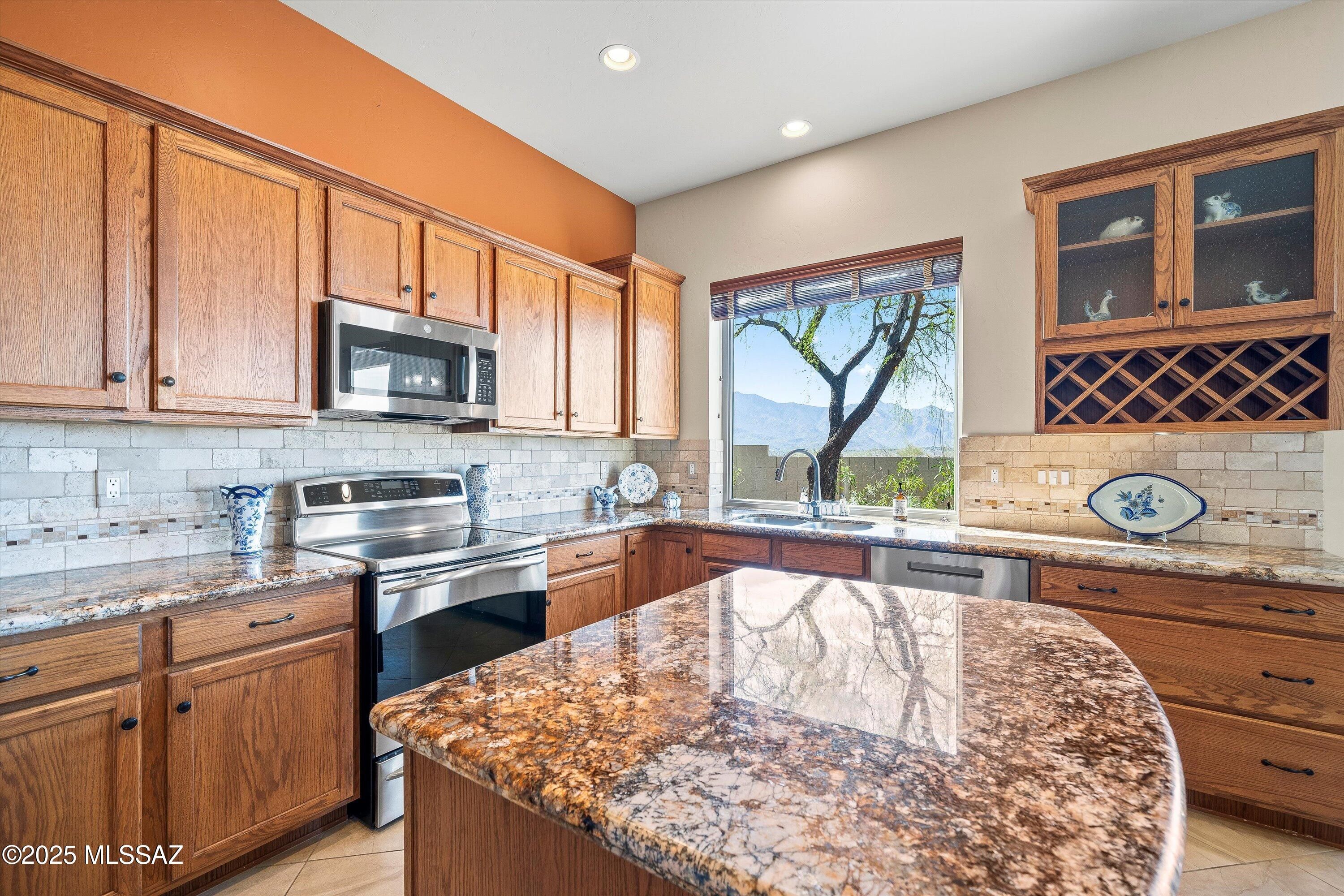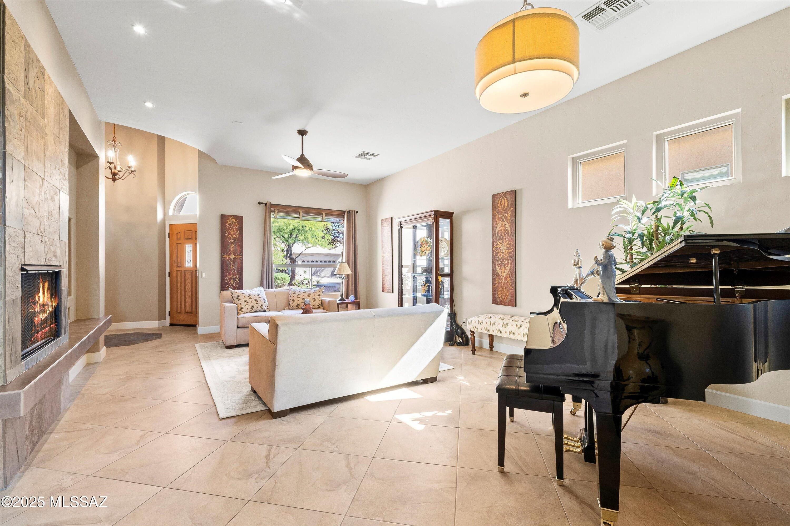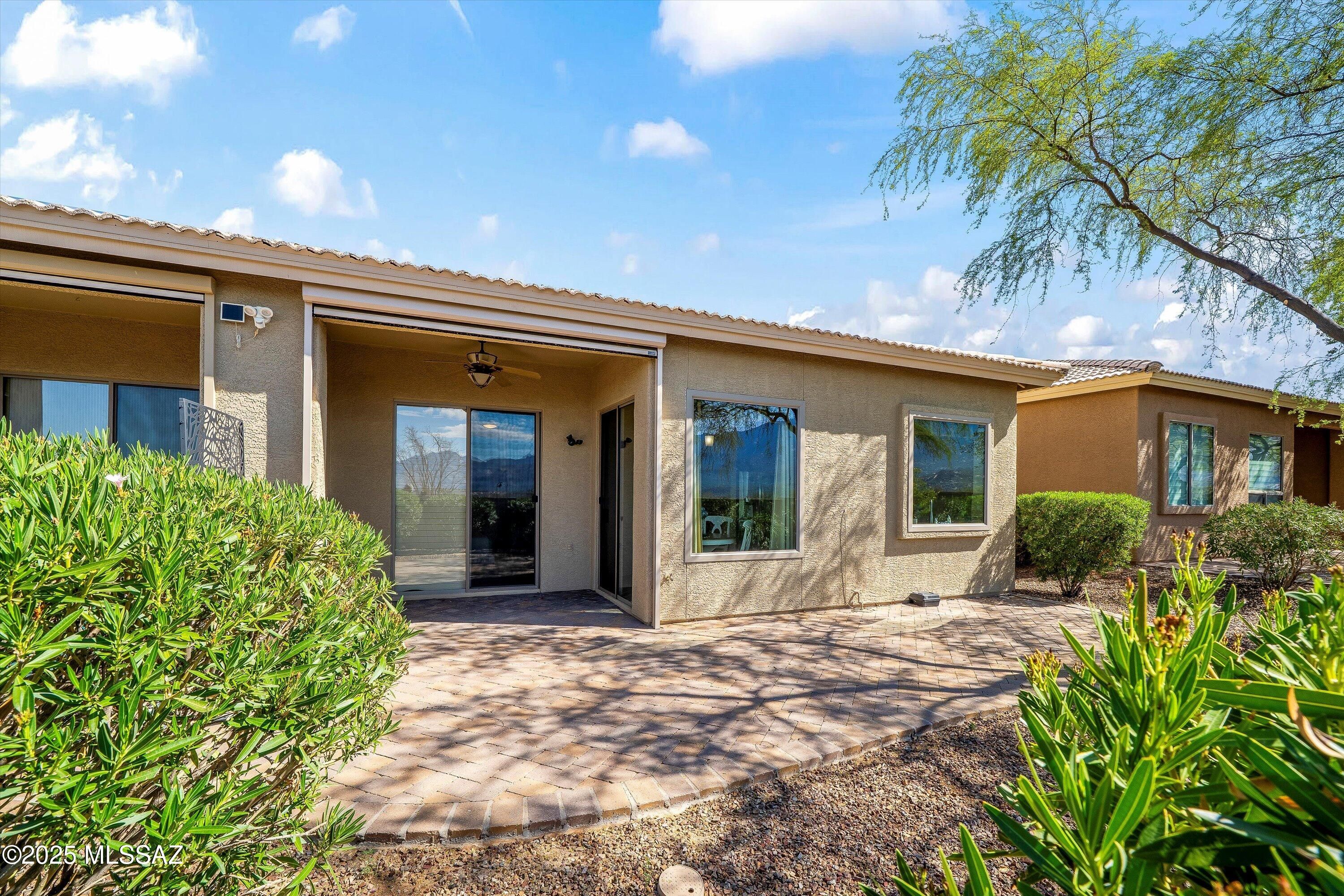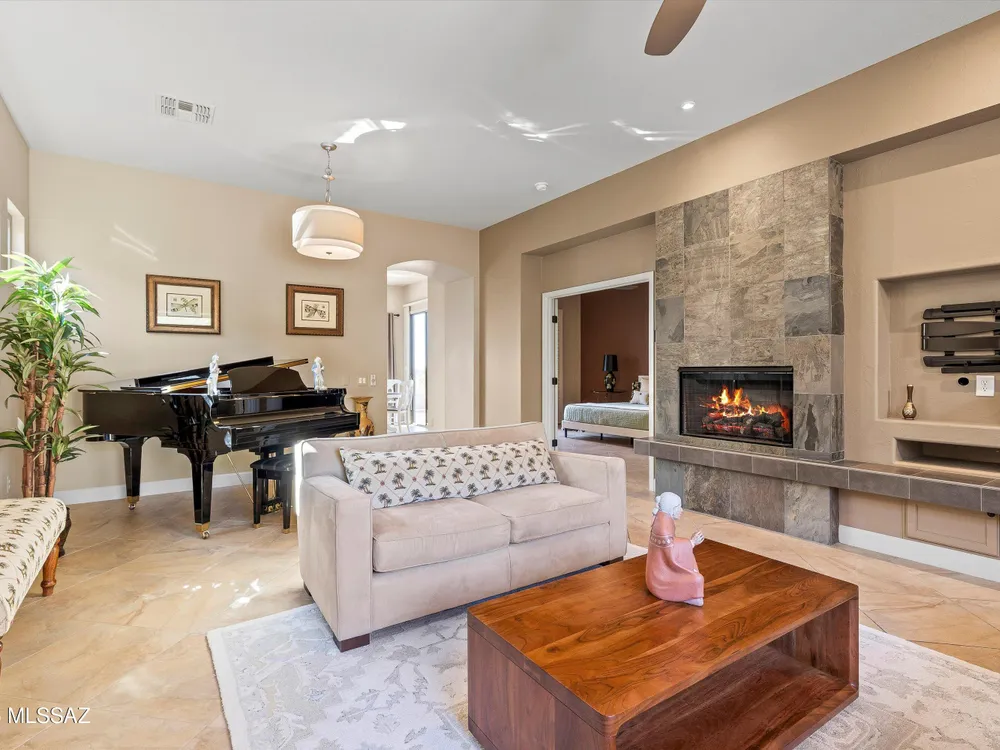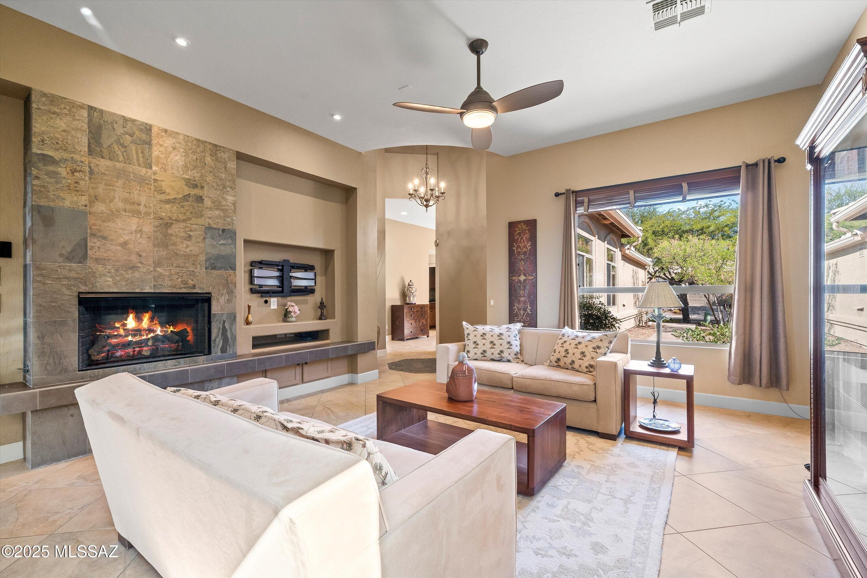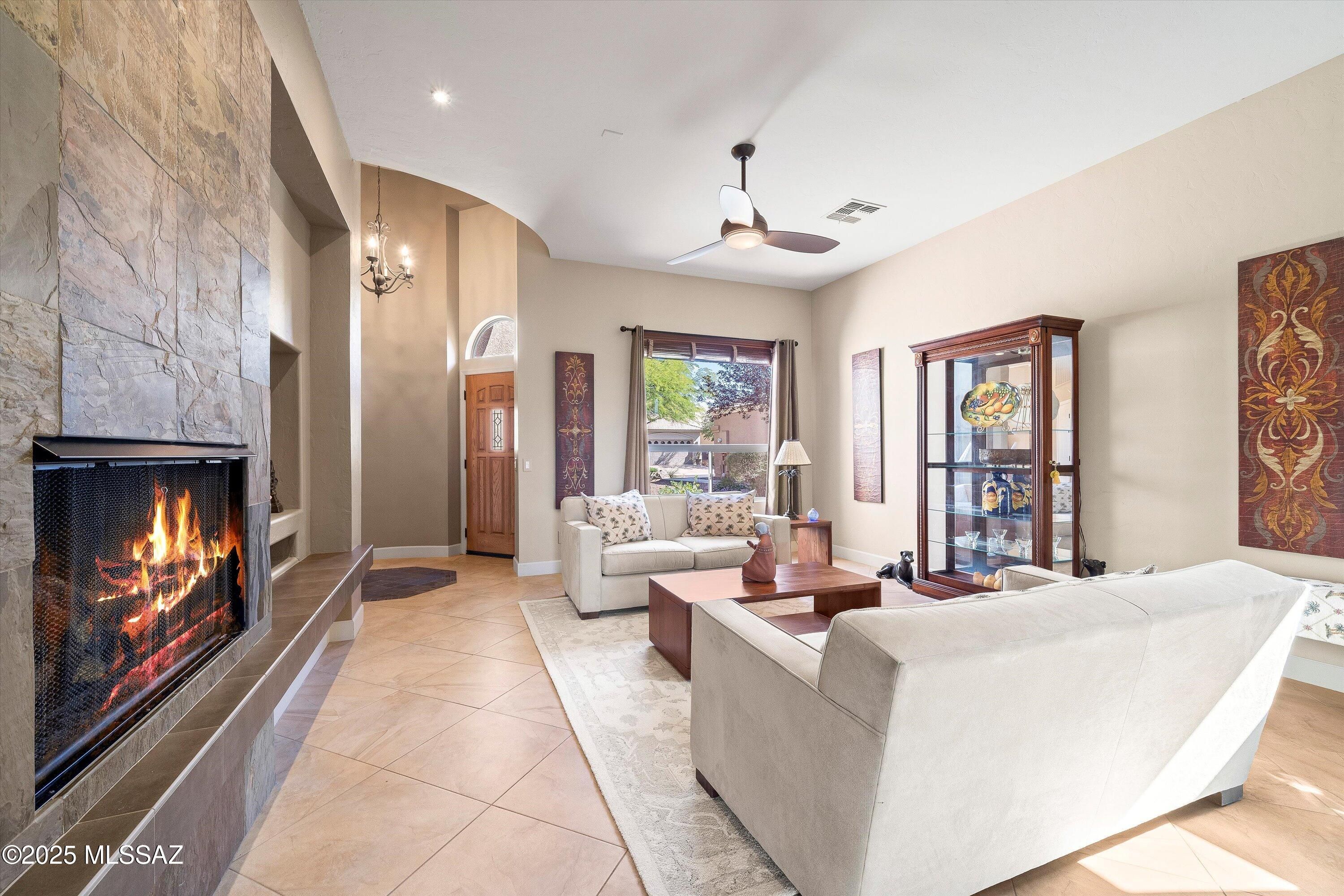 Catalina Mountain views from this gorgeous Verona model Villa. Designer touches include a slate gas fireplace, porcelain tile, kitchen with granite counters, ss appliances included. Large picture windows with built in UV protection flood the kitchen and breakfast nook with natural light. Primary suite has large slider leading to the backyard, remodeled bathroom and custom closet. Guest bedroom features murphy bed. Tranquil outdoor setting with extended brick paver patio, auto sun shade & breathtaking desert and mountain views. Epoxy-finished 2-car garage, sensor lighting, newer HVAC & water heater and whole house filtration system. HOA covers exterior maintenance.Saddlebrooke offers including golf, pickleball, tennis, pools, restaurants, fitness, clubs and more.