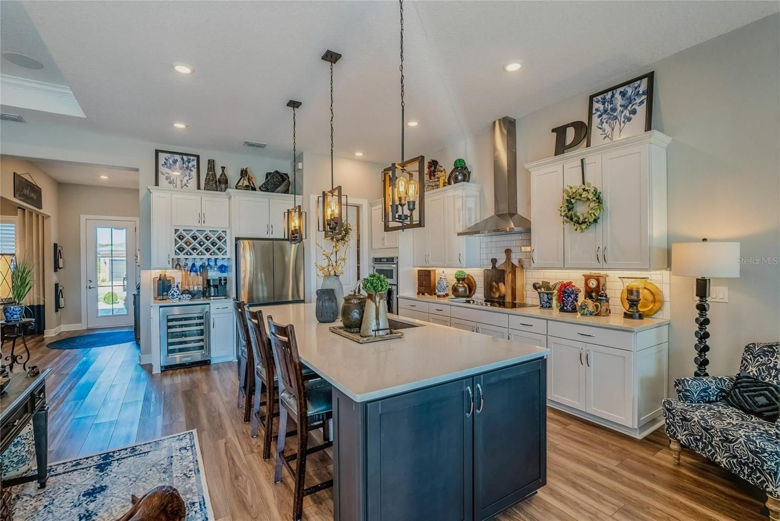 It’s time to embrace retirement in true luxury in this exceptional Stellar model pool home, perfectly positioned with sweeping views of the golf course and tranquil lake in Del Webb Stone Creek. Here, every day feels like a private retreat, where peaceful water vistas and breathtaking sunsets over the fairways become part of your everyday lifestyle. Designed for both elegance and comfort, this 3-bedroom, 3-bathroom residence offers luxury vinyl flooring throughout, with tile in the bathrooms and laundry room for added durability. A glass inset front door welcomes you inside, where tray ceilings in the living room and primary bedroom, added recessed lighting, and designer touches like an accent wall in the living room and shiplap feature wall in the bedroom create warmth and sophistication. At the heart of the home, the gourmet kitchen is a true showpiece, featuring quartz countertops, stainless steel appliances, pendant lighting, soft-close cabinetry with crown molding, and a built-in dry bar perfect for entertaining. Zero-corner sliders open completely to the screened lanai, seamlessly blending indoor and outdoor living. Step outside to your private oasis — a sparkling pool with screen enclosure, outdoor kitchen, and sunshade for added privacy, all overlooking the stunning golf and lake views. Whether hosting friends or enjoying a quiet morning coffee, this space is designed to impress. The primary suite offers a spa-inspired retreat with a zero-entry walk-in shower, while the second and third bathrooms feature beautifully tiled showers. Additional highlights include an extended 3-car garage, a convenient drop zone off the garage, laundry room with cabinets and utility sink, water softener system, plantation shutters, Cheyenne interior doors, paver driveway and entry, and custom landscaping that completes the home’s exceptional curb appeal. This is more than a home — it’s the elevated, resort-style lifestyle you’ve been waiting for.