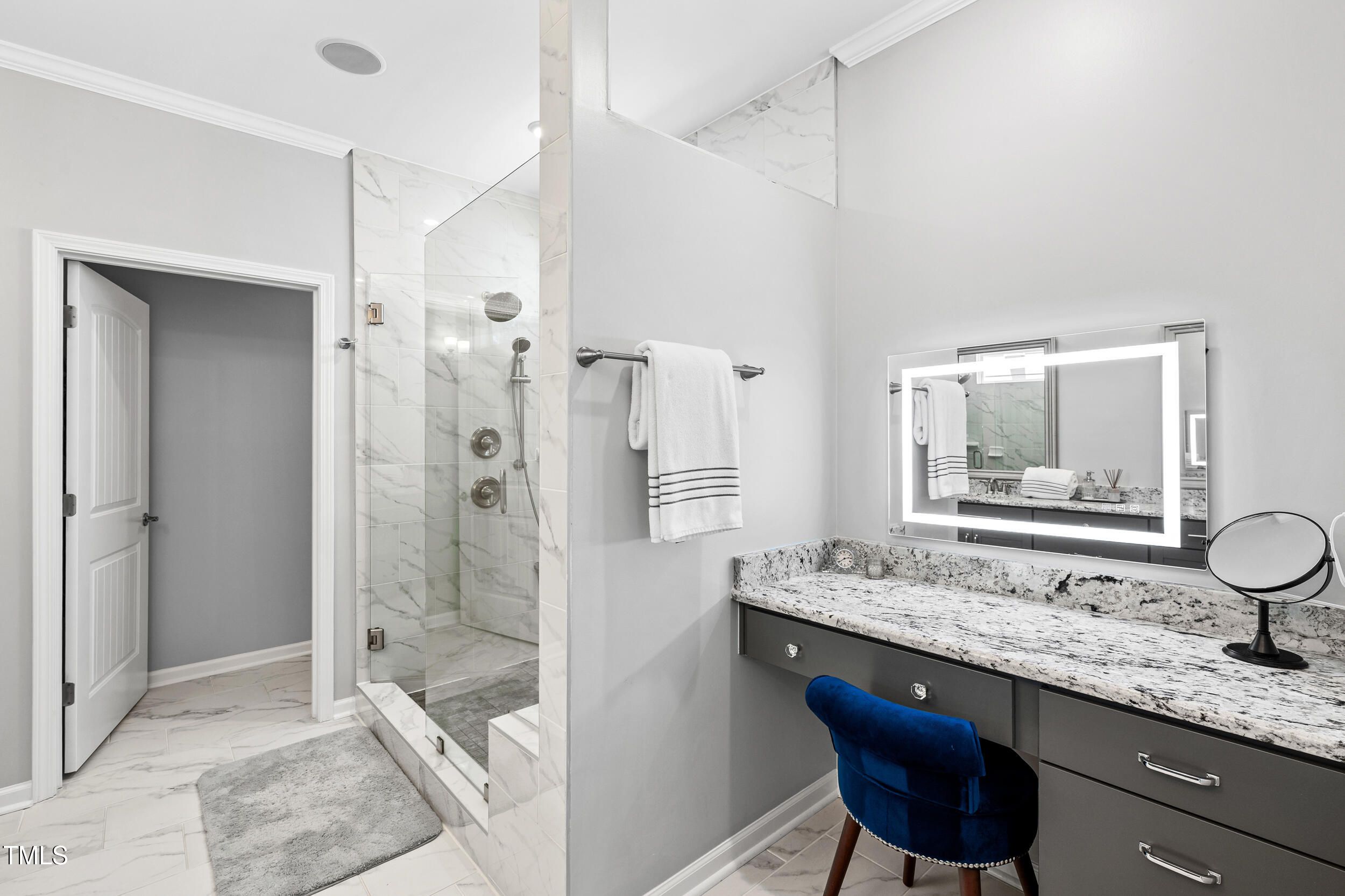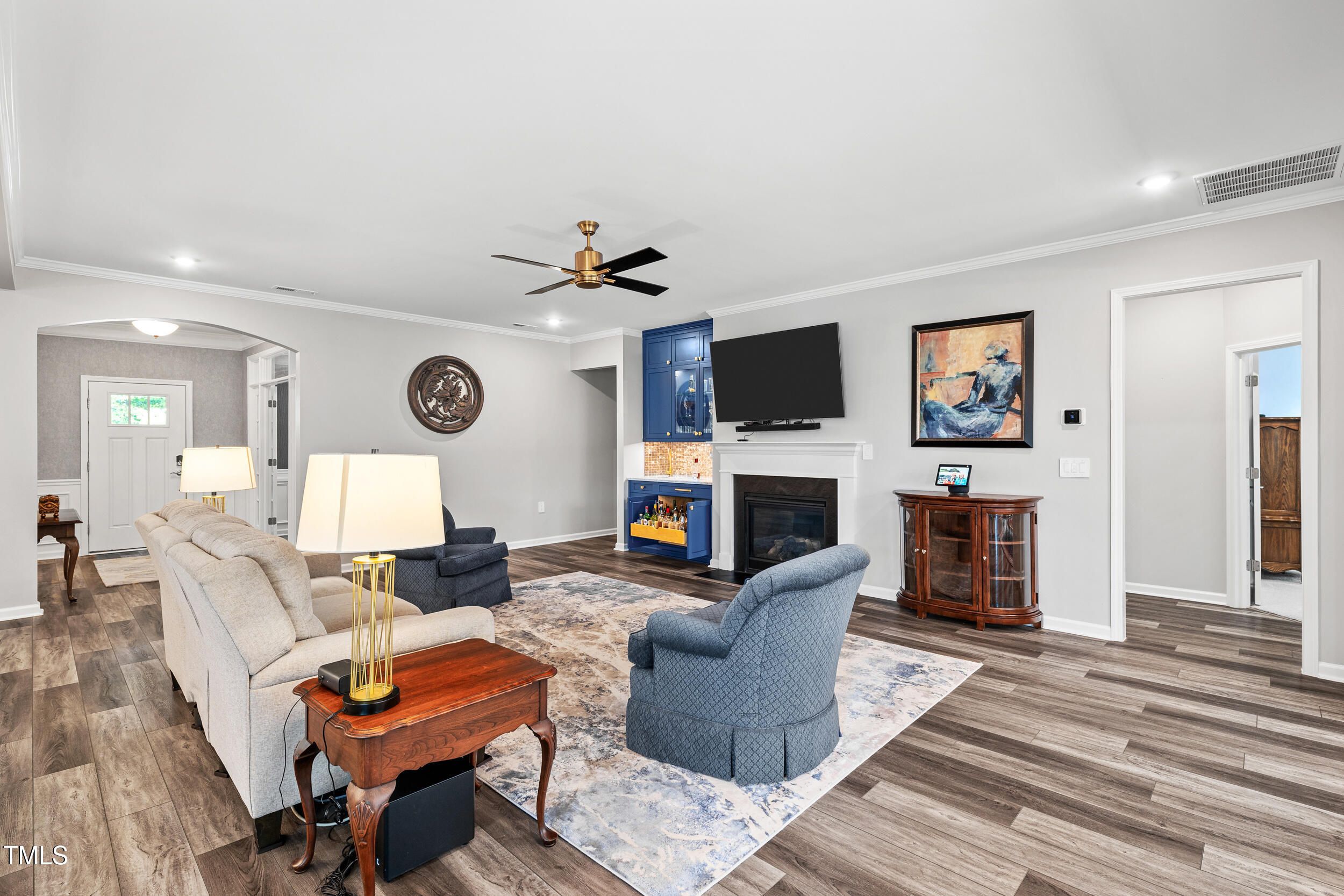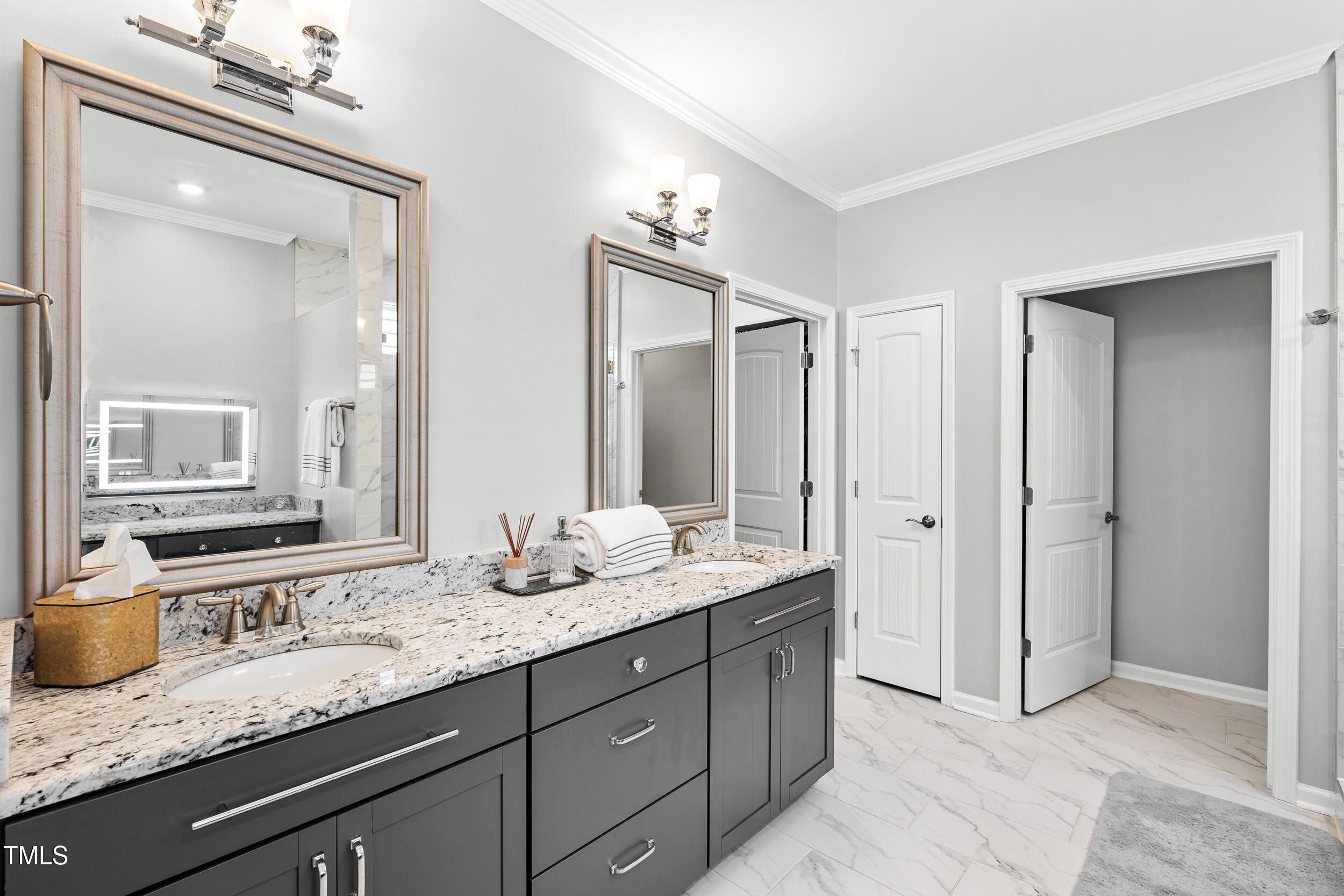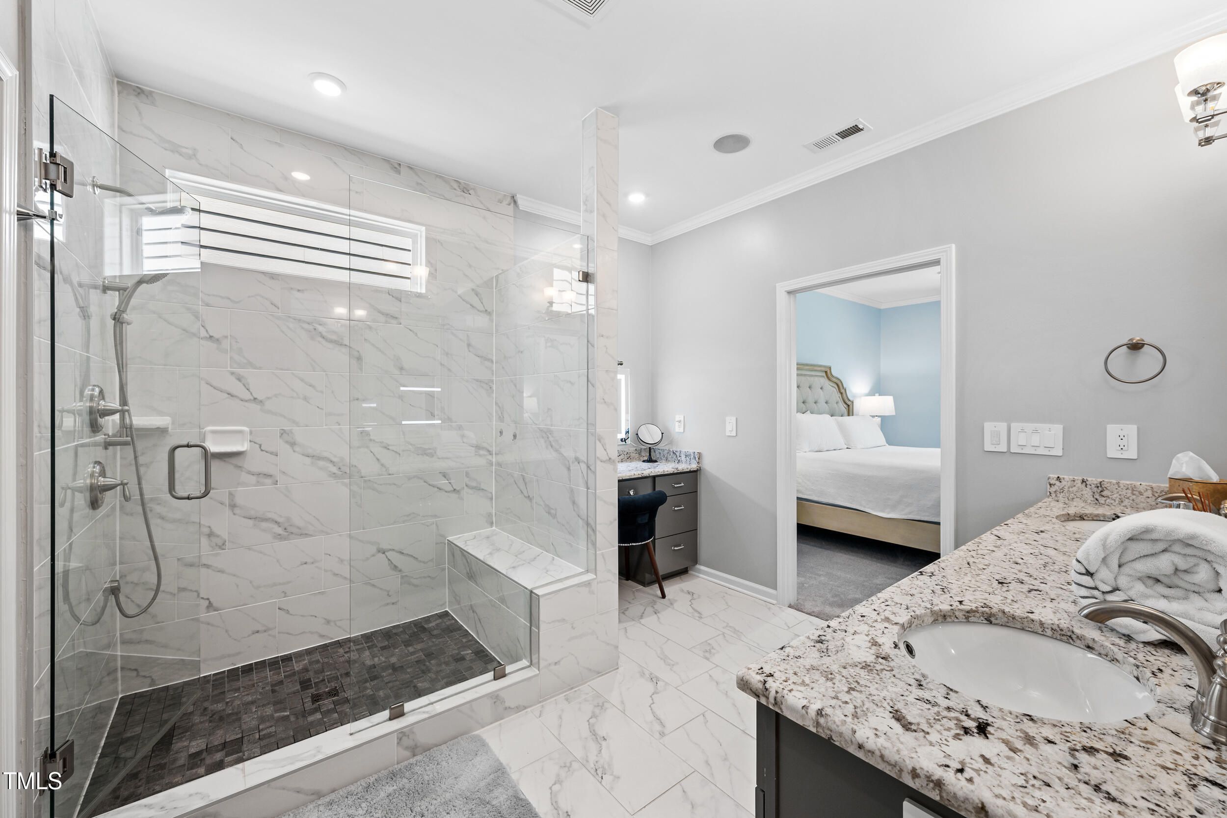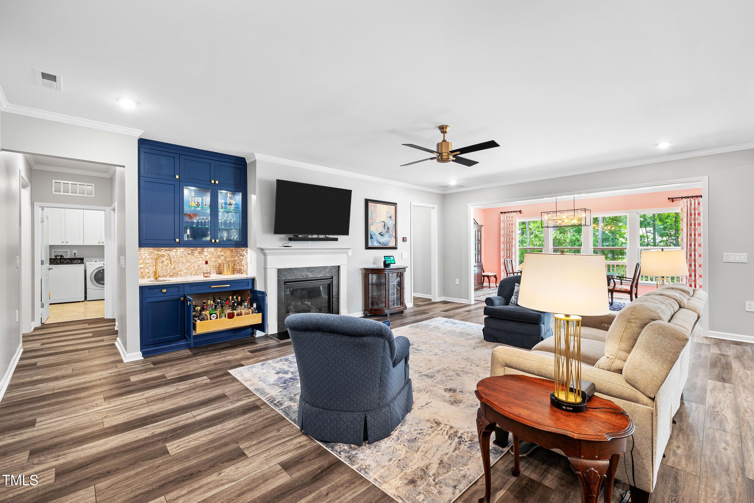 - Bar, Tub Shower, Bookcases, Crown Molding, Double Vanity, Eat-in Kitchen, Granite Counters, Kitchen Island, Open Floorplan, Pantry, Separate Shower, Walk-In Closet(s), Wet Bar