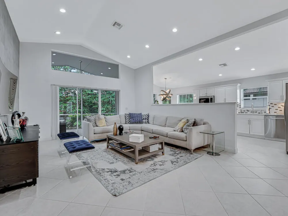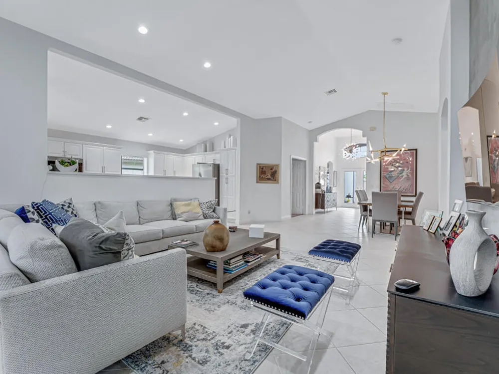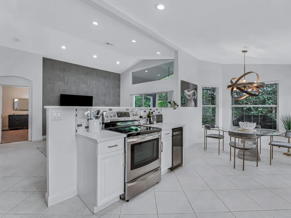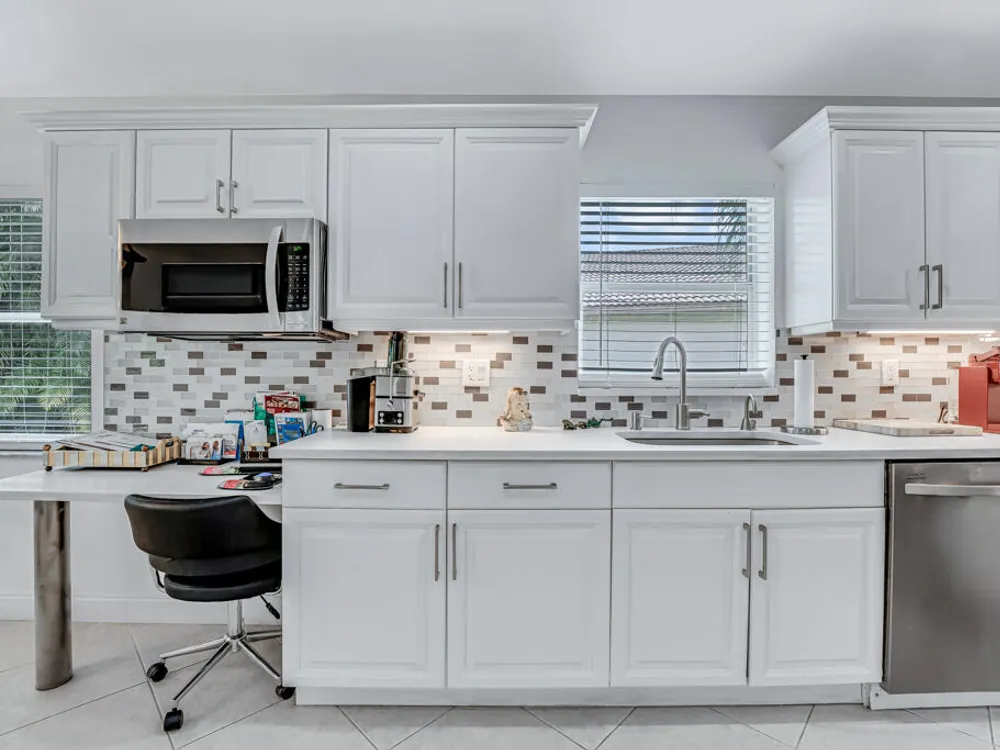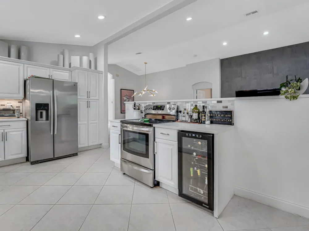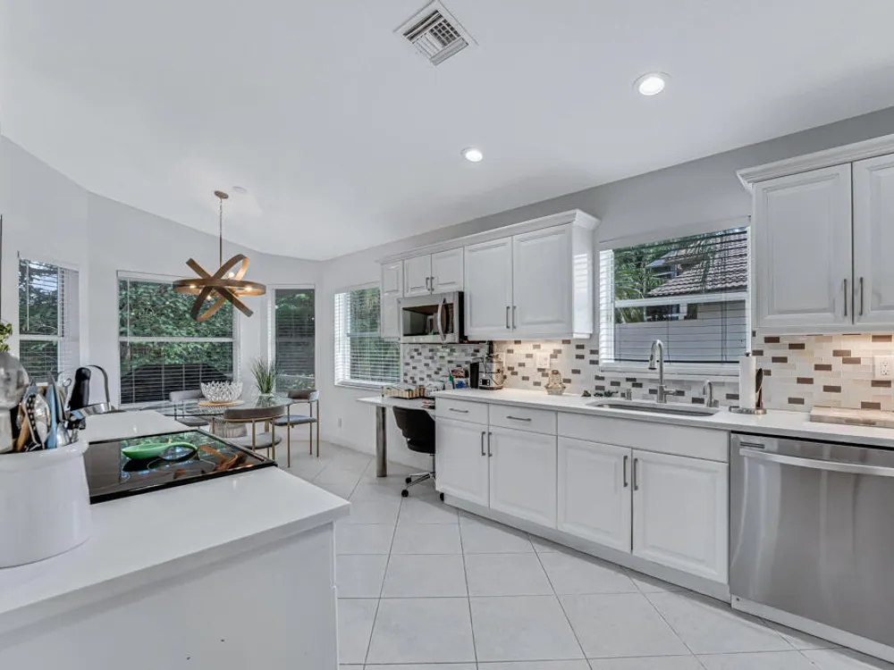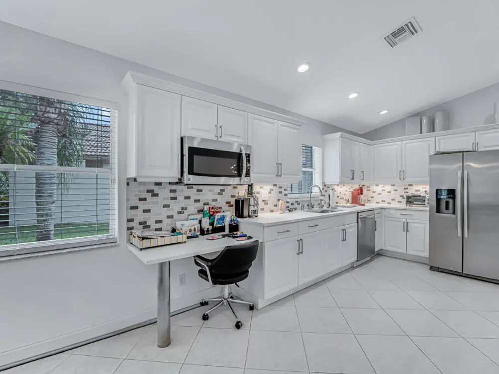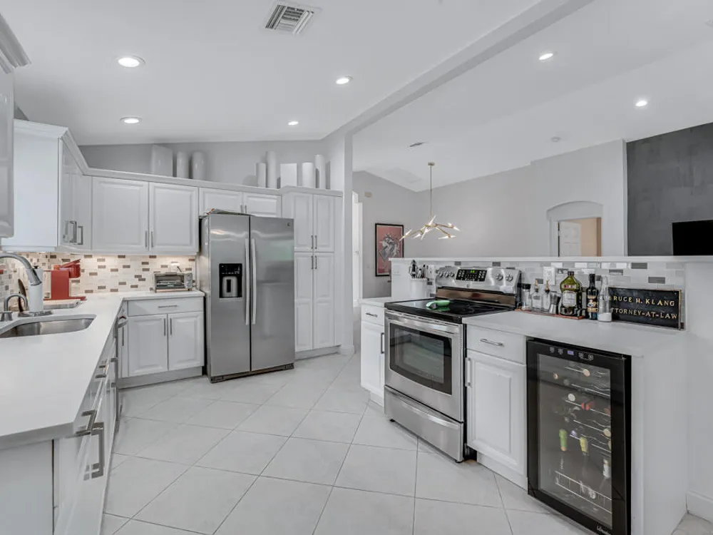 Amazing open concept home with wall down creating an open airy upgraded floorplan like none other in this prestigious highly active Community! Enter through double glass entry doors, enjoy white cabinetry, quartz counters stainless appliances,lots of upgrades,beautiful floors, this home shows like a model! WONDERFUL LOCATION! WALK TO CLUBHOUSE,restaurant, pickleball, tennis , pools enjoy indoor pool also!ALL in walking distance! Lovely remodeled white kitchen,wall down & open floorpan make this a must see! Move in ready, ask about the furniture too! Full state of art fitness, shows, organizations,card rooms,arts & crafts, so much to do! Restaurant at the pool is amazing with indoor/outdoor dining! Newer 2023 A/C, IDEALLY LOCATED NEAR CLUBHOUSE! Enjoy Bellaggio 55+ ACIVE life! LOVE IT!