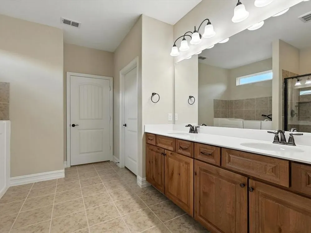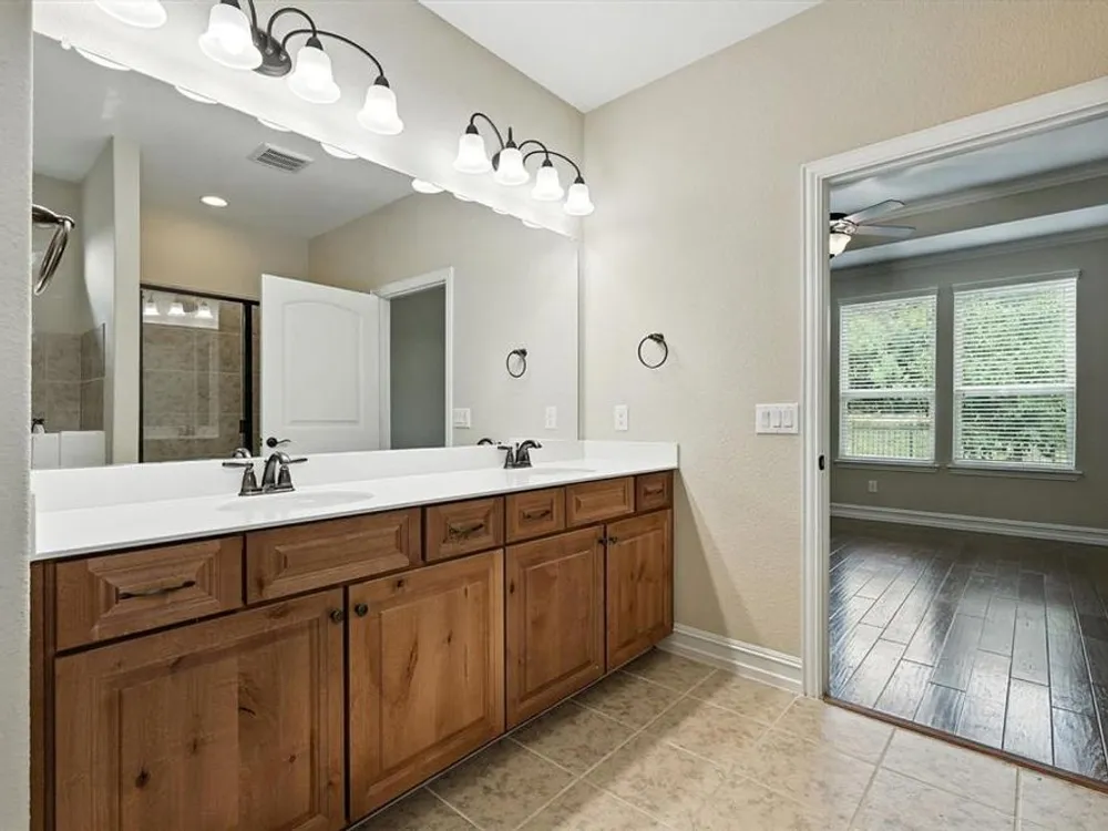Stunning Sonoma Cove Plan backs up to a Nature Preserve and a championship Golf Course in the sought after 55+ community of Frisco Lakes. This beautiful single story home offers a popular floor plan with 2 Primary Bedrooms with Ensuite Bathrooms and Walk in Closets. Besides the large Living Room there is a another Living Area with built in cabinets. The walk in closet in the main Primary Suite has access to the Utility Room. There is a Powder Room for guests to use. The kitchen boasts easy to maintain tile flooring, a gas range with a gas cooktop, ample cabinet and counter space, pull out cabinet drawers, walk in pantry and a large Kitchen Island. The dining room has chair railing and picture frame molding. The office is located at the front of the home for privacy. The extended patio is covered and has a built in kitchen and sun screens for privacy. This community boasts an array of amenities designed to enrich your lifestyle, including scenic walking paths, picturesque ponds, pickleball courts and a pristine golf course. Immerse yourself in the vibrant social scene at the amenity center where endless opportunities for recreation and camaraderie await.