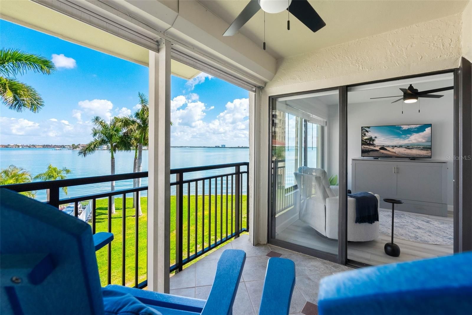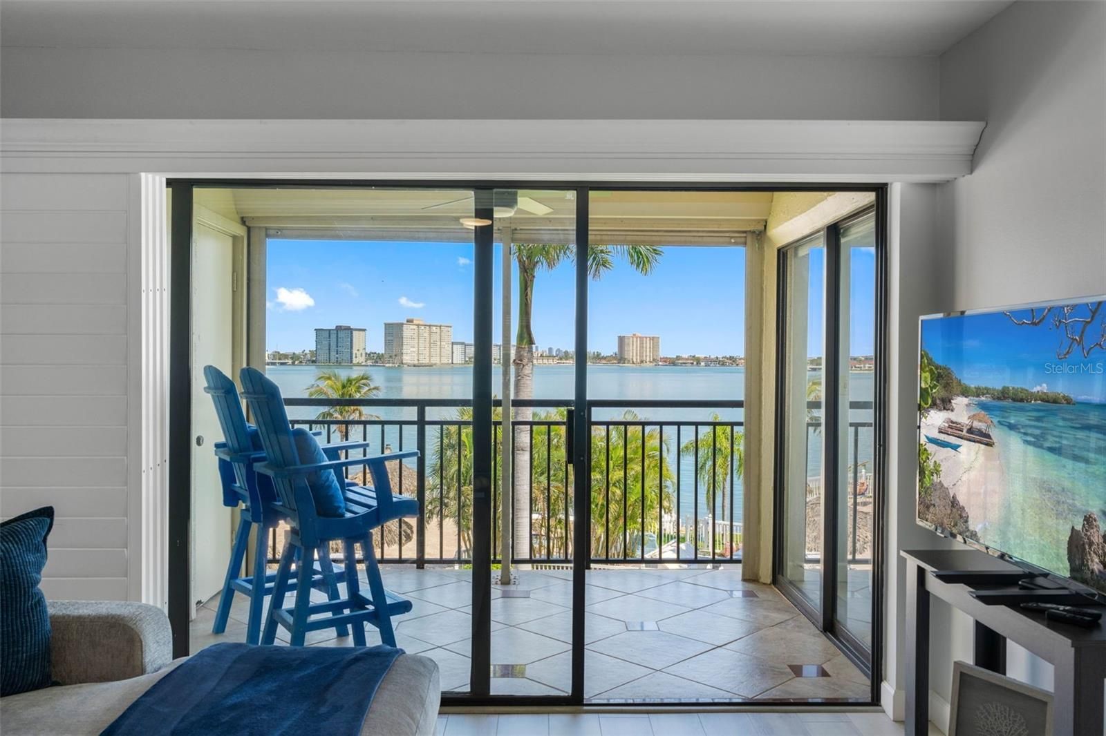 WATERFRONT CORNER CONDO WITH PANORAMIC WATER VIEWS ON THE ISLAND OF ISLA DEL SOL. Welcome to ISLAND LIFE in this TURN-KEY, FULLY FURNISHED updated coastal retreat located in the beautiful waterfront community of Palma Del Mar. This desirable corner residence offers sweeping PANORAMIC WATER VIEWS from every room, creating a light-filled coastal escape perfect as a primary residence, second home getaway, or investment opportunity. Located on the peaceful yet vibrant island community of Isla Del Sol — surrounded by Tampa Bay and the Intracoastal waterways leading to the Gulf — Palma Del Mar is known for its beautifully maintained tropical grounds, orchids growing in the trees, blooming hibiscus, and lush manicured landscaping. The community offers a true RESORT-STYLE atmosphere with waterfront walking paths, swaying palms, and tranquil bay views. Step inside and you are immediately greeted by breathtaking water views and natural light. The open living and dining areas flow seamlessly to the private waterfront balcony where you can relax and enjoy sailboats gliding across the bay, dolphins putting on a morning show, and manatees cruising near the fishing pier. Nature lovers will enjoy spotting pelicans diving for lunch, pink roseate spoonbills, and other coastal shore birds. At low tide, residents often enjoy shelling along the small white sand beach just outside the community, or launching a kayak from the community launch to explore the surrounding waterways. Inside you’ll find a light, modern interior featuring an upgraded kitchen with polished black granite countertops, stainless appliances, and a sleek coastal glass tile backsplash. Light cabinetry with updated hardware and a spacious breakfast bar pass-through open to the dining and living areas, making entertaining easy while enjoying the water views. The home features smooth ceilings, new moldings and baseboards, and upgraded wood-plank luxury vinyl flooring for durability and coastal style. Plantation shutters are installed in every room, AND electric hurricane shutters protect the bedrooms and balcony. The primary bedroom offers beautiful water views from the bed, TWO CLOSETS for generous storage, and an ensuite bathroom. A laundry room includes a stackable washer and dryer with space to accommodate full-size units if desired. Covered parking and private storage convey with the unit. Residents enjoy resort-style amenities including a heated waterfront pool, spa, hot tub, fishing pier, kayak storage, and the PALMA V CLUBHOUSE with library, billiards, and social gathering space. Optional membership to the Isla Del Sol Yacht & Country Club provides access to an 18-hole championship golf course, tennis courts, marina, waterfront pool, and recently remodeled restaurants and pool bar. Bike over the scenic Bayway Bridge to Pass-A-Grille and the Don Cesar Resort on the sugar sand beaches of St Pete Beach or explore nearby Fort De Soto Park and vibrant downtown St Petersburg with museums, The Pier, sports venues, waterfront restaurants, and miles of scenic parks just minutes away — where every day feels like vacation. Schedule your private showing today and experience why residents say they live in paradise.