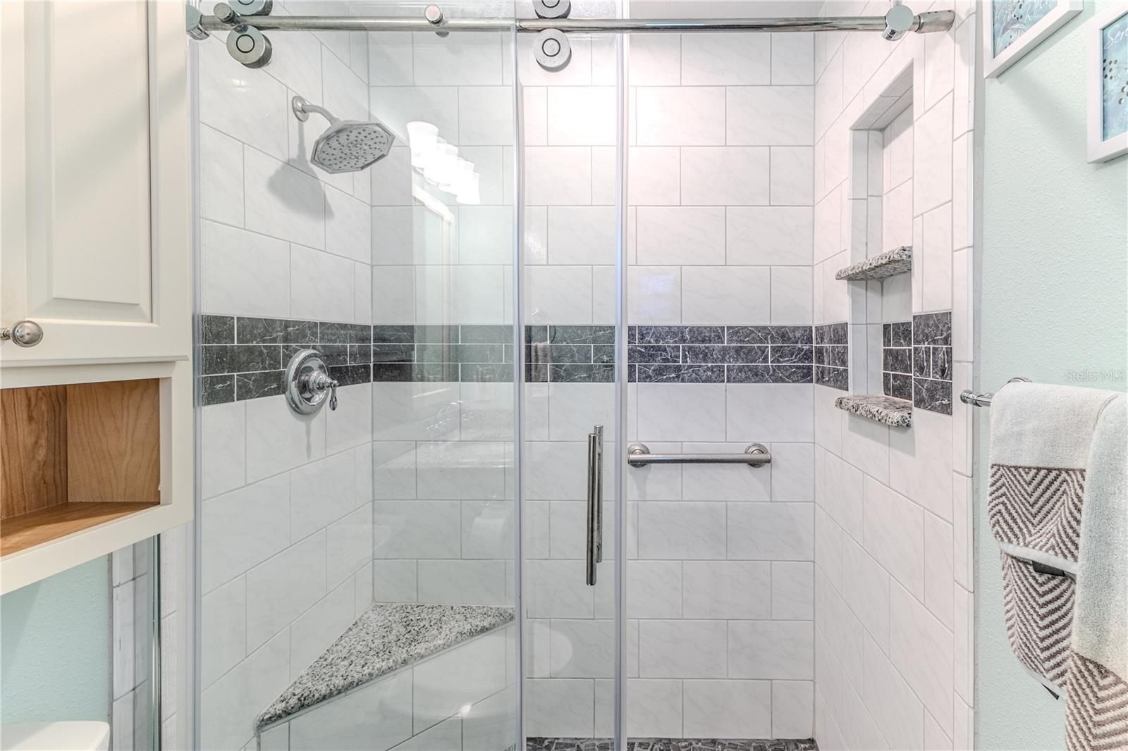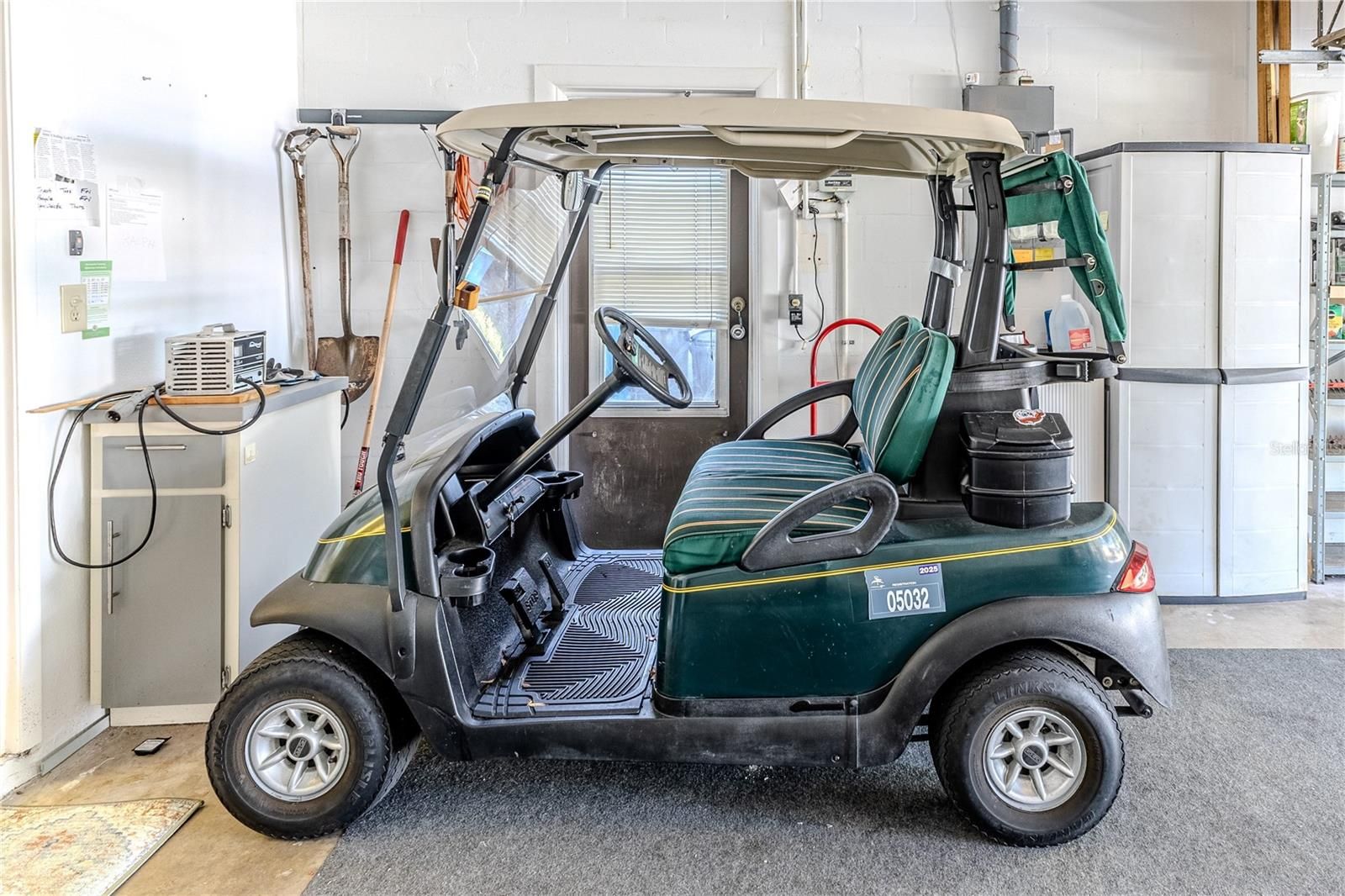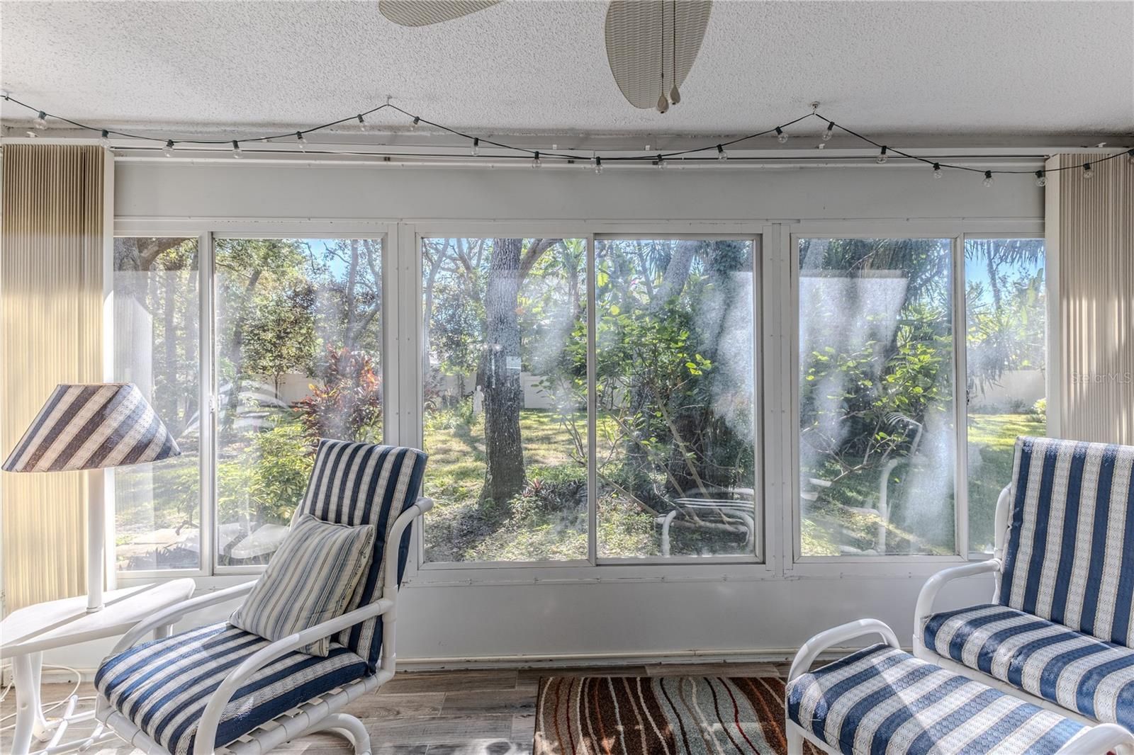 Discover this beautifully maintained 2-bedroom, 2-bathroom, 2-car garage home that perfectly blends comfort, character, and Florida living. From the moment you arrive, you'll love the inviting front porch with a ceiling fan—the ideal spot to relax, enjoy a breeze, and greet friendly neighbors. Step inside to a bright, open living and dining area featuring a bay window, solar tube, ceiling fan, and soft carpet underfoot. The dining room flows seamlessly into the kitchen, where you'll find granite countertops, a stainless steel double sink, pantry, and an eat-in space overlooking the lanai. Laminate wood-look flooring and a ceiling fan complete this kitchen that's both functional and welcoming. The enclosed lanai is perfect for year-round enjoyment, featuring wood-look tile flooring, a ceiling fan, and tranquil garden views. Step outside to the paver patio surrounded by lush gardens, mature landscaping, and vibrant plants—a private outdoor retreat that's simply gorgeous. The spacious primary bedroom offers two closets, a ceiling fan, and an updated en suite bathroom with a modern vanity, tile flooring, walk-in shower, and pocket door. The guest bedroom is equally inviting, featuring a large closet and a cozy nook that's perfect for a home office or reading space. The guest bathroom has been beautifully updated with new tile, vanity, toilet, and tub, and a convenient linen closet in the hall adds extra storage. Important updates include a new roof (2019), new windows (2016), and a new HVAC system (2023), Fridge (2025) garage door opener (2025) giving you peace of mind for years to come. This home is being sold furnished, and even includes a golf cart—just bring your suitcase and start enjoying the lifestyle you deserve! Located in Timber Pines, an award-winning, guard-gated, 55+ deed-restricted community, residents enjoy three 18-hole golf courses, a 9-hole pitch & putt, tennis, 12 pickleball courts, two community swimming pools, a country club restaurant and bar, fitness center, billiards, performing arts center, woodworking shop, and over 100 social clubs and activities. Lovingly cared for and move-in ready, this home offers the perfect blend of style, comfort, and Florida charm. Schedule your in person showing today and fall in love with this delightful home and it's beautiful park-like setting.