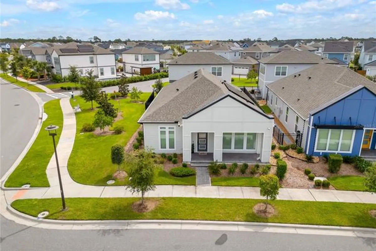 Fall in love with this stunning modern 4 bedrooms, office/den and 3.5 bathroom home. The main home features 3-bedroom, 2.5-bath single-story home and a 750 sq ft detached 1-bedroom, 1-bath garage apartment, all nestled in the community of Weslyn Park at Sunbridge. The main house offers just under 2,100 sq. ft. of thoughtfully designed living space with high ceilings, beautiful tile flooring, and modern neutral paint throughout. The open floor plan includes a versatile bonus room ideal for an office, study, or guest suite, and a gourmet kitchen equipped with quartz countertops, stainless steel appliances, a large center island with a sink and breakfast bar, and ample upgraded kitchen cabinets. The spacious family room features a tray ceiling and seamlessly connects to the kitchen and opens to a covered back patio. The private primary suite is located at the rear of the home and features a, large walk-in closet, and a luxurious ensuite bath with dual vanities and a large shower. Sunbridge is a community founded on the idea that spending time in nature is more than an every-once-in-a-while luxury. It’s an everyday essential. What’s coming to life here is more than just beautiful new homes. It’s also workplaces. Eateries. Parks and pools. Shops and schools. And one more ingredient: an awe-inspiring, life-changing abundance of Florida nature. Two additional bedrooms share a full hall bath. At the back of the property, enjoy the paved covered pergola with an electric screen, and a detached 3-car garage, which includes a second-floor garage apartment. This charming 1-bedroom, 1-bath apartment boasts, an open-concept living space, granite countertops, stainless steel appliances, a kitchen island with breakfast bar, a spacious bedroom with closet, and a full bathroom with shower and laundry closet with washer and dryer—ideal for guests, extended family, or rental income.