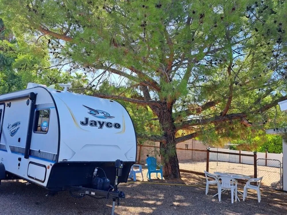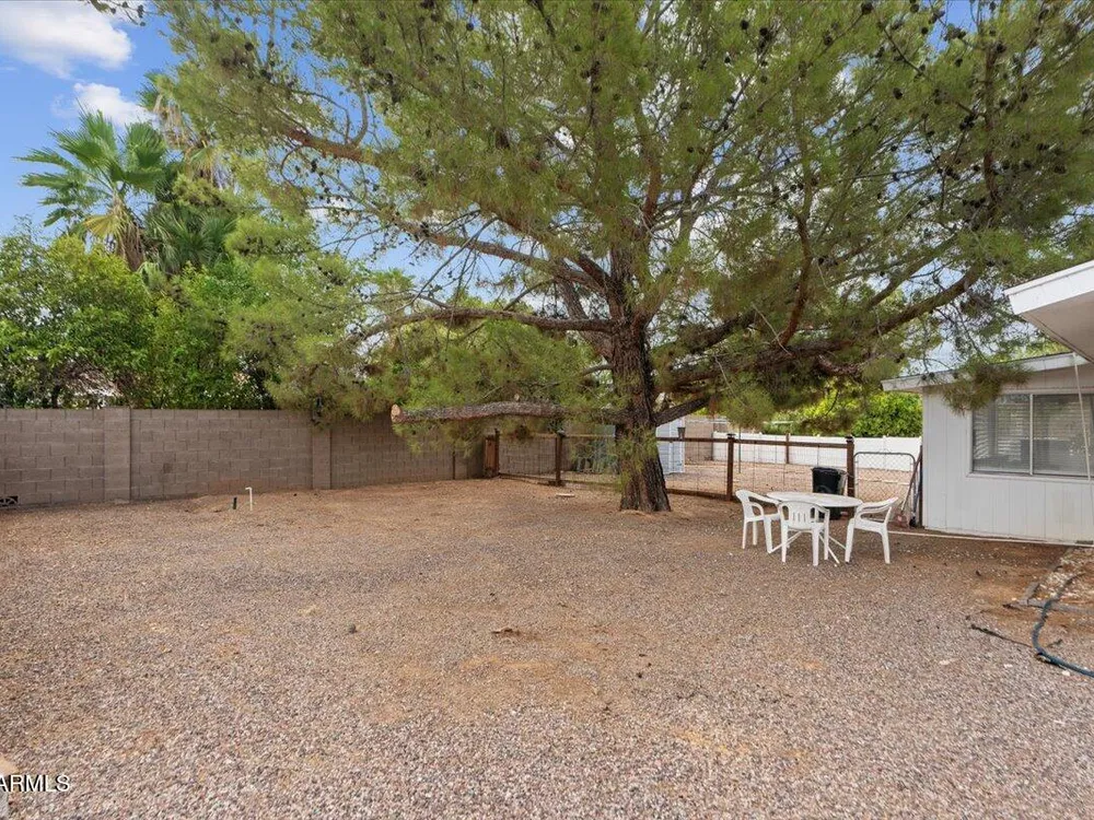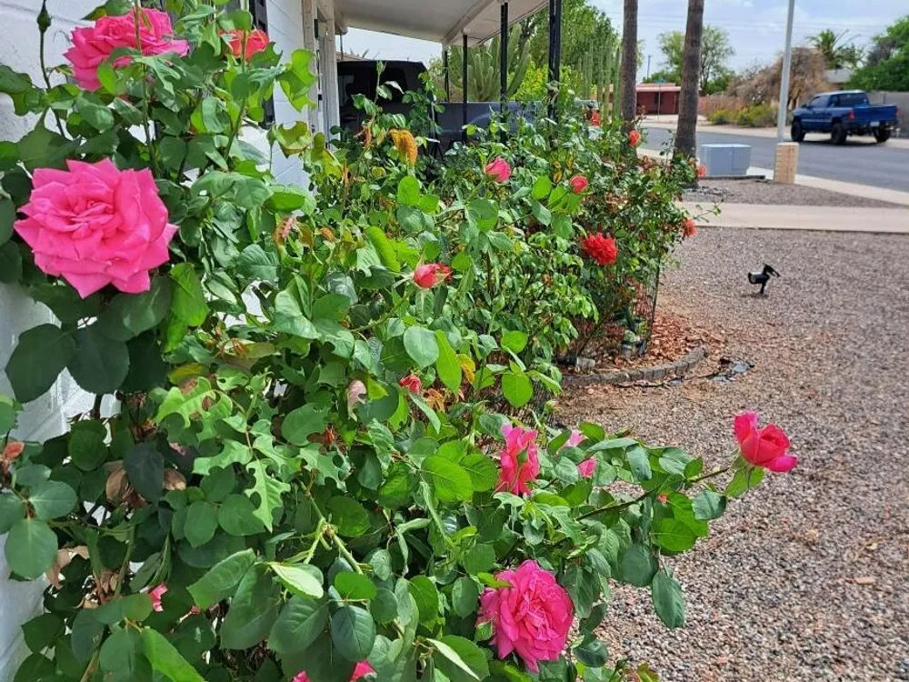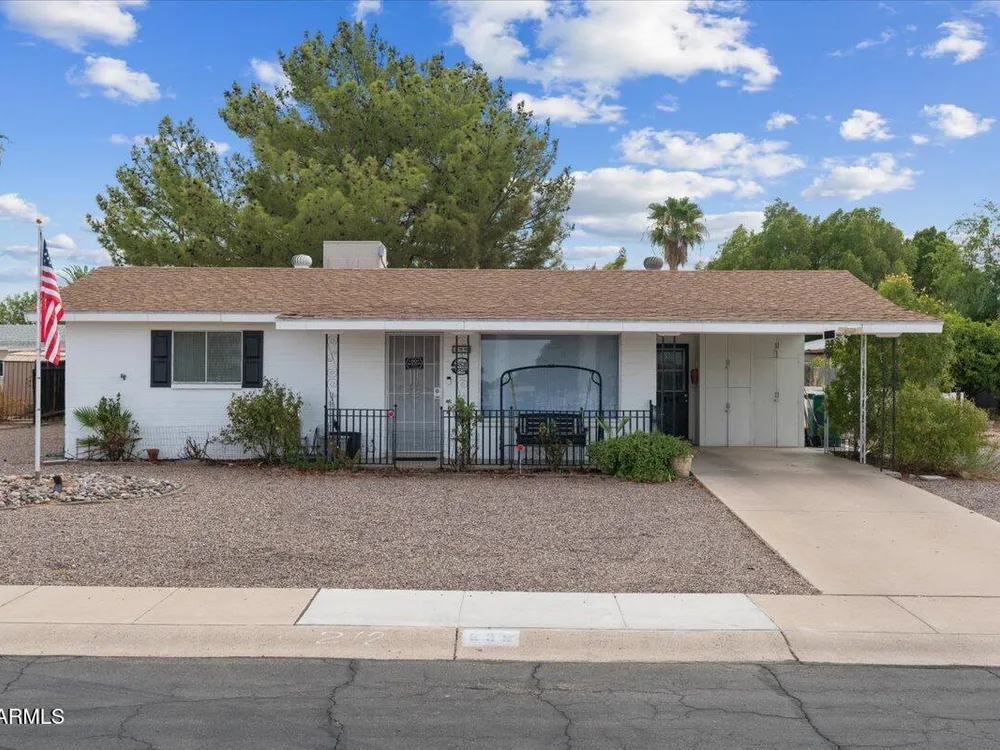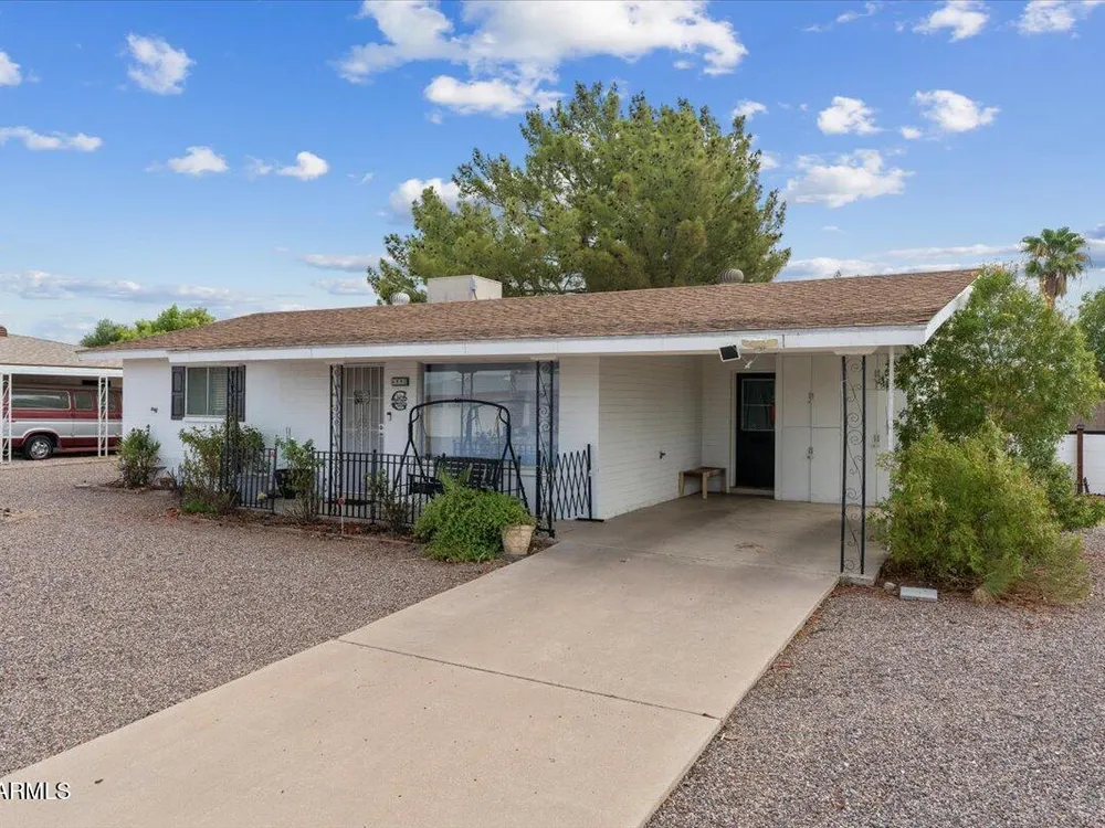 This home will wow you! Turn key home with RV hookup (both water and sewer hookup!), This home is just waiting for you to move in and enjoy the many upgrades including easy to maintain vinyl plank floors throughout most of the home, new living room fan, fresh paint, updated bathroom and kitchen with upgraded stainless steel appliances! The yard is a sanctuary with a huge pine tree providing abundant shade a bounty of gorgeous roses and flowers beckon you home. Pet friendly fencing and patio to keep your fur family safe. Enjoy the enclosed, air conditioned or easy breezy Arizona room which can be used as a third bedroom. This active adult community will keep you hopping with events, pickleball, tennis court, heated pool and spa and so much more with optional HOA.