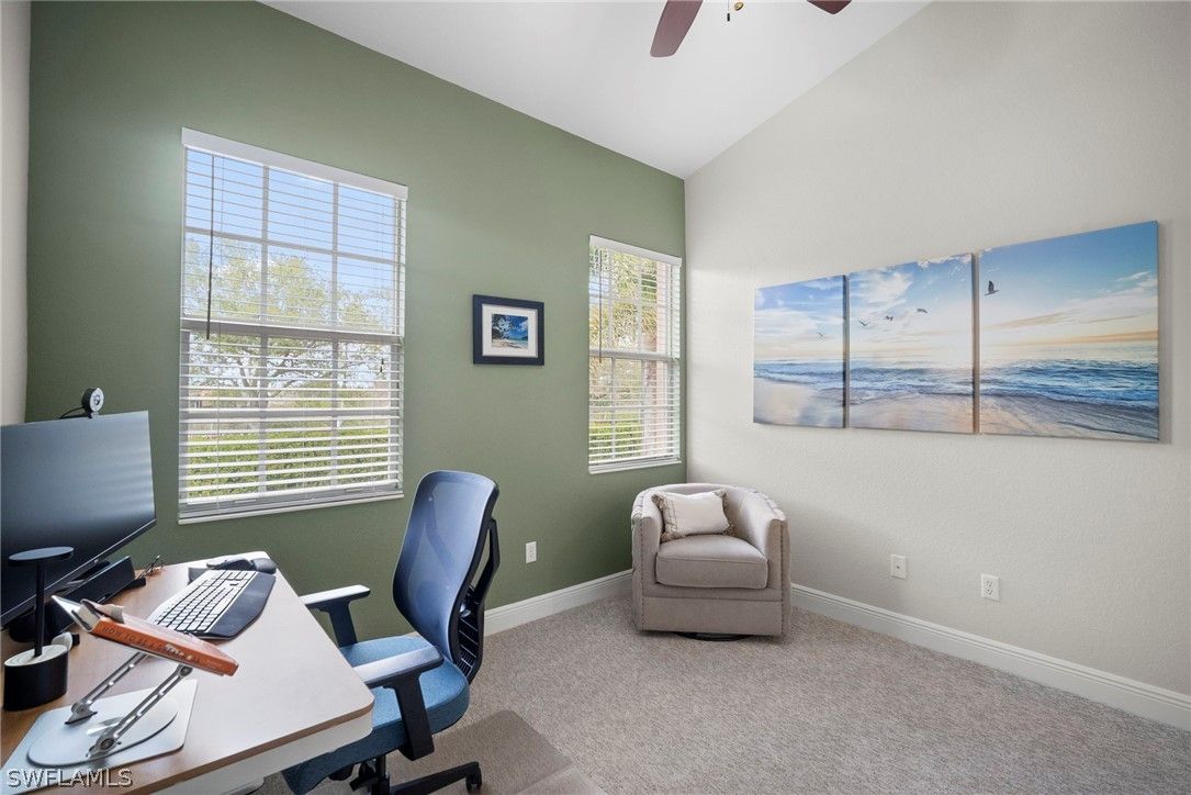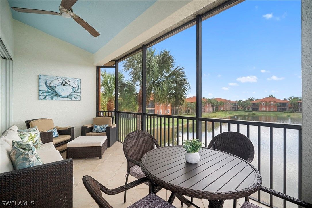 Discover this rarely available 4-bedroom plus den, 3-bath second-floor Coach Home in the gated community of Lely Resort, located in the desirable Legacy neighborhood. Offering 2,686 square feet of living space, this residence lives like a single-family home with the ease of condominium ownership. The flexible floor plan includes a true fourth bedroom and separate den—ideal for a home office or formal dining room. Vaulted ceilings, abundant natural light, and southwest long lake views enhance the spacious feel. A private in-residence elevator provides convenient access from the ground-floor foyer and garage, while hurricane-impact windows and doors offer added protection and peace of mind. The reimagined kitchen features white cabinetry, new quartz countertops, and upgraded appliances, all overlooking the oversized great room that opens to the lanai with tranquil lake and fountain views. Additional features include, newer A/C system and new carpeting in all four bedrooms. The private primary suite offers serene water views and an en-suite bath with split dual vanities, a corner soaking tub, and a walk-in shower. The middle guest bedroom features a pocket door for complete en-suite privacy. Two additional guest bedrooms at the front of the residence offer a double-door entry and access to a full bath—providing comfortable, private retreats for family and visitors alike. Legacy residents enjoy a renovated clubhouse, heated pool, and spa, along with included membership to The Players Club & Spa, featuring resort-style pools, a full-service spa, fitness center, tennis, pickleball, bocce, dining, and a vibrant social calendar. An exceptional opportunity to embrace the best of the Southwest Florida lifestyle.