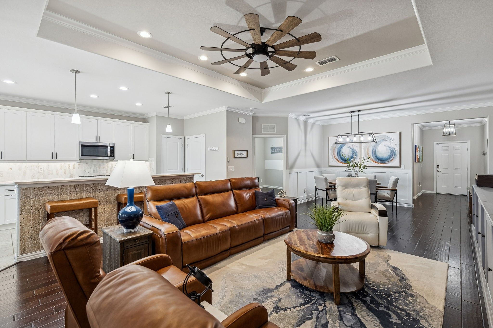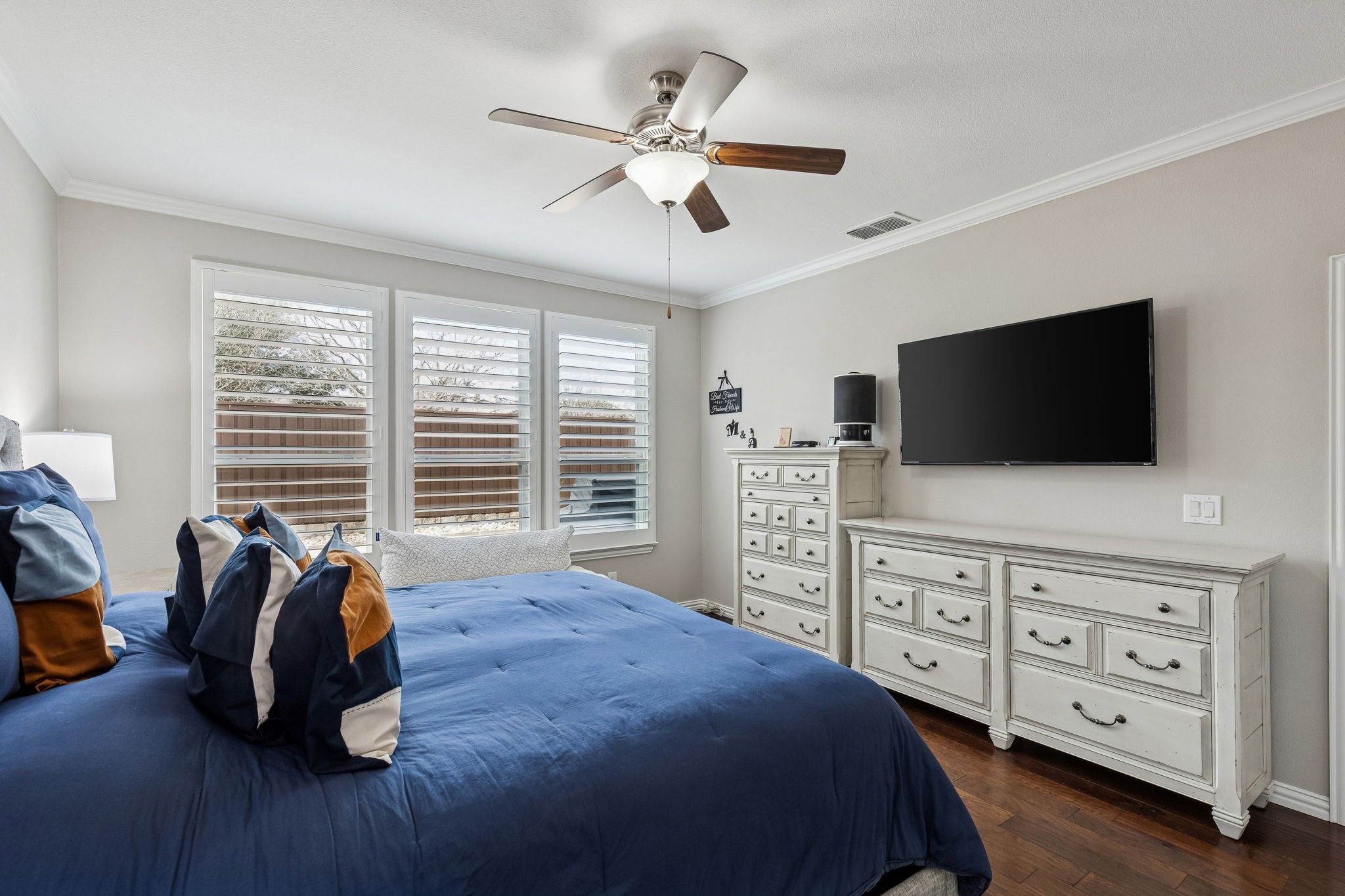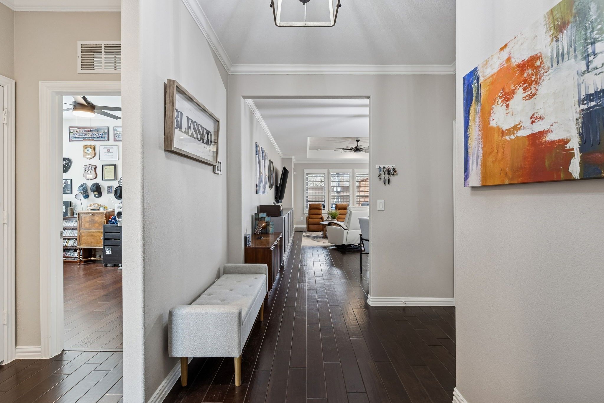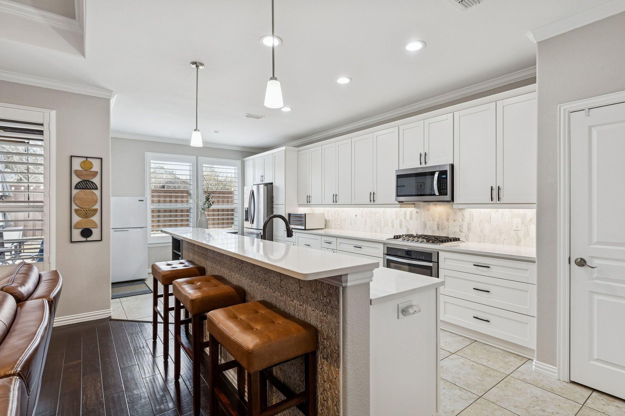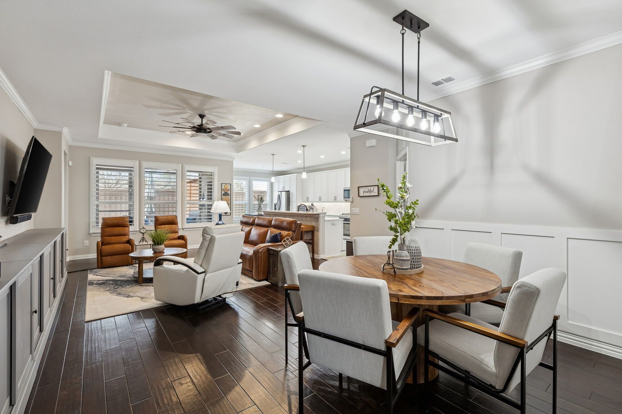 This home offers a beautifully updated blend of comfort, style, & functionality. The striking brick & stone elevation creates inviting curb appeal, complemented by a well-maintained front yard & welcoming covered entry. Inside, you’re greeted an open-concept layout w-rich wood flooring that flows seamlessly through the main living areas. The spacious living rm features a tray ceiling & an abundant natural light, creating a warm yet refined atmosphere. The dining area connects effortlessly to the living space—perfect for both everyday living & entertaining. The kitchen is a true standout, showcasing crisp white cabinetry, sleek hardware, quartz countertops,& a stylish backsplash. A large island w-seating provides ample prep space & serves as a natural gathering spot. SS appliances, modern fixtures, & generous storage complete this highly functional & visually appealing space. The adjacent breakfast nook offers additional flexibility for casual dining. The dedicated home office offers a functional workspace. The spacious primary bed delivers both comfort & style featuring large windows w-plantation shutters & an ensuite bath continues w-dual vanities & an abundant counter space. A soaking tub & separate glass-enclosed shower enhance the spa-like feel, offering both luxury & practicality. 2 Additional good sized beds. Water filtration & whole home generator! The backyard is designed for low-maintenance living & effortless outdoor enjoyment. A spacious stamped concrete patio provides plenty of room for dining, grilling, & relaxing, while the screened-in covered patio offers a comfortable, shaded retreat ideal for year-round use. Decorative privacy panels add both style & separation, creating a cozy, inviting outdoor setting. One of the home’s standout features is its exceptional location just minutes from the lake. Enjoy quick access to scenic views, walking trails, recreation, & outdoor activities, all while benefiting from the comfort of a quiet neighborhood setting.