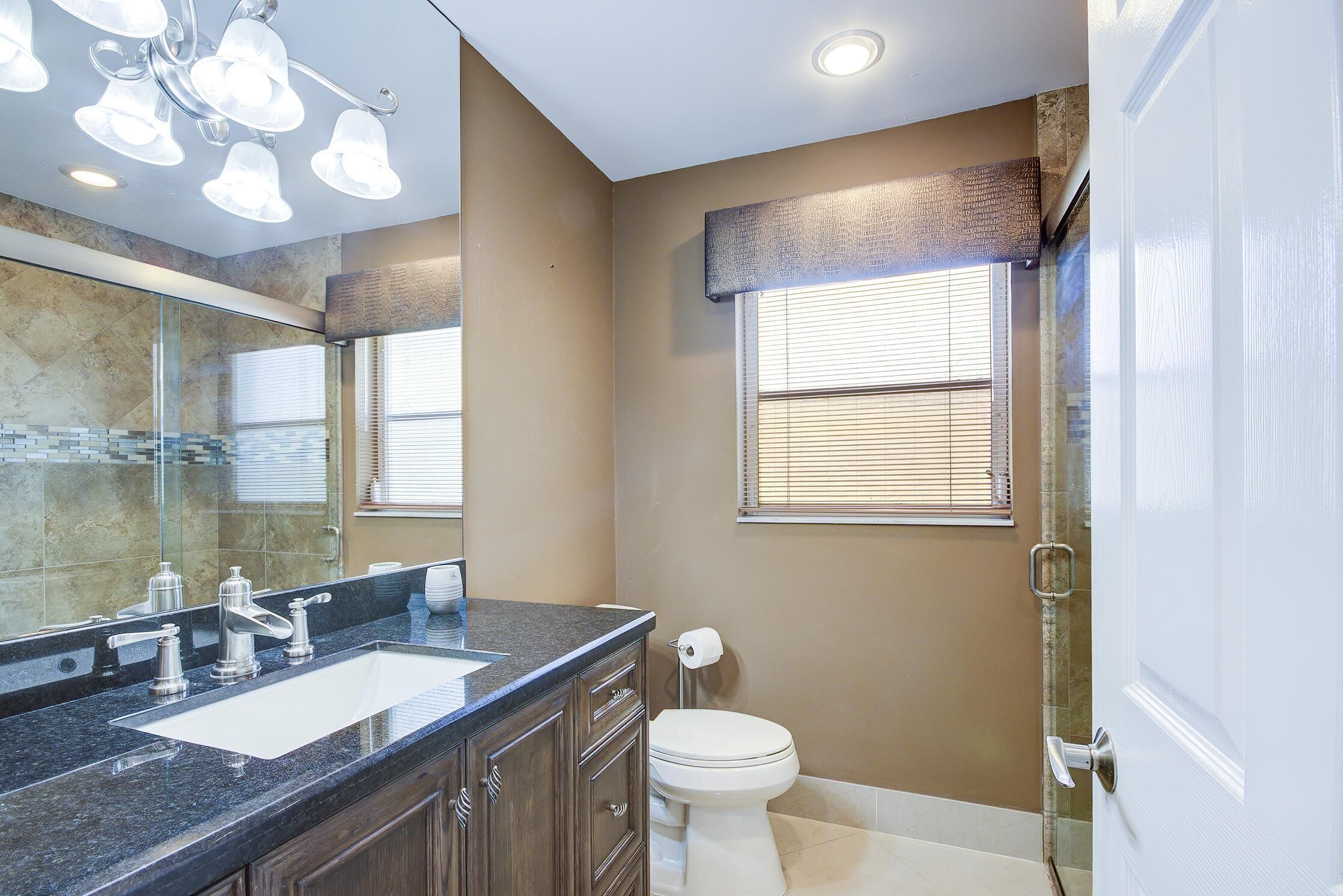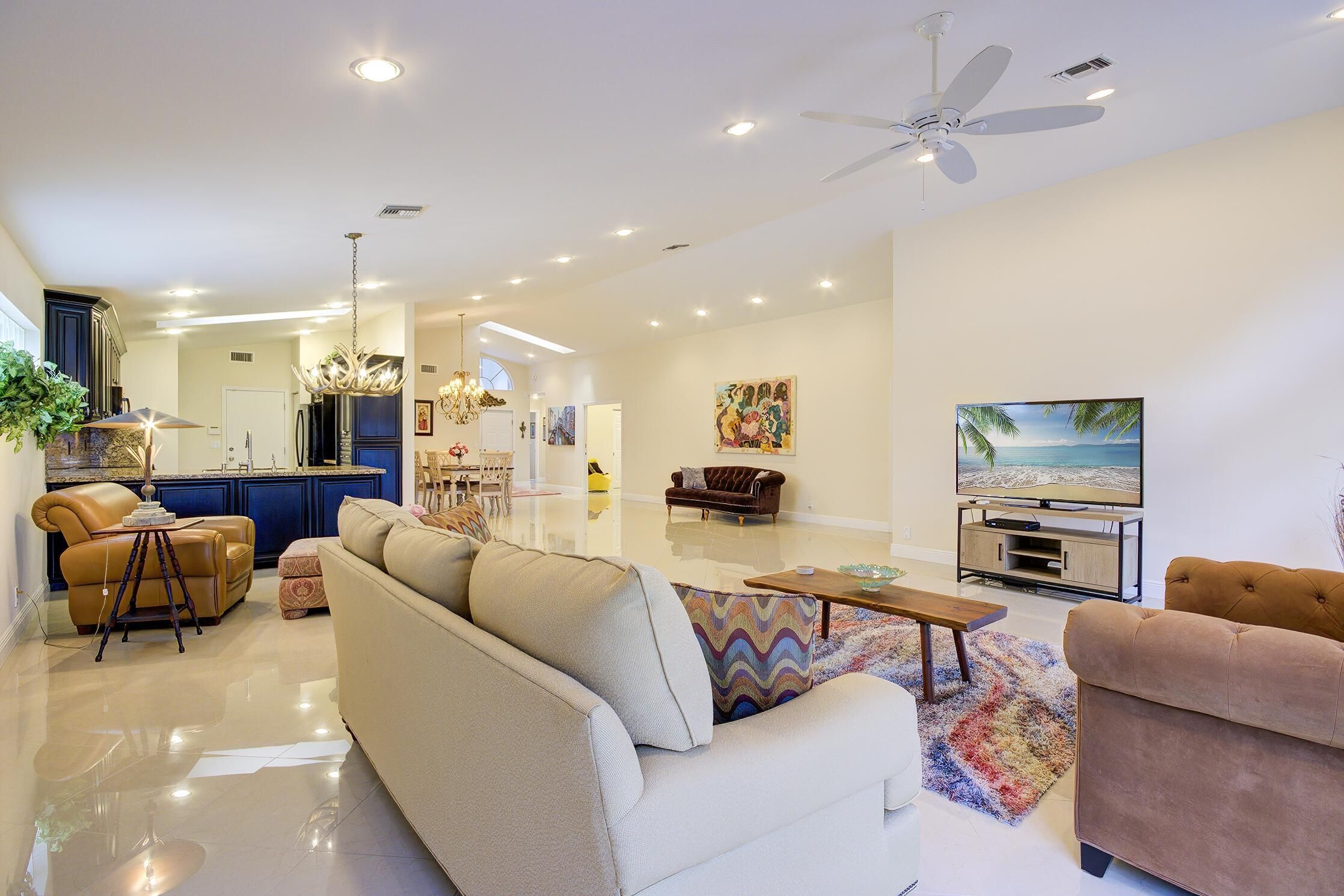 Welcome to this beautifully updated 3-bedroom, 2-bath custom-designed home in the highly desirable active adult living community of Coral Lakes in Boynton Beach. This move-in-ready residence features a brand-new roof and exterior painting (2025). Tasteful, modern renovations throughout create a low-maintenance lifestyle in a resort-style setting. The open-concept layout provides a spacious living and dining area highlighted by elegant chandeliers and abundant natural light. The gourmet kitchen is fully equipped with new appliances, granite countertops, a breakfast bar, and ample cabinetry. Stunning porcelain tile flooring flows through the main living areas, while the two bedrooms feature warm wood flooring. Both bathrooms are stylishly renovated with designer finishes, glass-enclosed showers, granite countertops, and quality cabinetry. The master bathroom is a spa-like suite featuring a soaking tub, bidet, glass-enclosed shower, and two sinks with a large mirror. The master bedroom features two large walk-in closets with a generous storage area. Additional highlights include recessed lighting, ceiling fans throughout, a washer and dryer conveniently located near the kitchen, and a 2-car garage with an automatic opener, utility sink, and storage shelves. Accordion hurricane shutters provide full-home storm protection for added peace of mind. Enjoy outdoor living on the screened patio overlooking the backyard. Coral Lakes is a resort-style community that includes a newly renovated 72,000 sq. ft. clubhouse with a theater, restaurant, fitness center, indoor pool, aerobics studio, card rooms, billiards, and library. Residents enjoy an outside resort-style pool, multiple satellite pools, tennis and pickleball courts, shuffleboard, and an active social lifestyle with on-site dining and lakeview terrace seating. Conveniently located just minutes from Atlantic Avenue dining, shopping, and beautiful nearby beaches, this home presents the perfect blend of comfort, convenience, and Florida resort-style living for seasonal or year-round enjoyment. Option to include existing furniture for a true turnkey opportunity for buyers seeking a fully furnished move-in-ready home. One year of Home Warranty insurance is included.